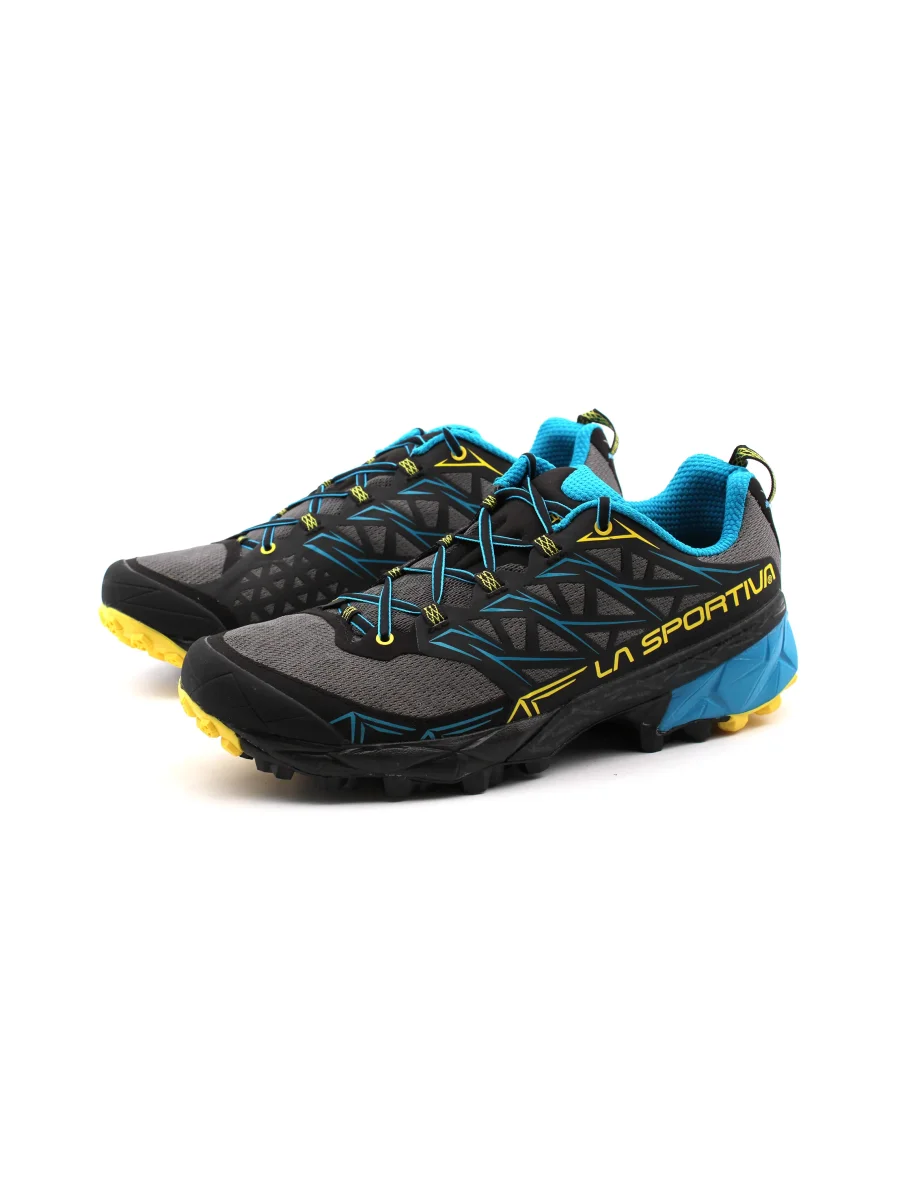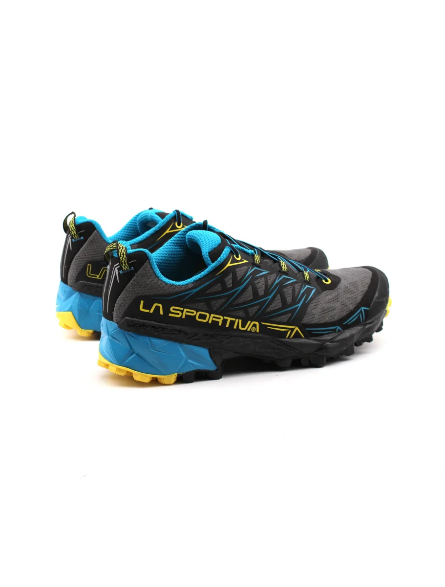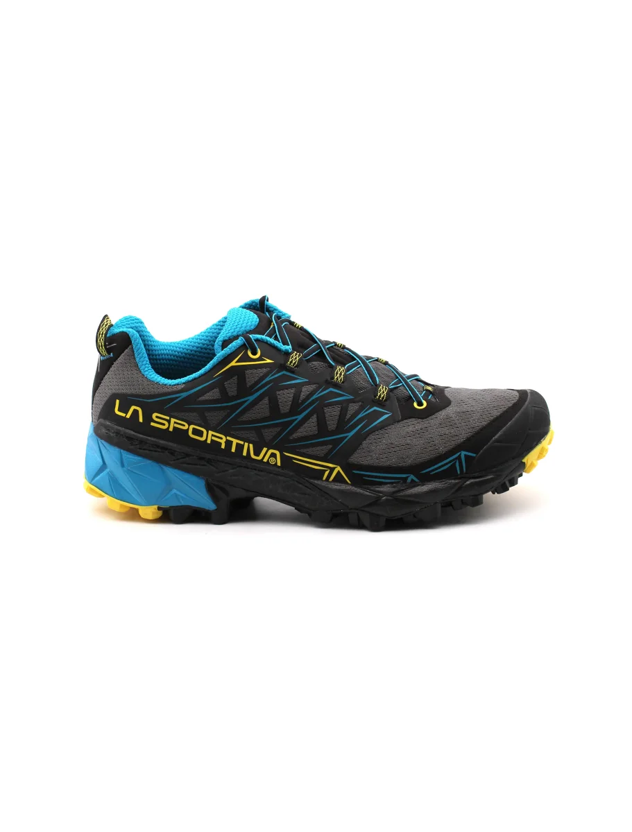 Scarpa da trail running uomo La Sportiva Akyra in Air-Mesh traspirante, fodera in mesh con sistema Easy In per una migliore calzata, plantare in tessuto Ortholite Hybrid Mountain Running, intesuola in Eva e suola FriXion e puntalino in gomma anti-urto integrato per un grip ottimale su ogni tipo di terreno. Ideale per percorsi off-road a lunga distanza.