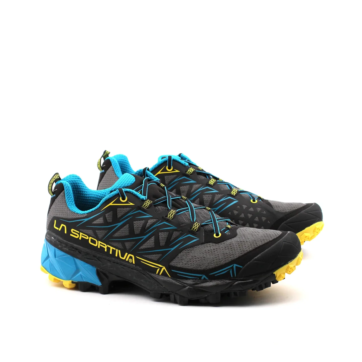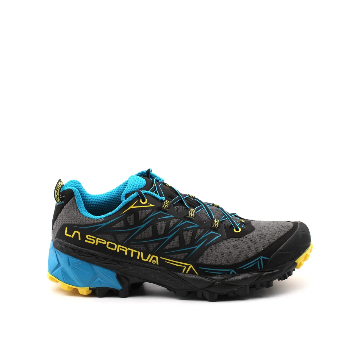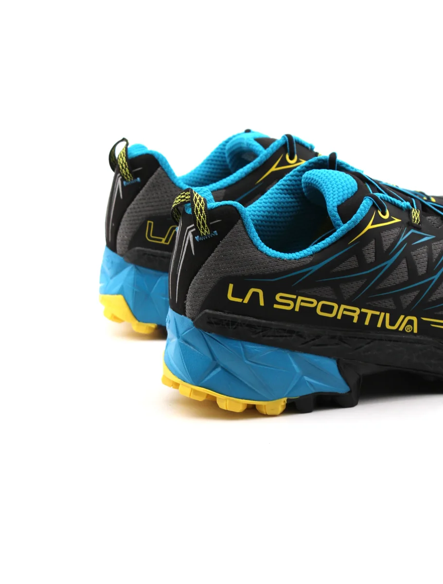 Scarpa da trail running uomo La Sportiva Akyra in Air-Mesh traspirante, fodera in mesh con sistema Easy In per una migliore calzata, plantare in tessuto Ortholite Hybrid Mountain Running, intesuola in Eva e suola FriXion e puntalino in gomma anti-urto integrato per un grip ottimale su ogni tipo di terreno. Ideale per percorsi off-road a lunga distanza.
