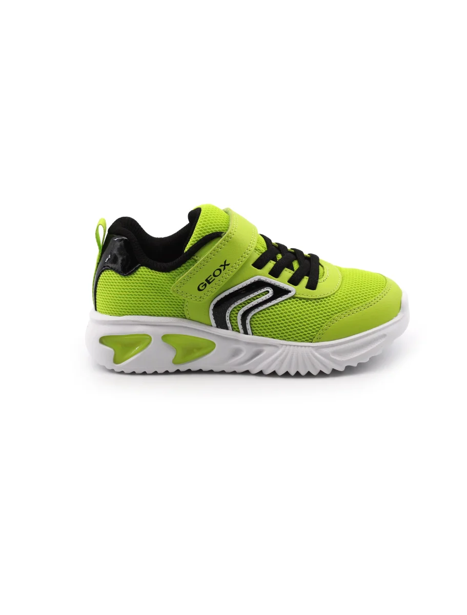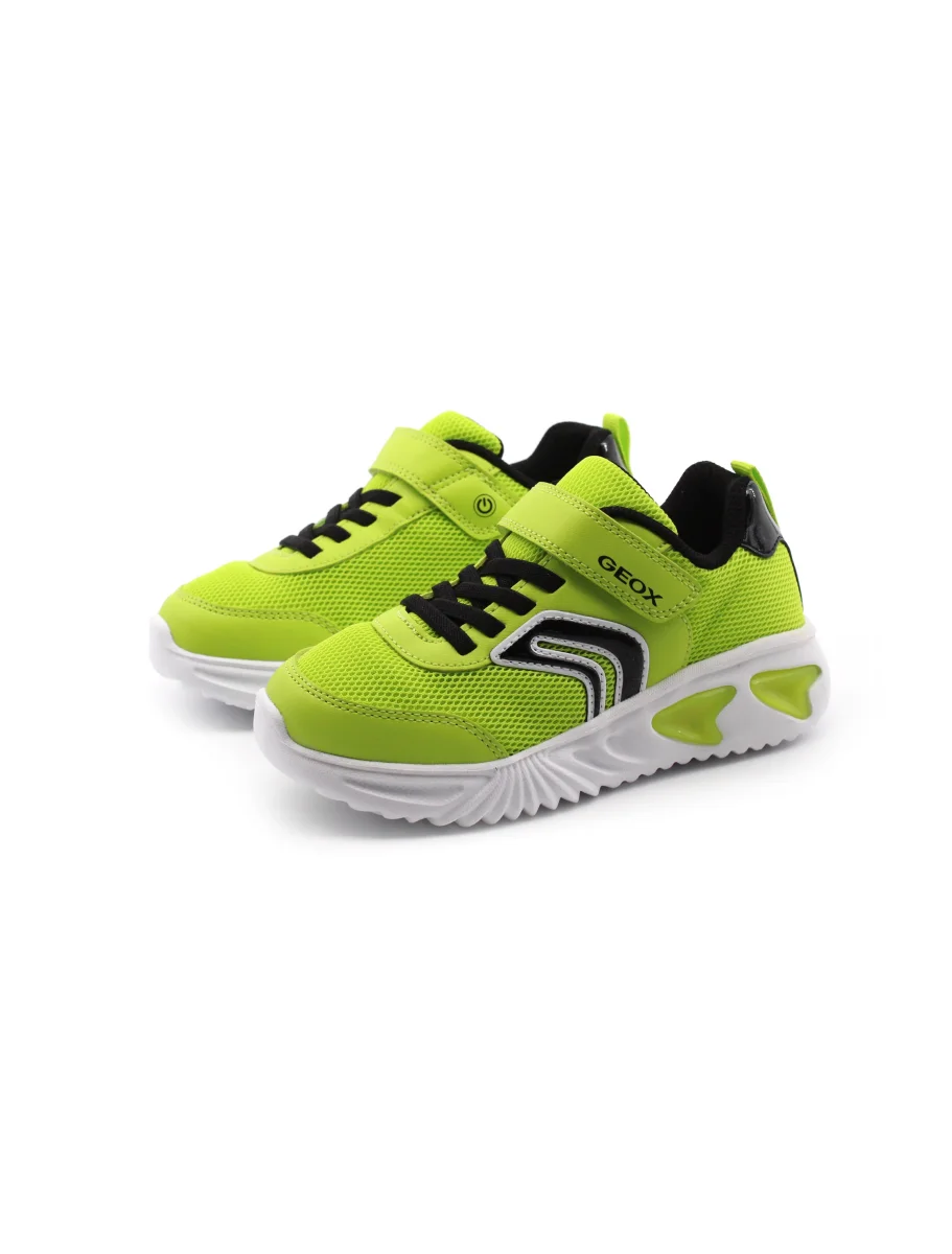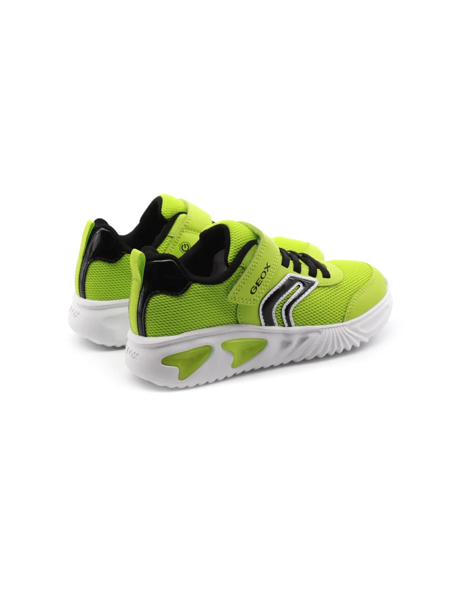 Sneaker con luci da bimbo Geox Assister in tessuto e pelle sintetica con soffice plantare traspirante in tessuto e suola traspirante in gomma con luci. Comoda da indossare grazie alla chiusura con lacci elastici e velcro.