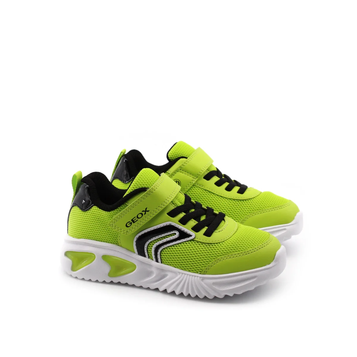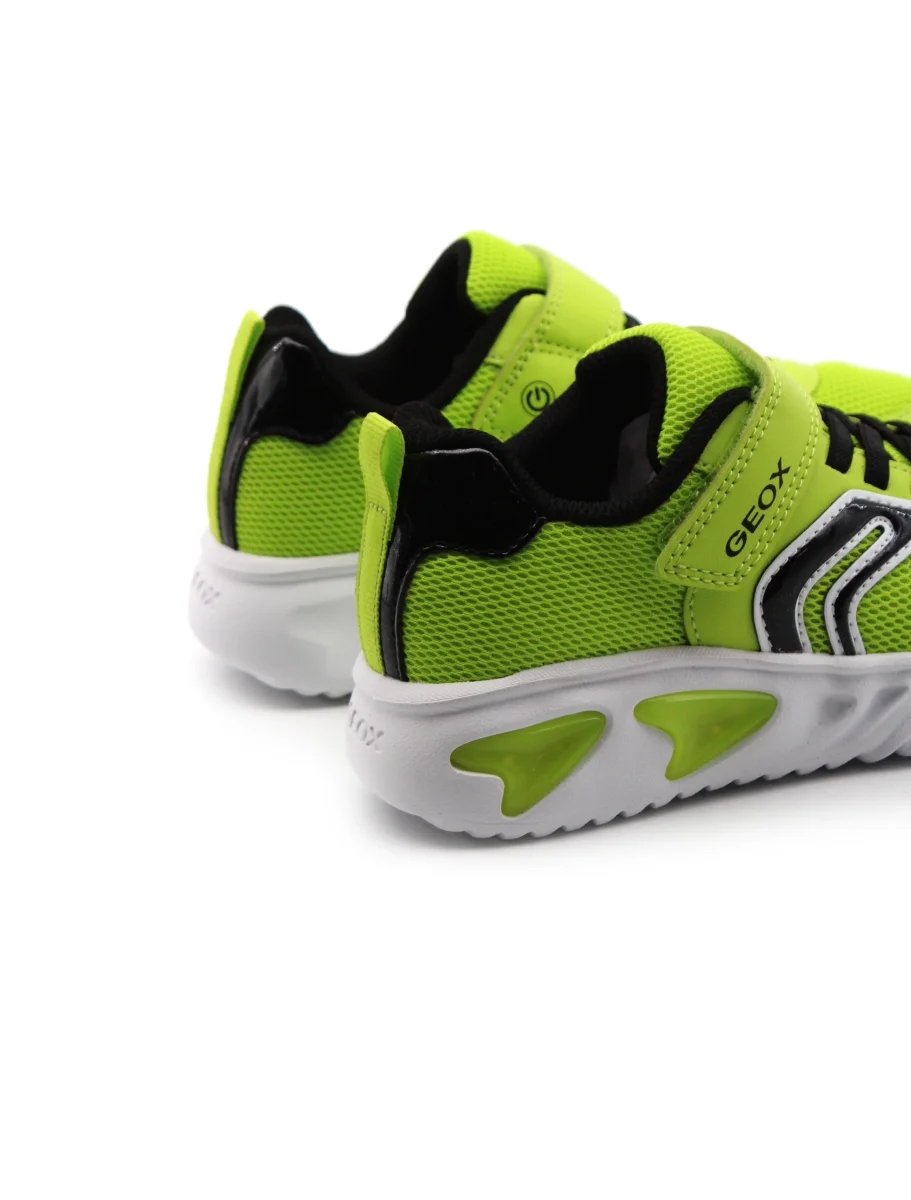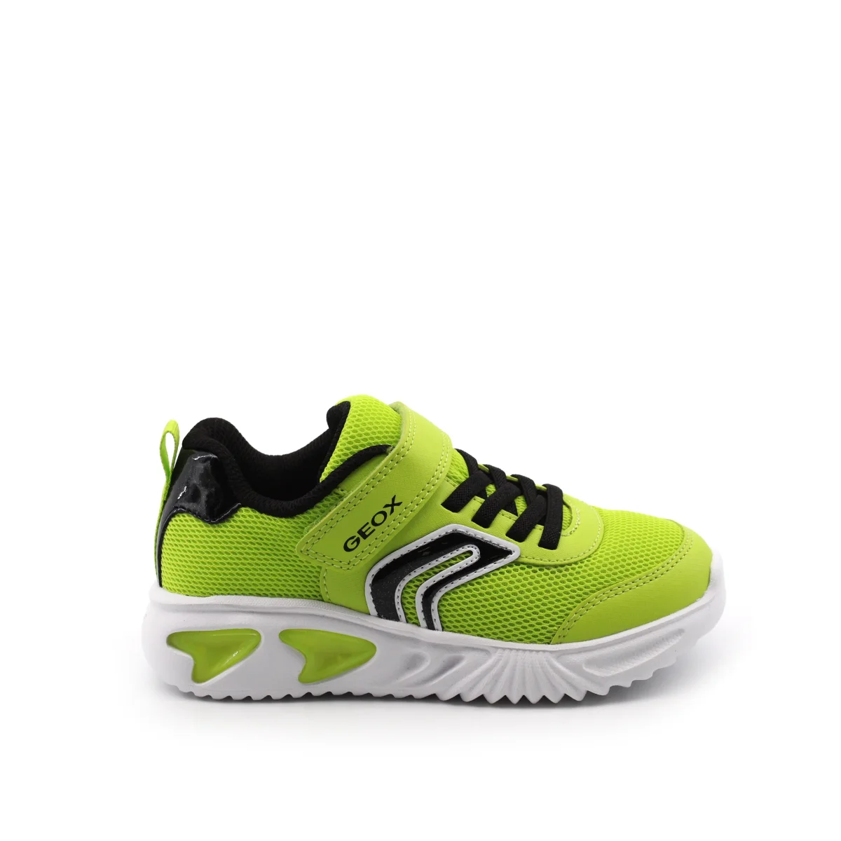 Sneaker con luci da bimbo Geox Assister in tessuto e pelle sintetica con soffice plantare traspirante in tessuto e suola traspirante in gomma con luci. Comoda da indossare grazie alla chiusura con lacci elastici e velcro.