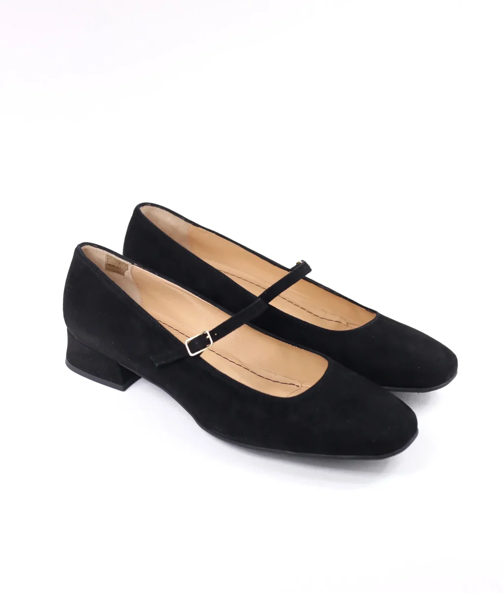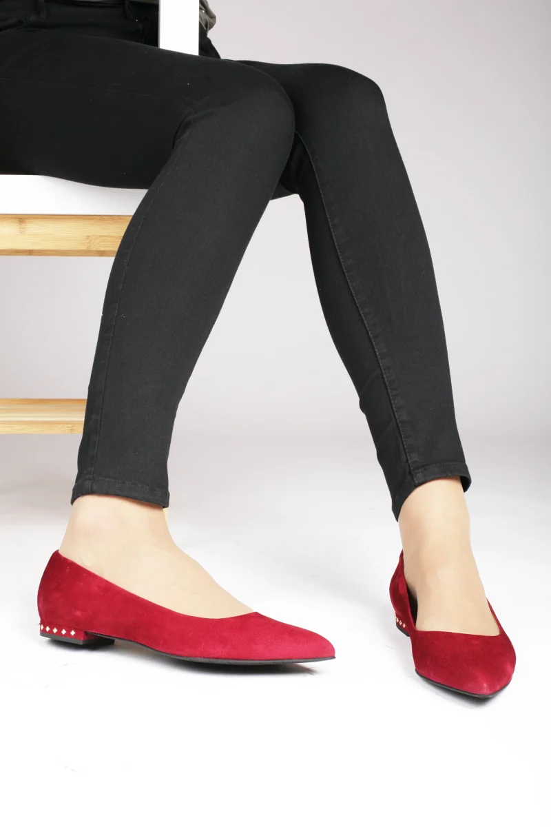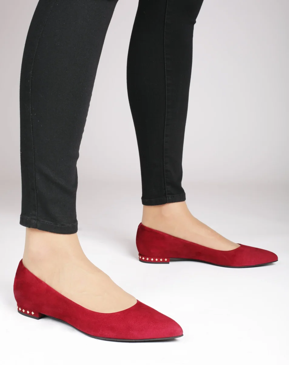 Ballerina da donna a punta di colore bordeaux con borchiette di colore oro sul tacco di un centimetro. Numeri grandi e piccoli. Disponibile anche nella variante verde.