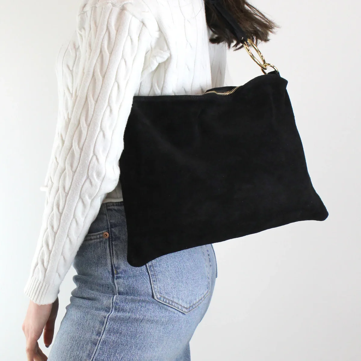 Con una lunghezza di 35 cm e un’altezza di 26 cm, la borsa è spaziosa abbastanza da contenere l’essenziale senza compromettere la silhouette elegante. La profondità di 3 cm la rende ideale per un uso quotidiano, mentre il design raffinato in pelle scamosciata conferisce un tocco di lusso e distinzione.