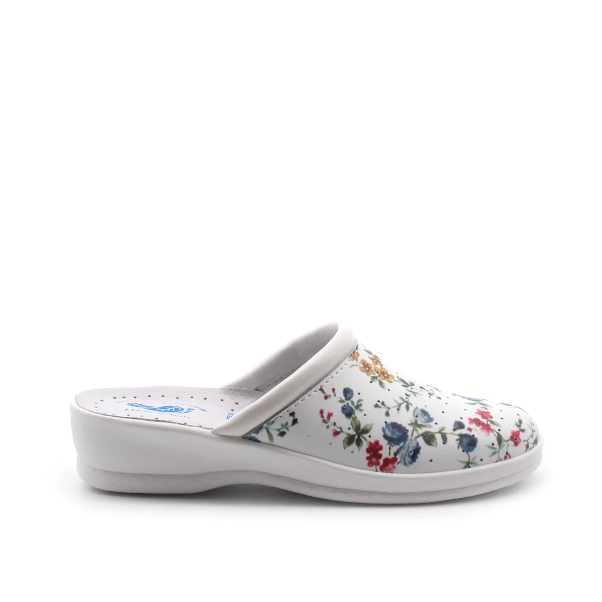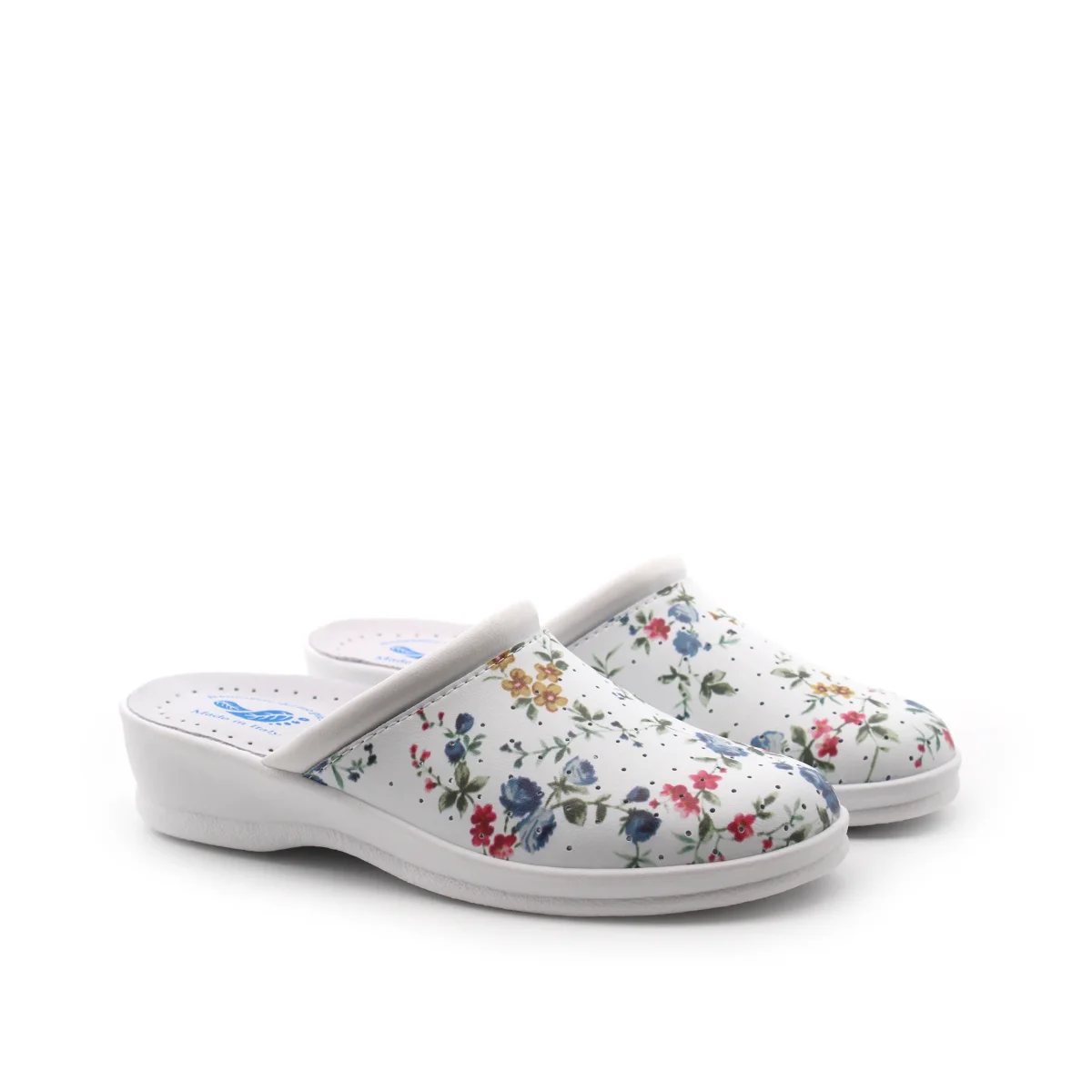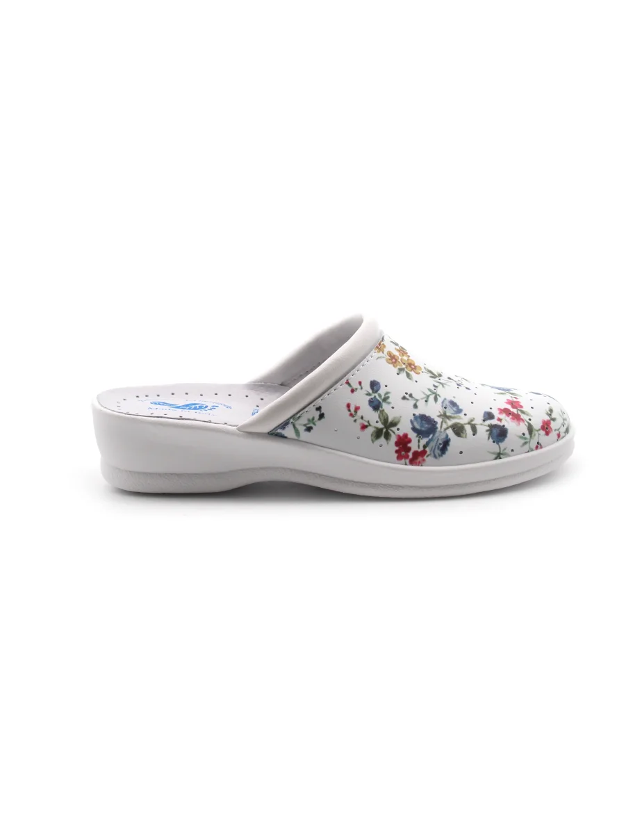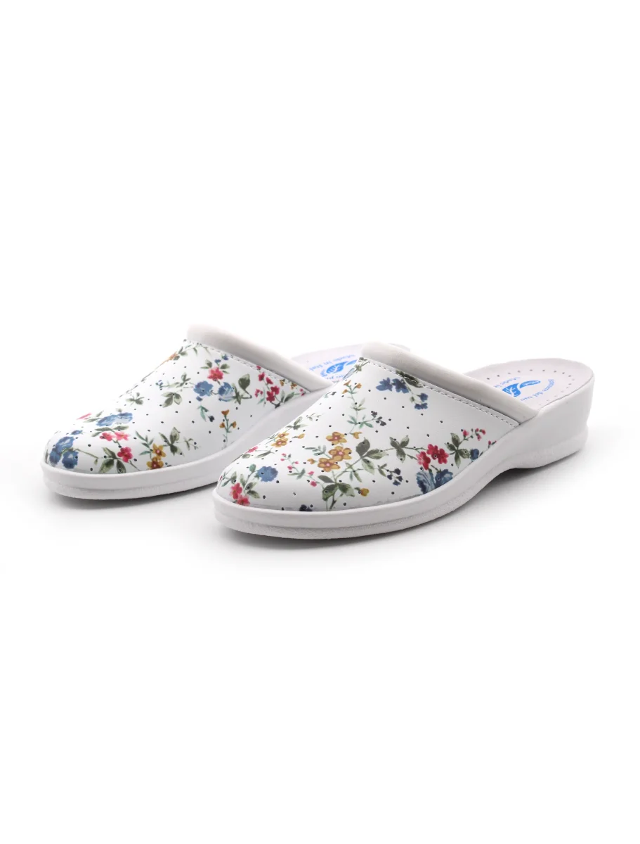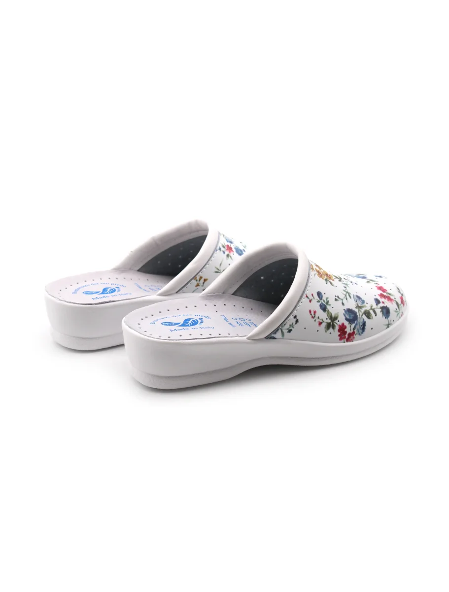 Ciabatta sanitaria made in Italy da donna Benessere del tuo piede in pelle sintetica a fantasia fiorata, sottopiede in vera pelle e fondo in gomma.