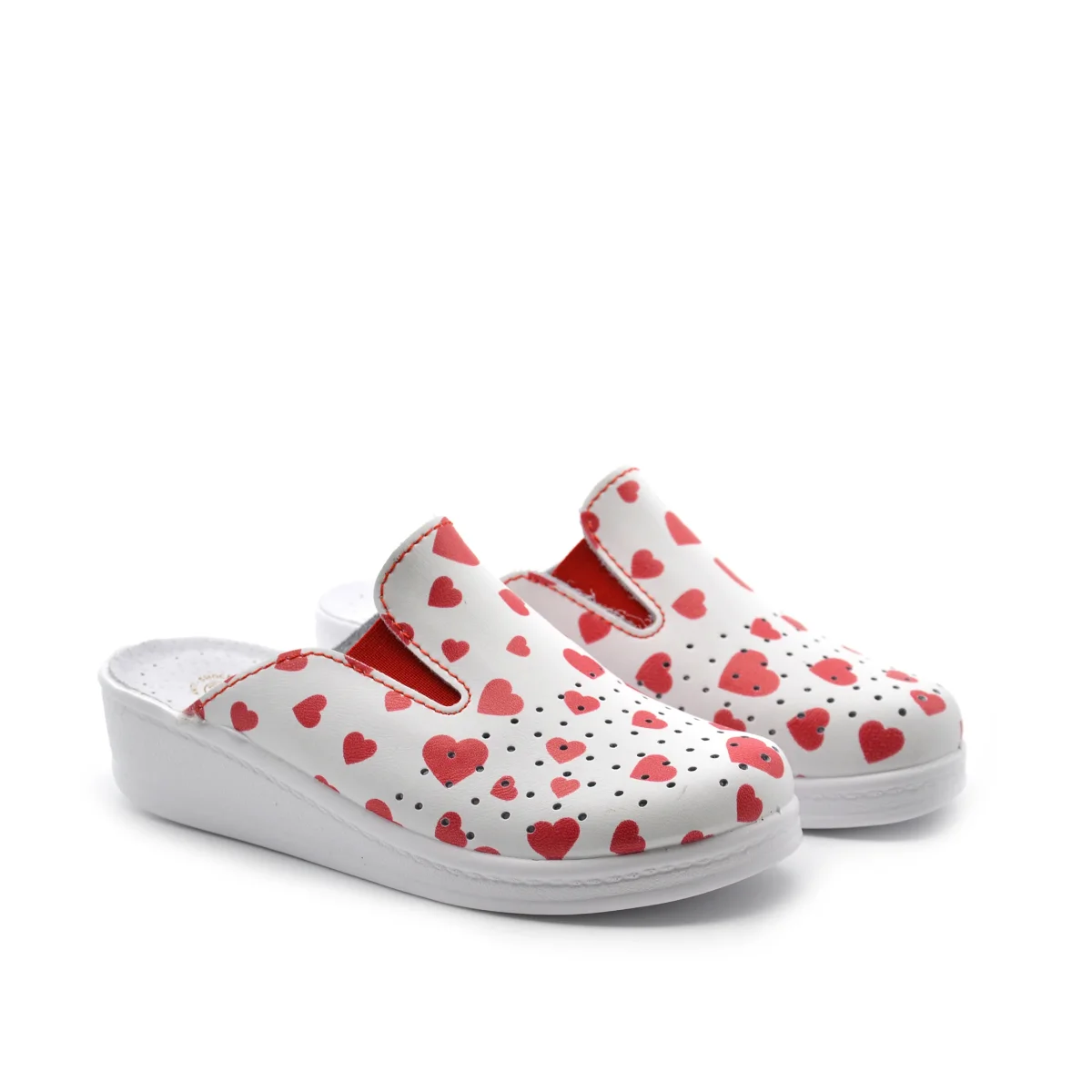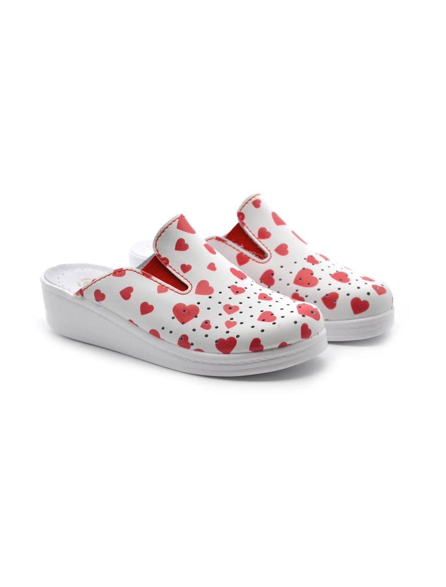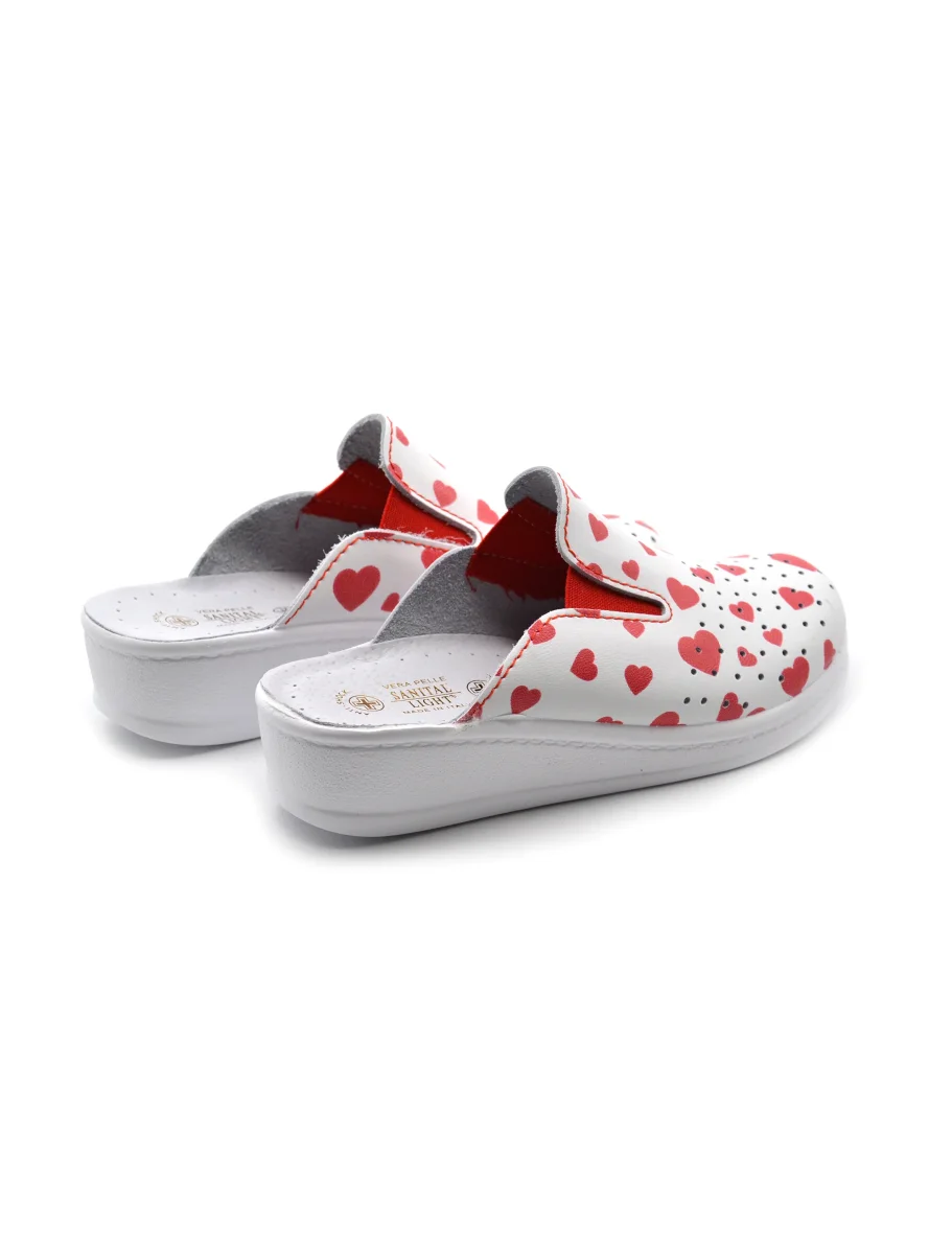 Ciabatta sanitaria da donna Sanital Light made in Italy in vera pelle traforata bianca con stampa fantasia cuori, morbido sottopiede anatomico in pelle e fondo Anti-Shock in gomma.