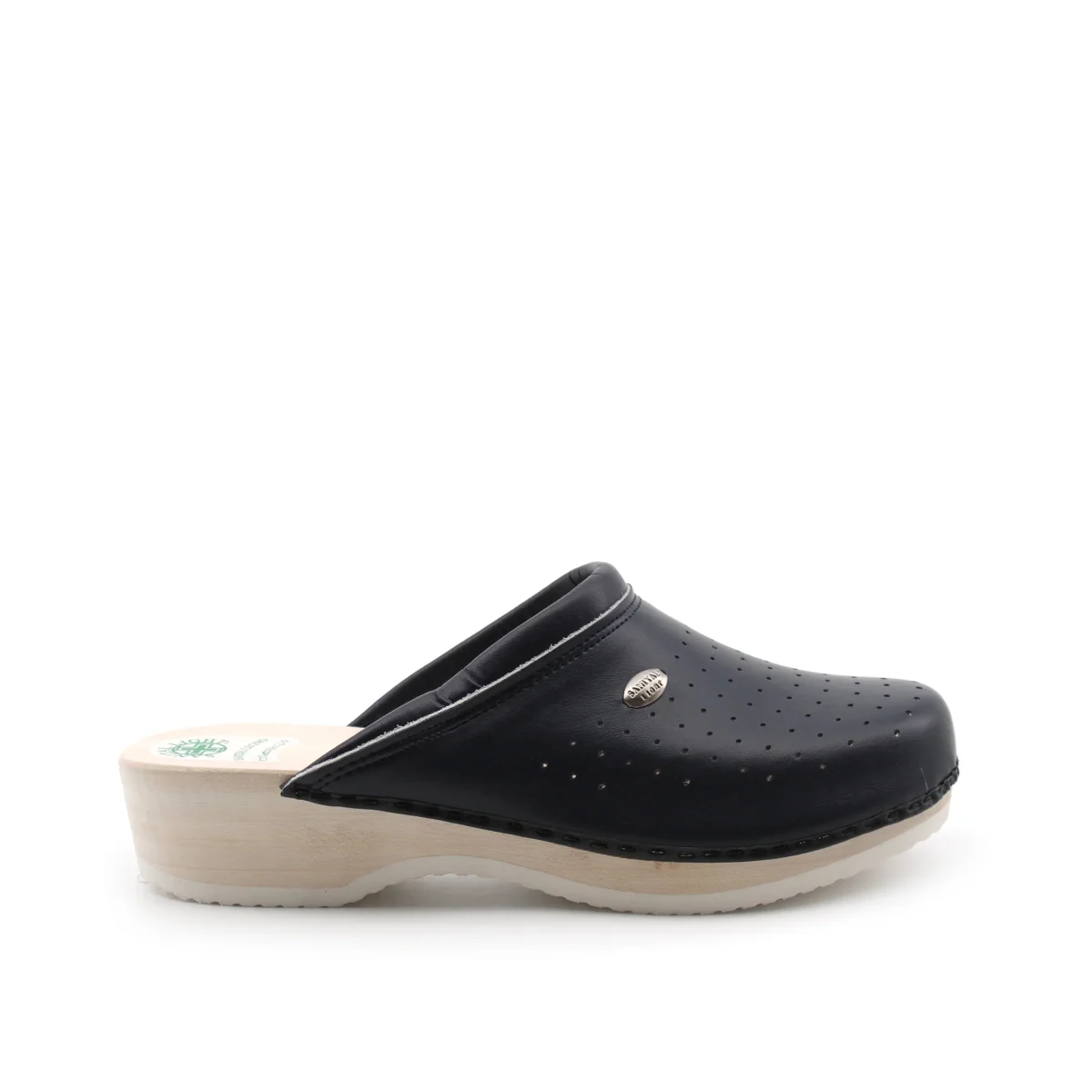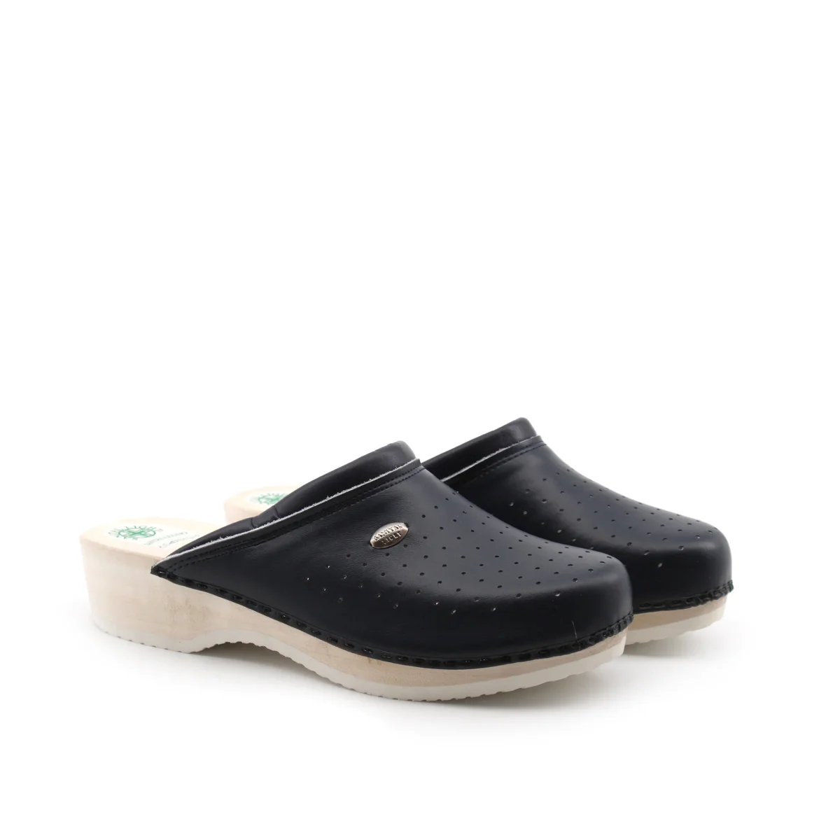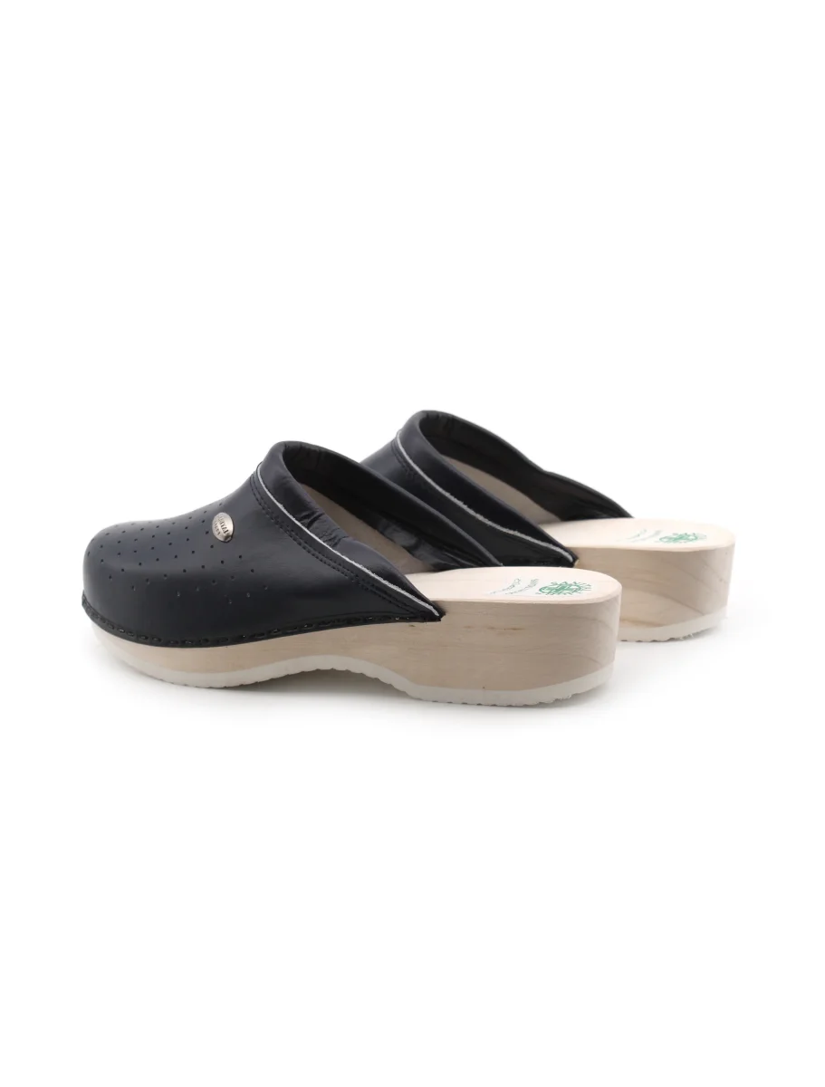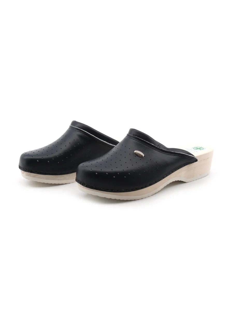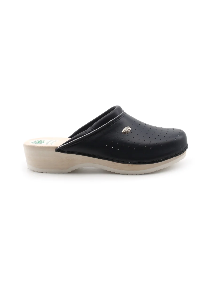 Ciabatta sanitaria da uomo Sanital Light in vera pelle traforata con sottopiede il legno naturale e fondo in gomma antiscivolo.