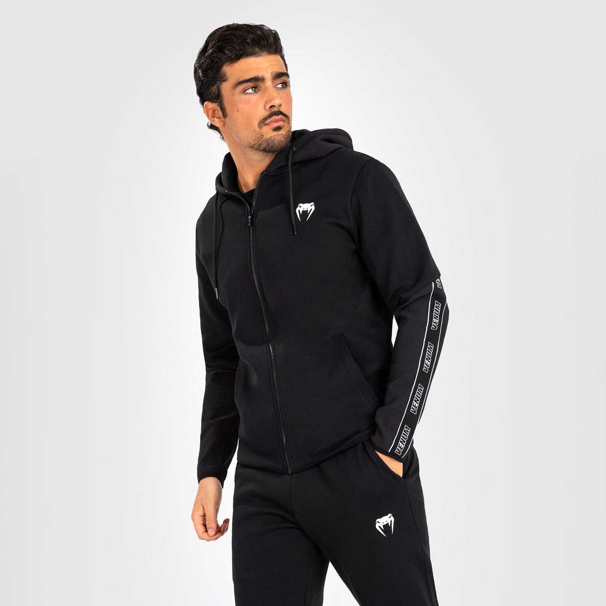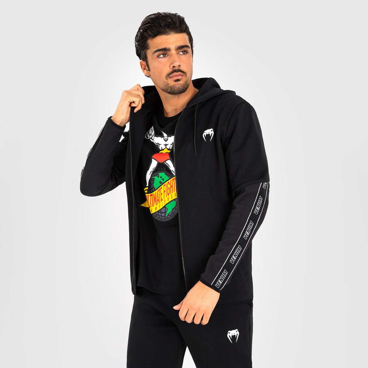 La felpa Venum Contender 4.0 è pensata per le giornate di allenamento e di riposo. Realizzata con un misto cotone-poliestere (69% cotone, 31% poliestere), questa felpa da uomo con zip offre una vestibilità atletica perfetta per il riscaldamento o come abbigliamento sportivo. La tonalità nera presenta dettagli tono su tono su maniche, cappuccio e schiena, con il logo Venum in bianco sul petto e un marchio lungo la manica inferiore. La felpa Venum Contender 4.0, dotata di tasche aperte e logo serigrafato, è il capo ideale per ogni sportivo.