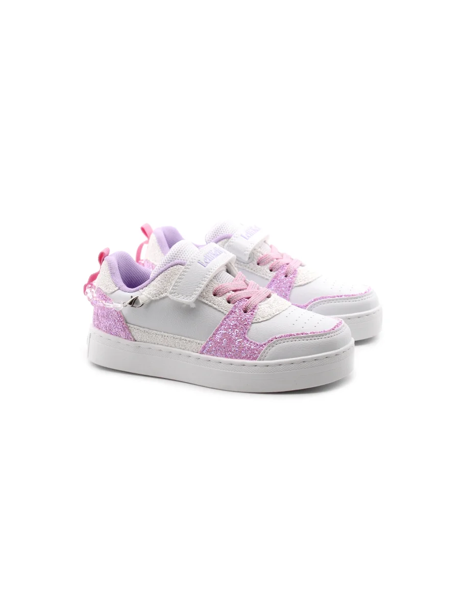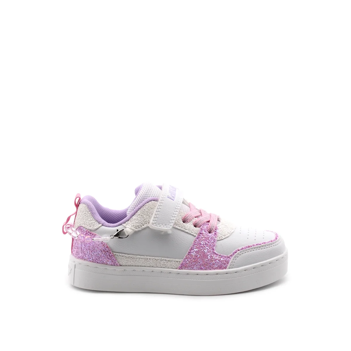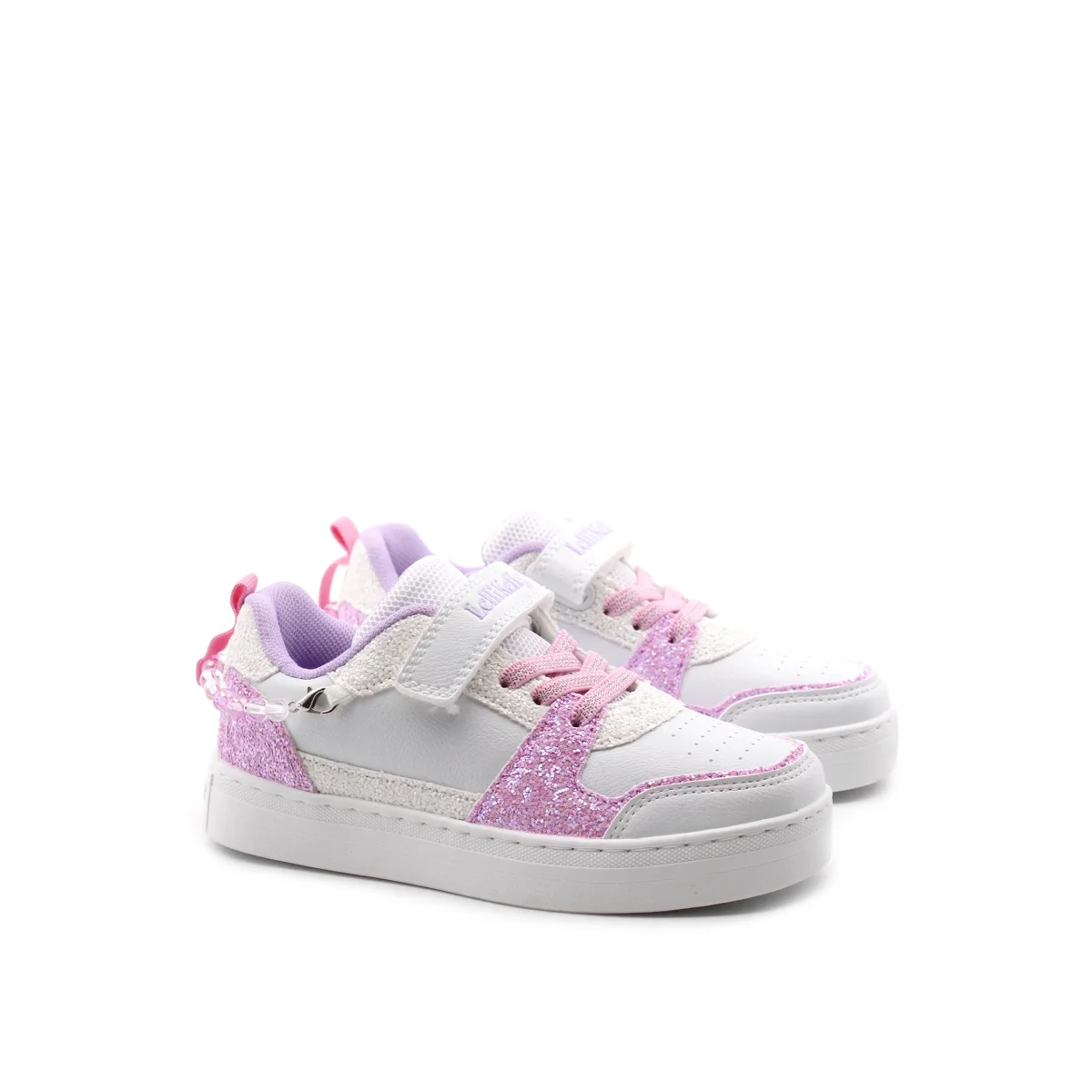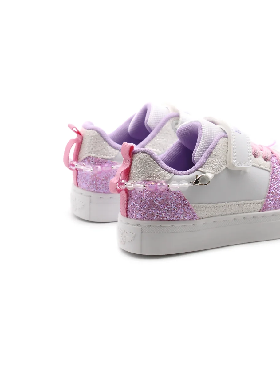 Gioiello New sneaker da bimba con braccialetto che le bambine potranno decidere se indossarlo sulla scarpa o al polso del marchio Lelli Kelly con tomaia in pelle sintetica con strass e dettagli glitter, morbido sottopiede in mesh, suola in gomma e pratica chiusura con lacci elastici glitterati e velcro.