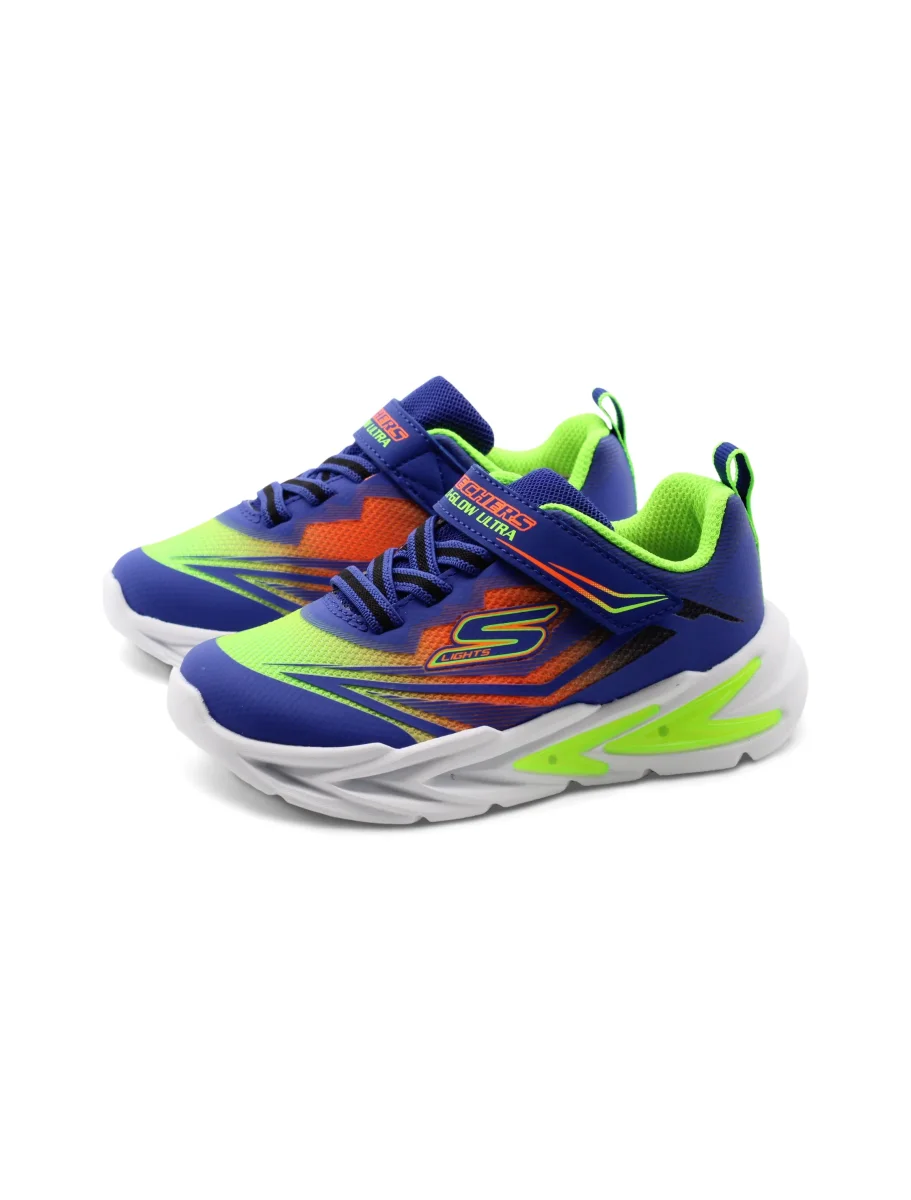 Lascia che il tuo piccolo esplori il mondo con le Glow Ultra sneaker di Skechers, pensate appositamente per i maschietti che amano muoversi e divertirsi. La chiusura è pratica e sicura, con un sistema combinato di velcro e lacci elastici che permette di indossarle facilmente e di adattarsi perfettamente al piede.