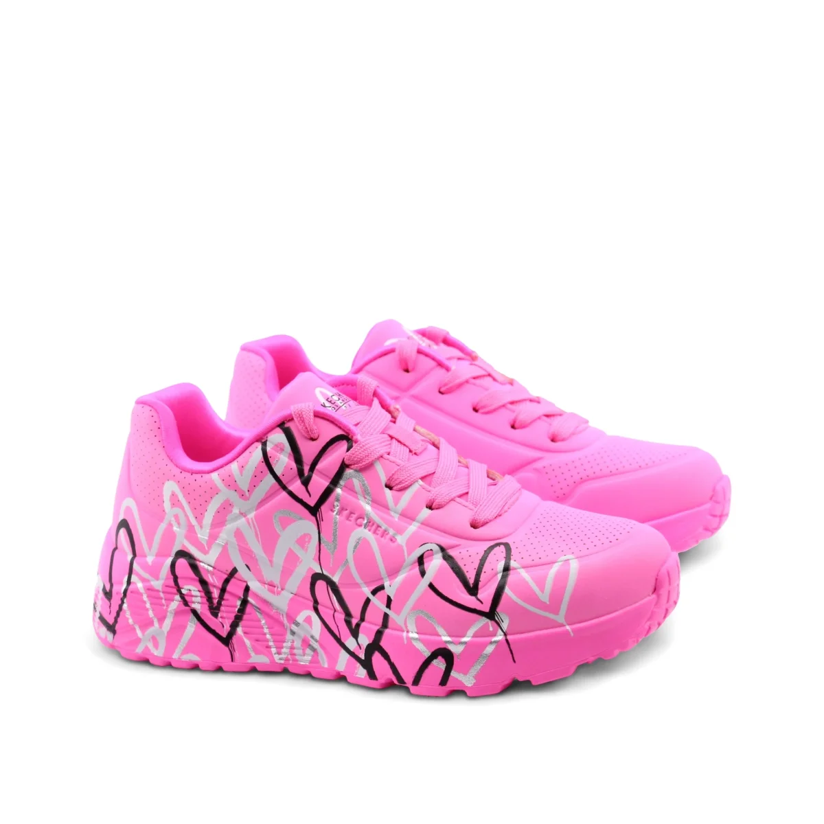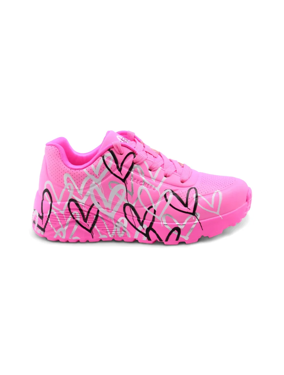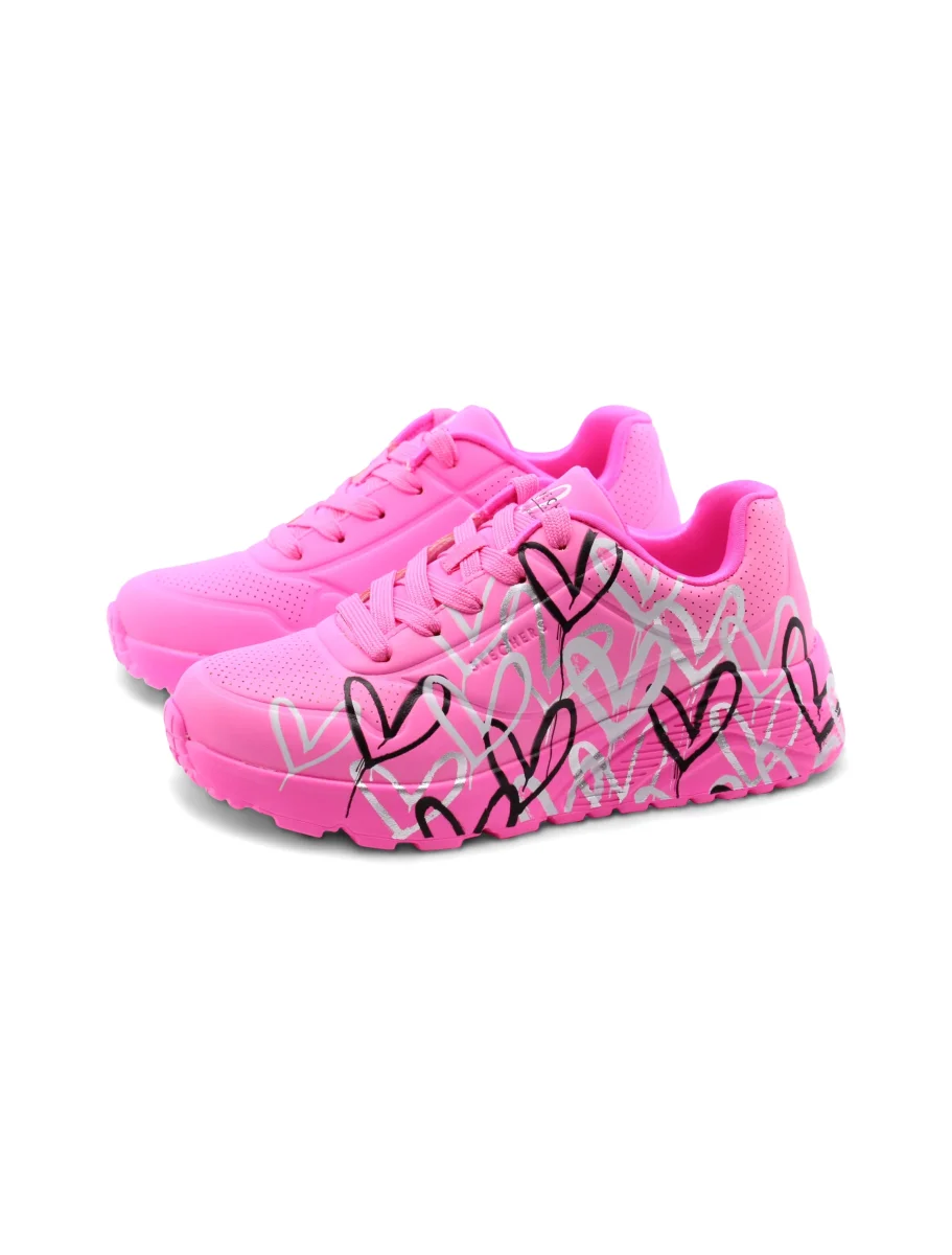 Presentiamo le Metallic Love sneaker rosa da bimba di Skechers, un paio di scarpe pensate per unire comfort e stile. La chiusura a lacci permette una regolazione facile e sicura, garantendo che ogni piccolo passo sia stabile e sicuro.