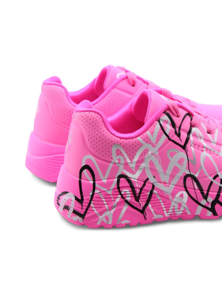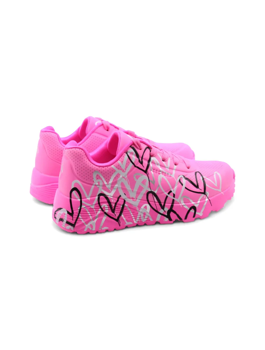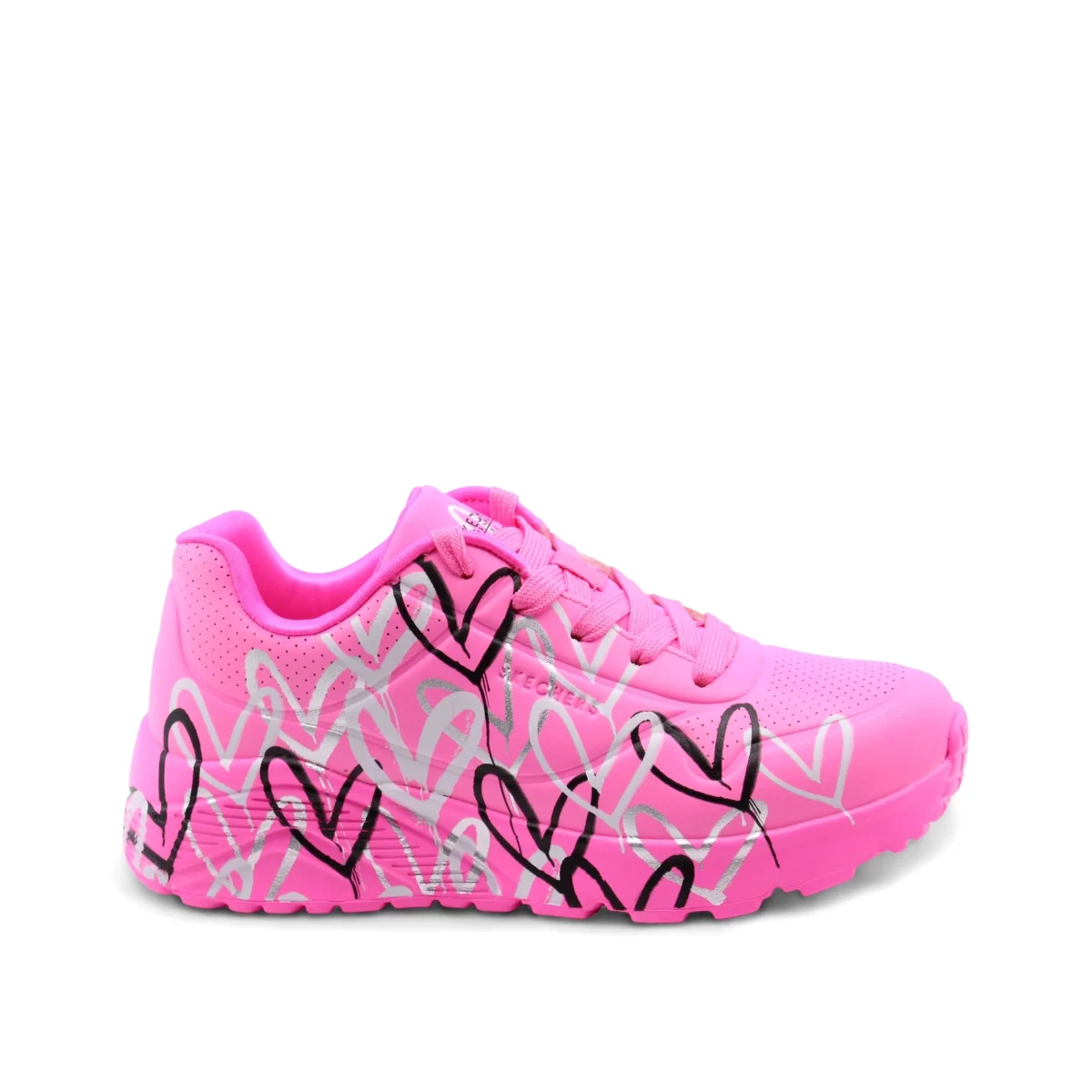 Presentiamo le Metallic Love sneaker rosa da bimba di Skechers, un paio di scarpe pensate per unire comfort e stile. La chiusura a lacci permette una regolazione facile e sicura, garantendo che ogni piccolo passo sia stabile e sicuro.