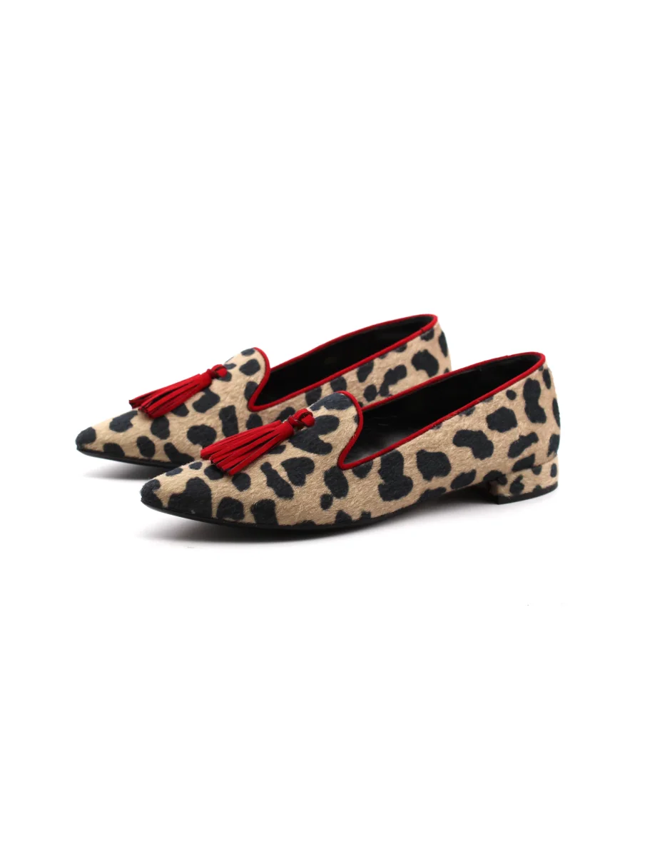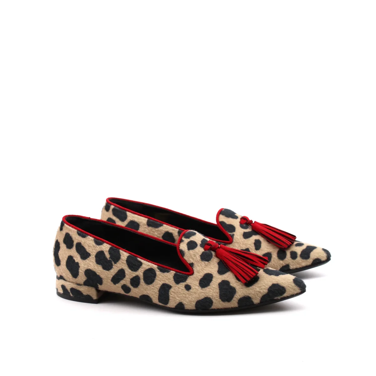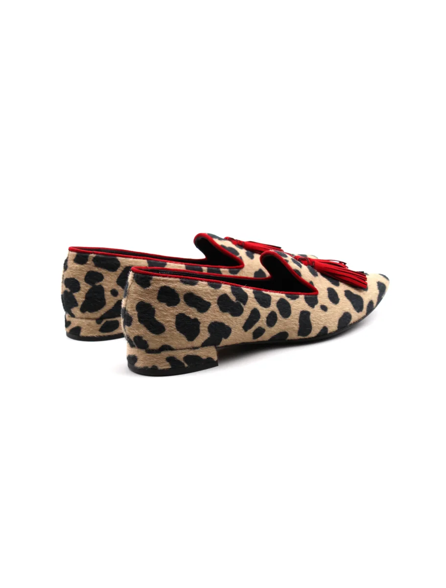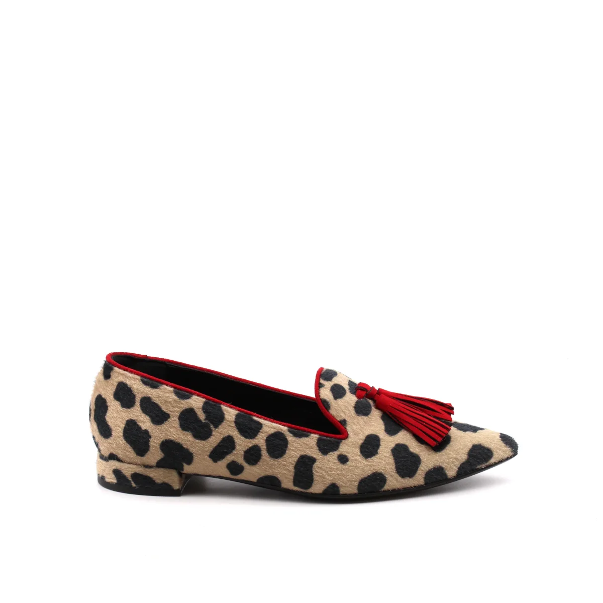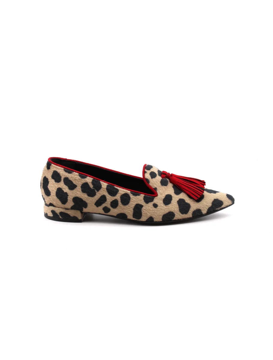 Mocassino animalier a punta, Made in Italy, Conte’ Studio 1978, con nappine colorate, sottopiede in vera pelle e suola in gomma. Disponibile in tre stampe animalier: leopardato con nappine rosse, zebrato con nappine nere o viola. Perfetti per chi ama l’eleganza senza rinunciare alla comodità . Casual di giorno ed elegante di sera.