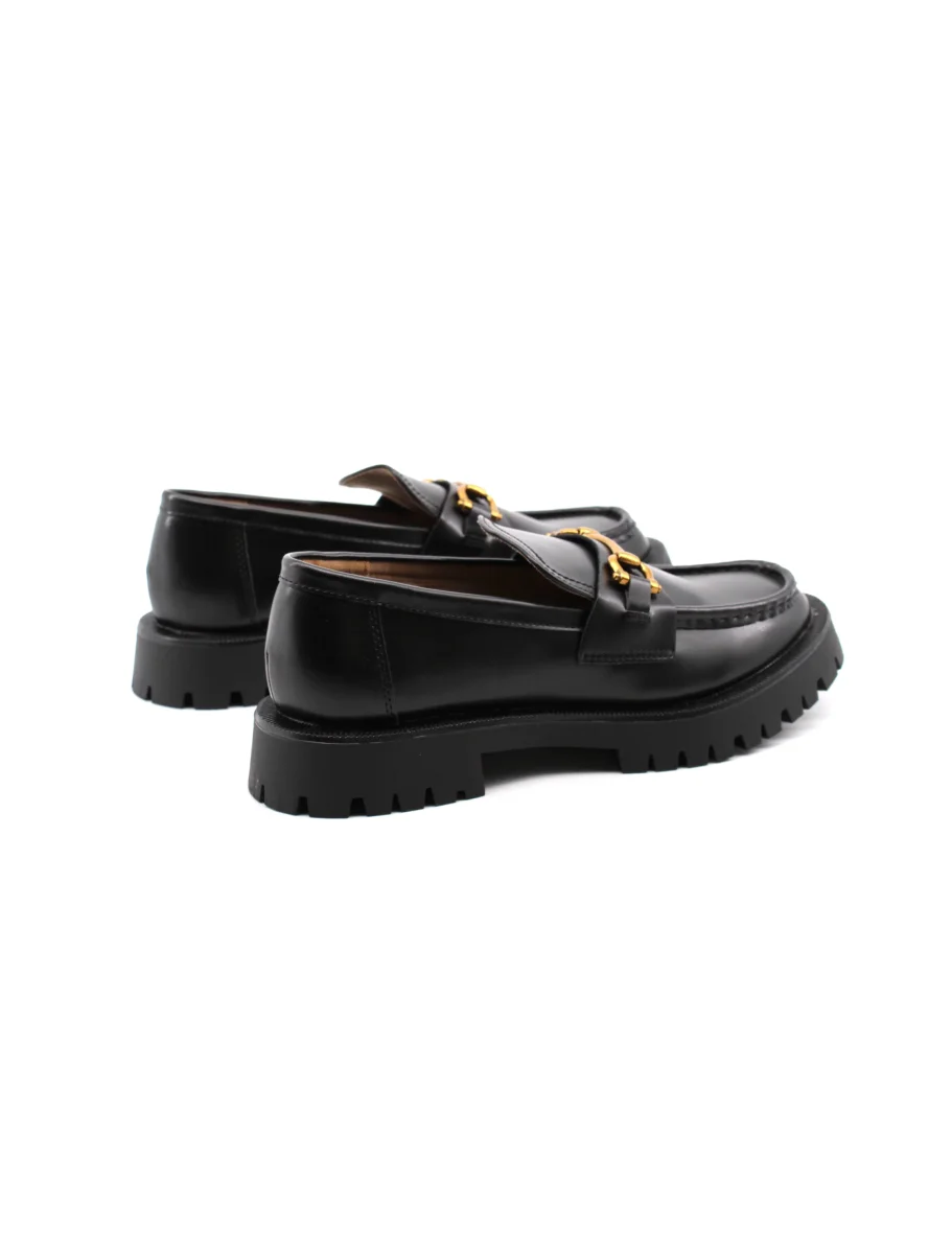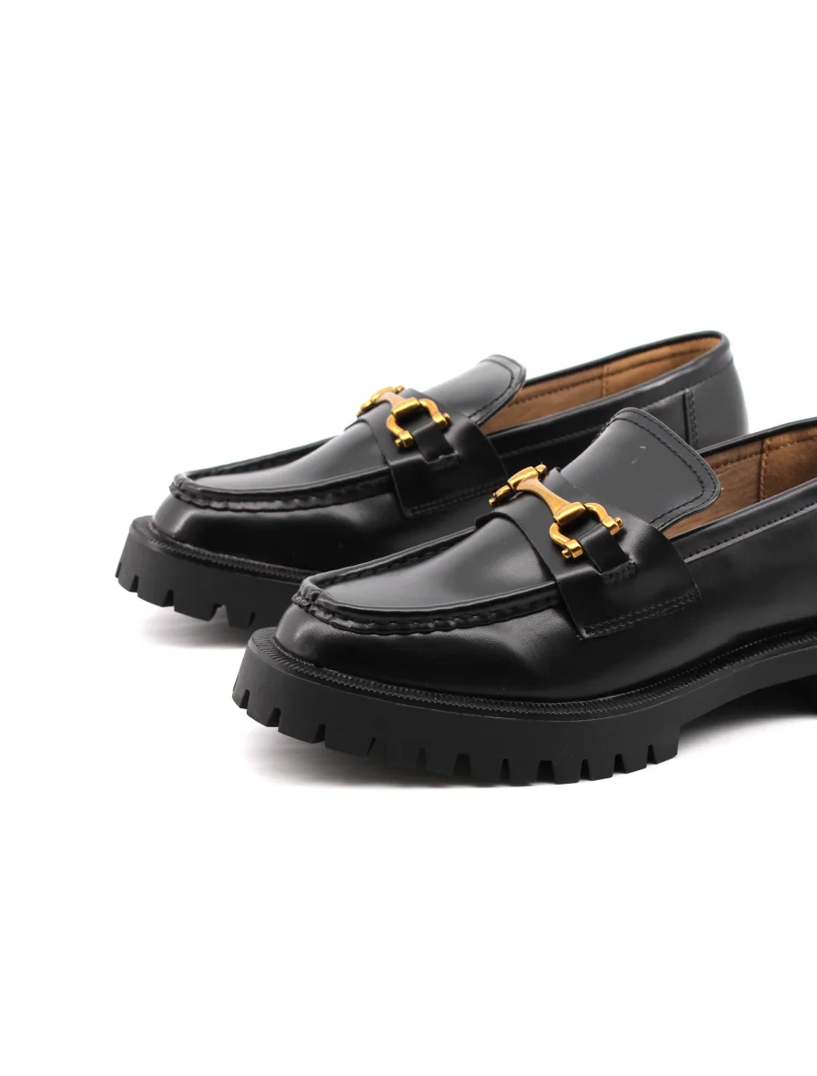 Mocassino chunky da donna Paulina con tomaia in pelle sintetica con morsetto oro, morbido plantare in tessuto, e suola carrarmato in gomma. Comodo e alla moda.