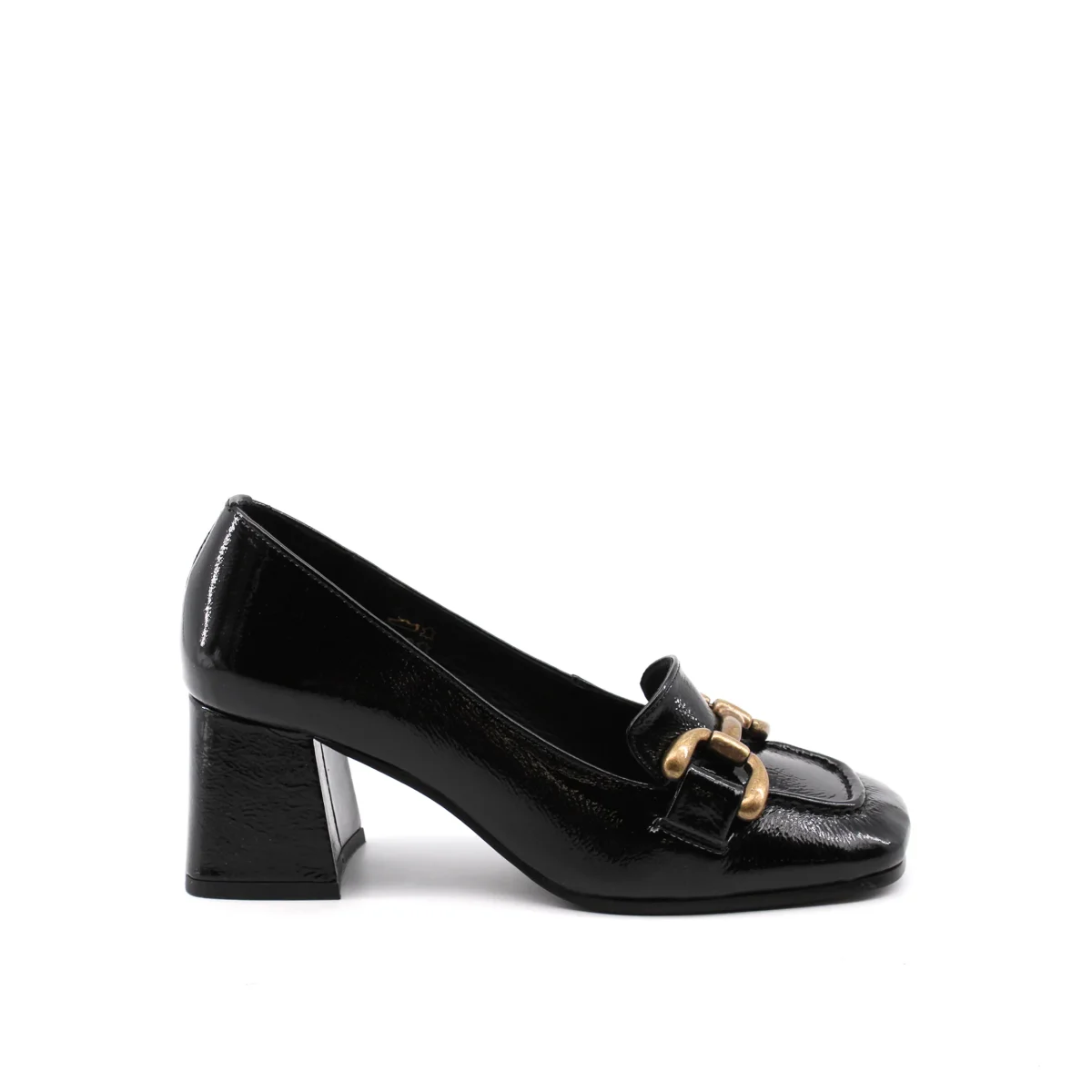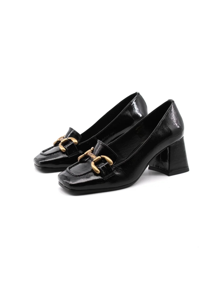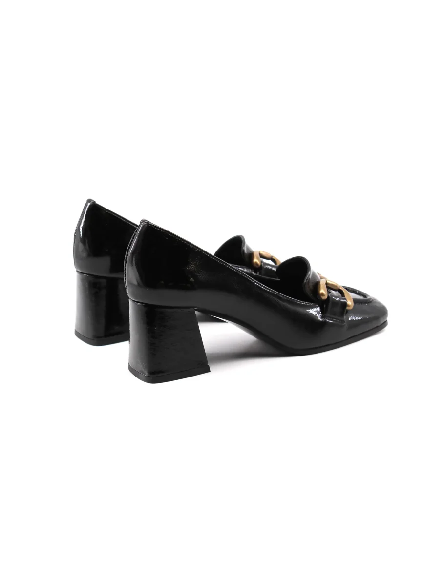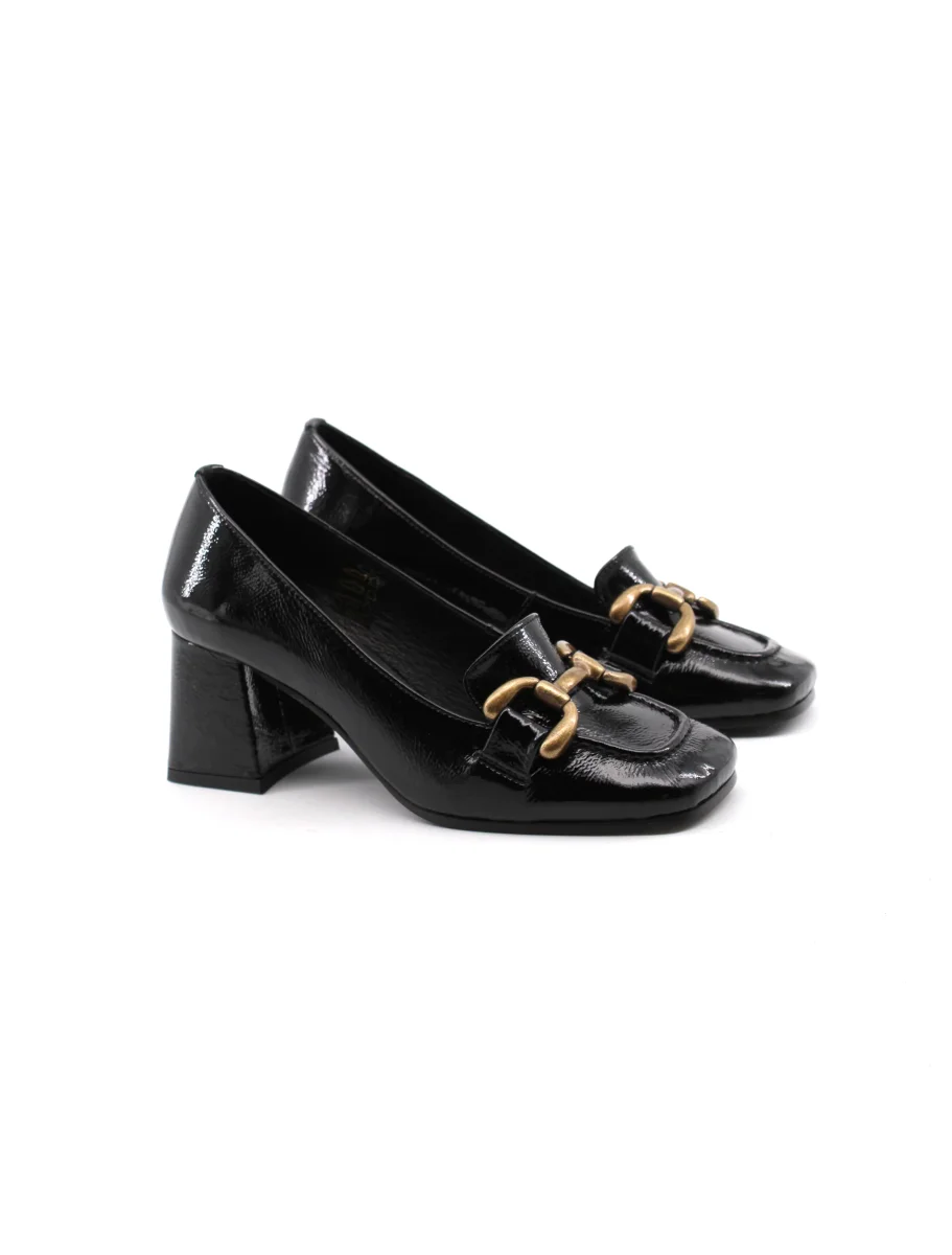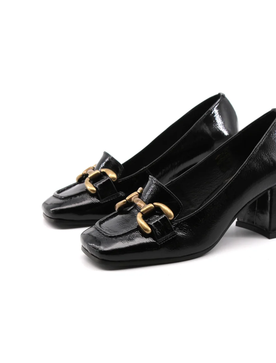 Conte’ mocassino con tacco da donna in vera pelle effetto vernice con morsetto dorato, soffice plantare in vera pelle e suola in gomma. Elegante e versatile. Made in Portugal.