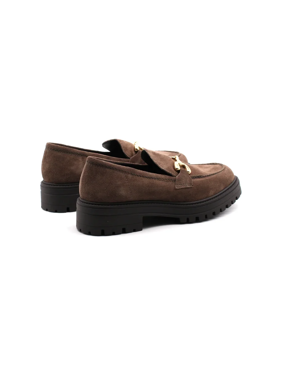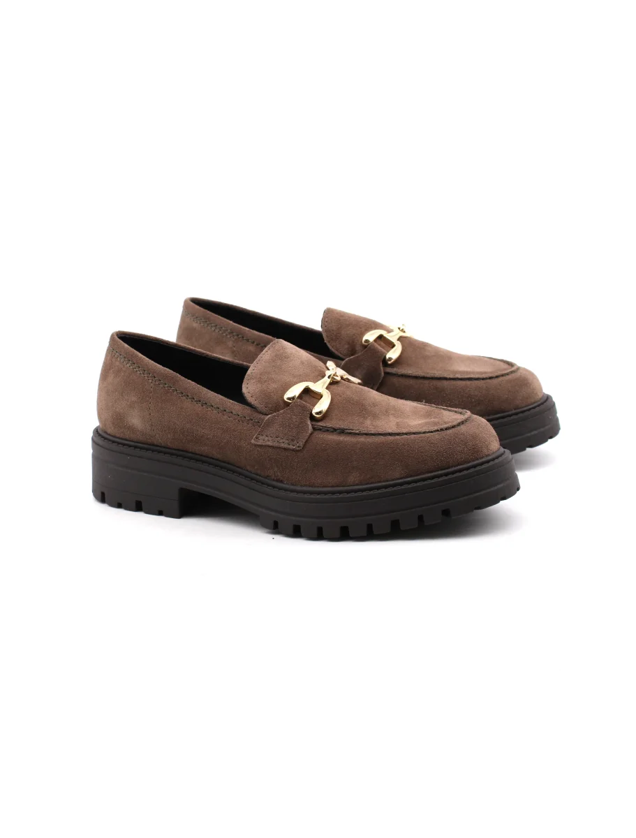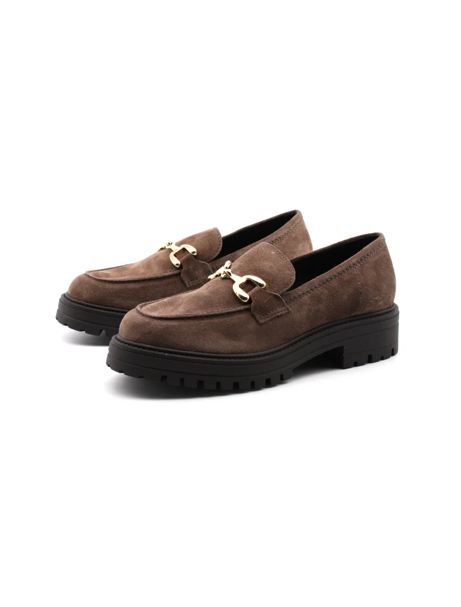 Mocassino con morsetto oro da donna Les Femmes in morbida pelle scamosciata con soffice plantare in pelle sintetica e suola carrarmato in gomma con tacco basso 4cm. Comodo ed elegante, dal look classico.