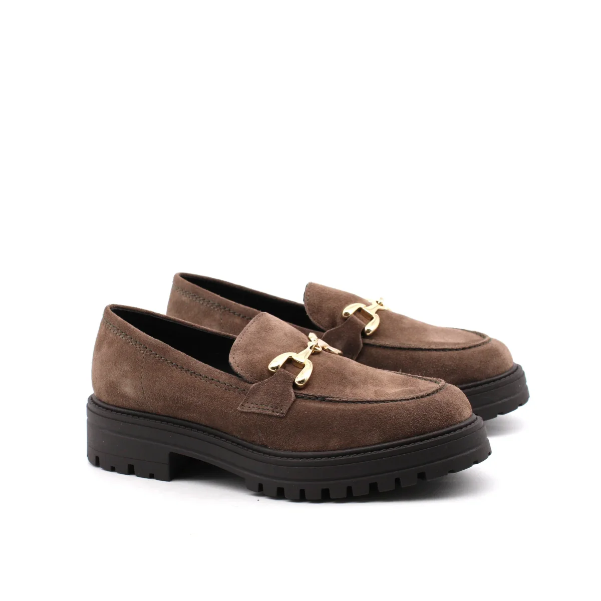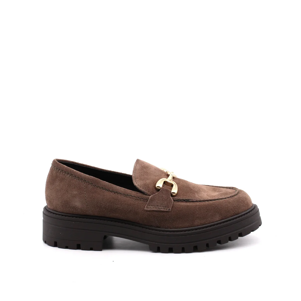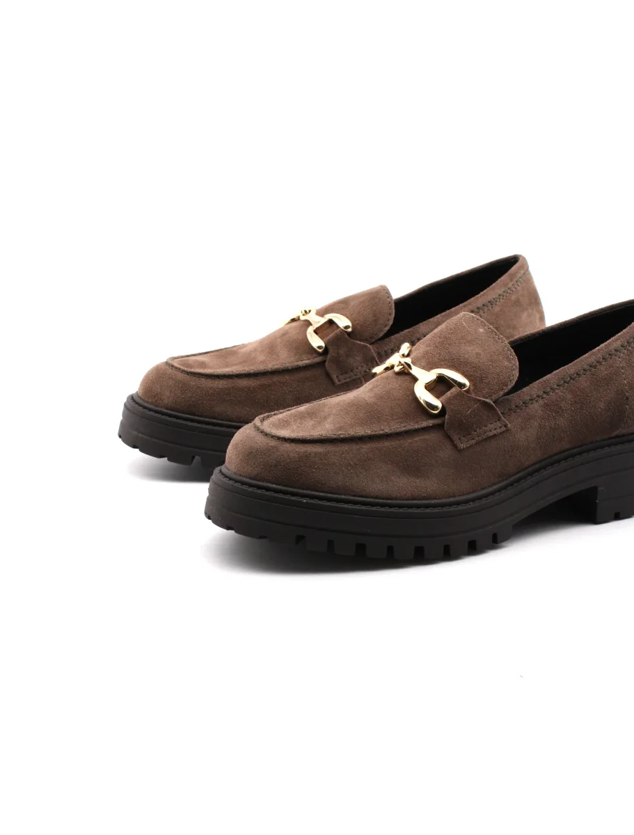 Mocassino con morsetto oro da donna Les Femmes in morbida pelle scamosciata con soffice plantare in pelle sintetica e suola carrarmato in gomma con tacco basso 4cm. Comodo ed elegante, dal look classico.