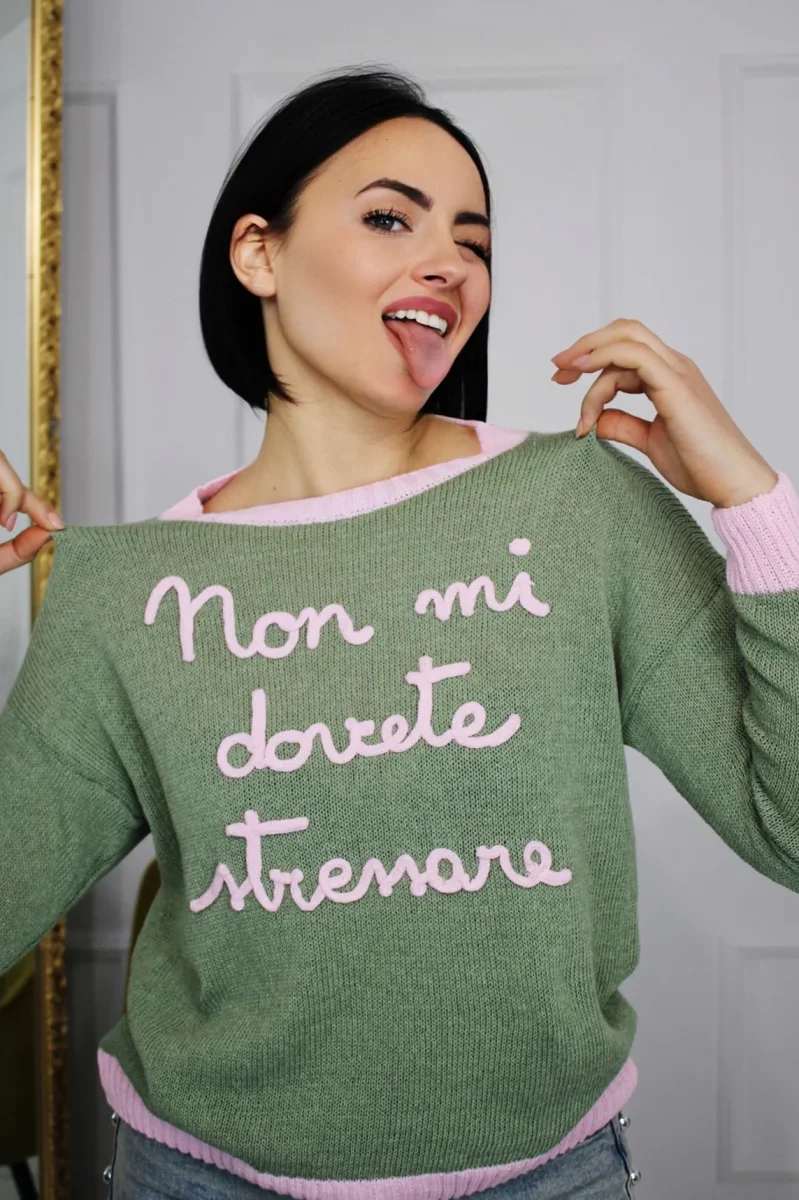 Maglioncino realizzato in morbido filo con scritta a maglia in rilievo che recita “Non mi dovete stressare” taglia unica. Un capo perfetto per chi vuole esprimere il proprio stato d’animo con stile e ironia. La lavorazione in rilievo rende la scritta protagonista, creando un effetto tridimensionale che cattura l’attenzione. Ideale per chi ama indossare messaggi positivi e divertenti nel quotidiano.