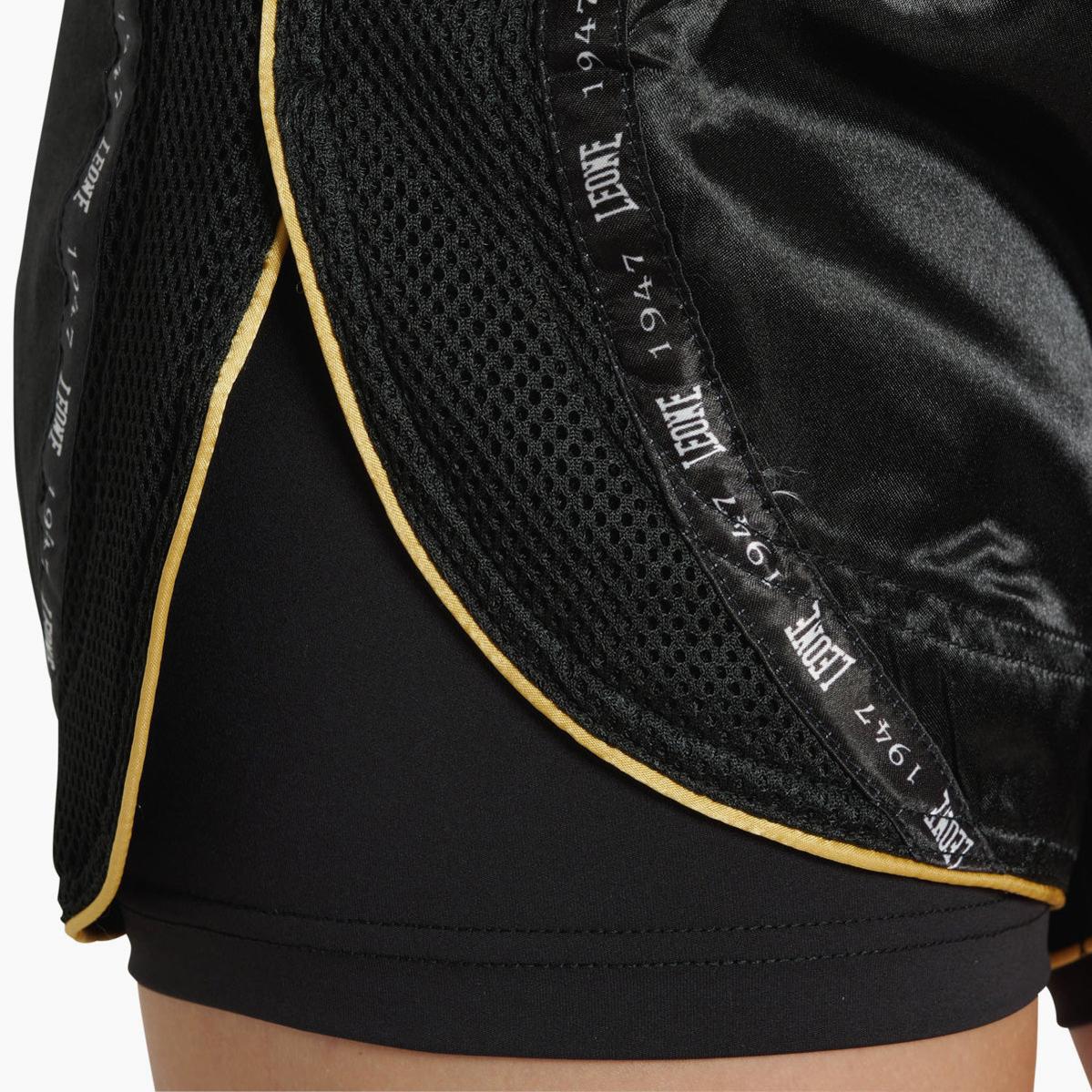 I Pantaloncini Kick-Thai donna Leone Classic AB882 Nero sono degli shorts femminili per Muay Thai e Kick Boxing dotati di sottopantaloncino integrato. Progettati per offrire comfort, libertà di movimento e resistenza, sono realizzati in satin con inserti in mesh traspirante. Il design classico, essenziale e funzionale è completato da una cintura elastica con sei file di cuciture che garantisce una vestibilità stabile e sicura. Gli spacchetti laterali favoriscono la mobilità , permettendo di eseguire calci e movimenti dinamici senza restrizioni. Il sottopantaloncino consente ultra comfort e copertura durante le tue prestazioni.