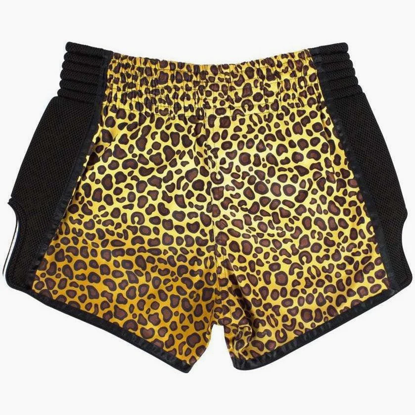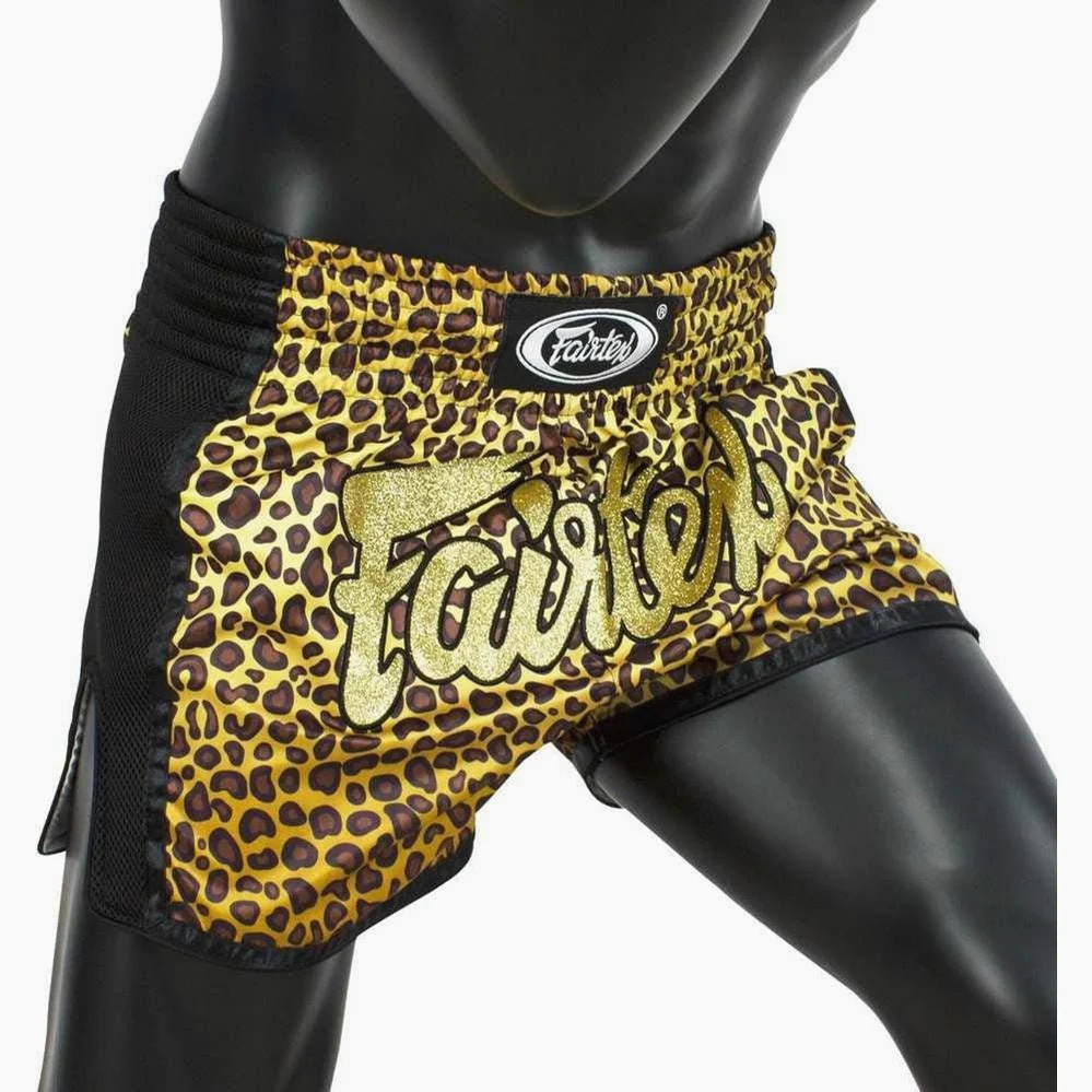 I Pantaloncini Fairtex BS1709 Leopard sono degli shorts da Muay Thai realizzati in Thailandia. Questo modello si distingue per la fantasia leopardata sulla quale spicca il logo Fairtex dorato. Gli inserti laterali in mesh sono neri e donano eleganza al pantaloncino; nero anche il piping che dona maggiore resistenza al prodotto. Caratterizzati da un nuovo design, gli shorts Leopard hanno un taglio slim e spacchetti laterali profondi, per consentire libertà di movimento e calci ampi.