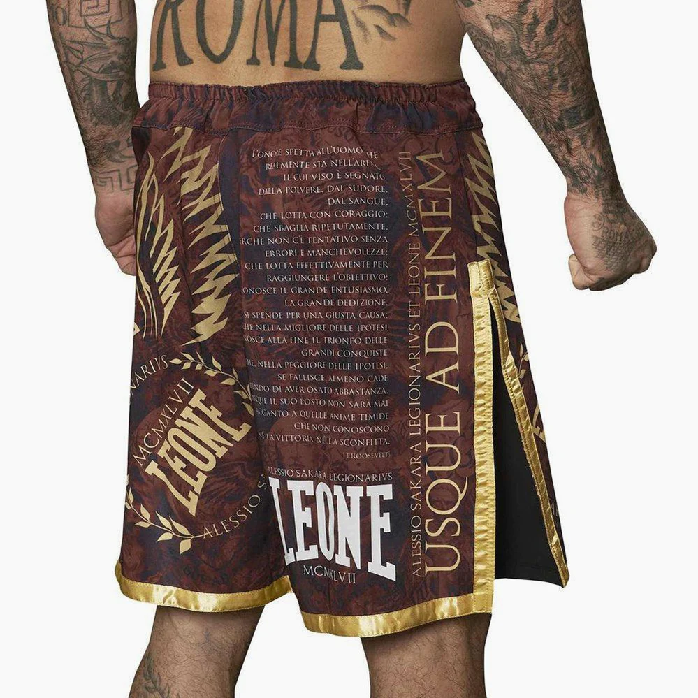 I Pantaloncini da MMA Leone Legionarius II AB790 sono così ricchi di dettagli unici da risultare un’opera d’arte. Creati dagli studenti della Facoltà di design del Politecnico di Milano, questi pantaloncini portano tutta la carica, il coraggio e la forza del grande campione italiano di MMA Alessio Sakara. Il tessuto di qualità è rivestito di dettagli dorati davvero particolari, che richiamano i tatuaggi del campione, tutti ispirati ai gladiatori romani. La fascia in vita è dotata di un velcro che li tiene fermi. Sono dotati di ampi spacchi laterali, lunghi oltre la metà della coscia. Questo consente ad ogni atleta di eseguire calci e ginocchiate, oltre ad essere più agile in gabbia. Tutto nel design di questo modello richiama all’eleganza e alla grandiosità !