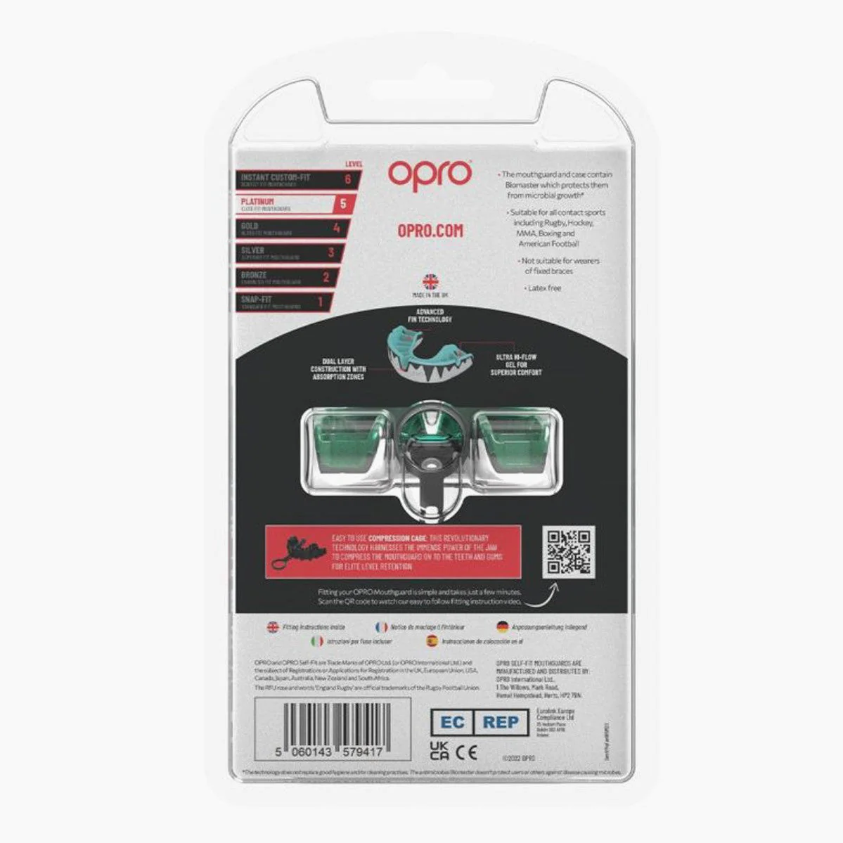 Il paradenti Opro Platinum Fangz è ideale per chi desidera una protezione di alto livello per allenamenti e competizioni. Realizzato nel Regno Unito, è dotato di struttura a doppio strato con zone di assorbimento aggiuntive, protegge efficacemente denti e gengive. Semplice da modellare, è dotato di alette interne che si modellano come desideri, seguendo il contorno dei tuoi denti e gengive. Provvisto di manico e gabbia di compressione per il modellamento, risulta pratico da utilizzare.