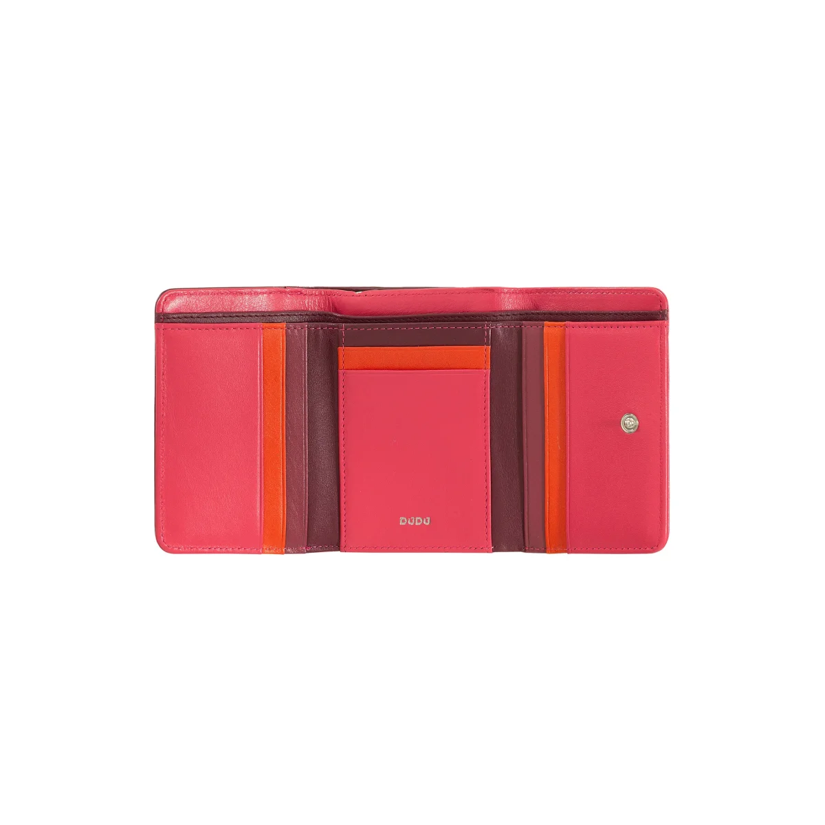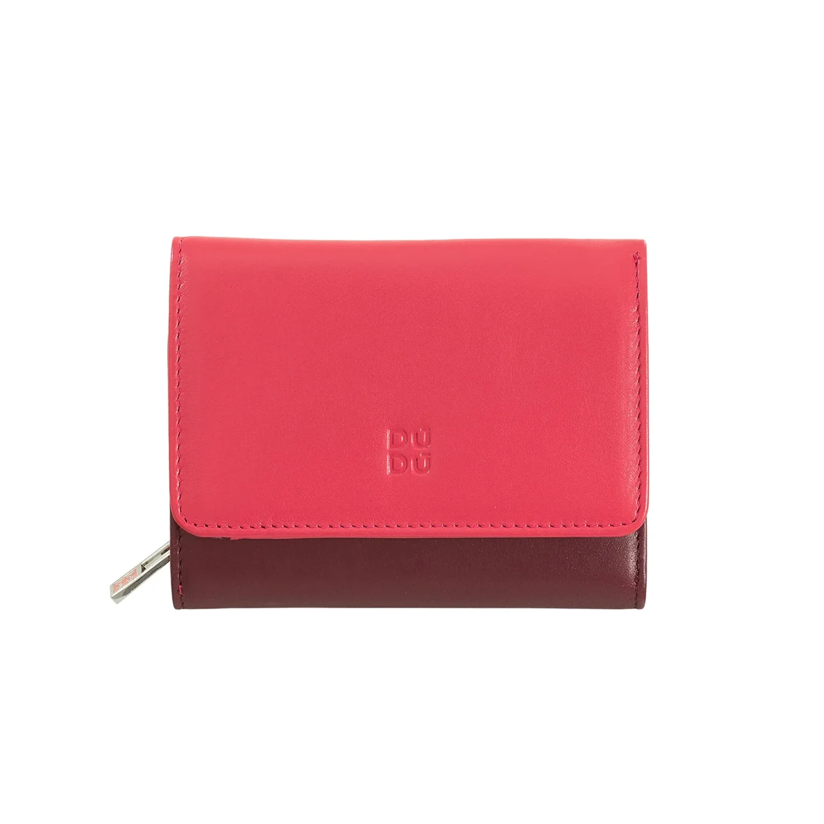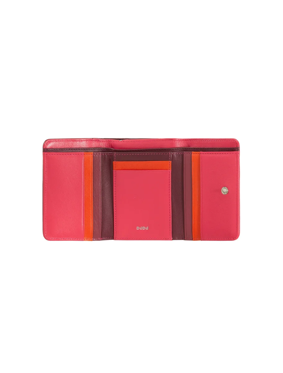 Portafoglio donna piccolo Trifold multicolore RFID realizzato in vera morbida pelle di vitello. Molteplici tasche porta carte di credito e portamonete esterno con zip a soffietto diviso in 2 scomparti. Logo DuDu smaltato esterno e cuciture a contrasto danno vita ad un portafoglio che non passerà inosservato.