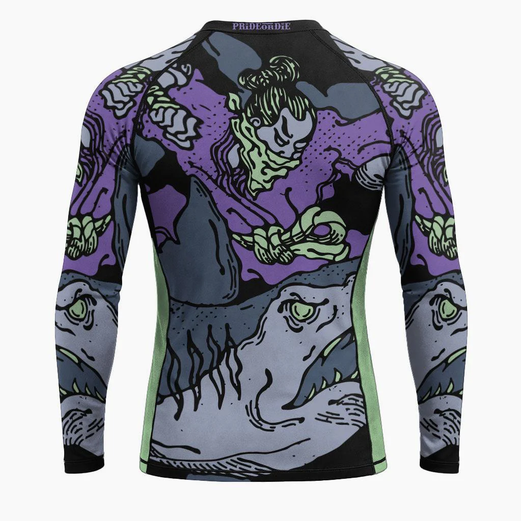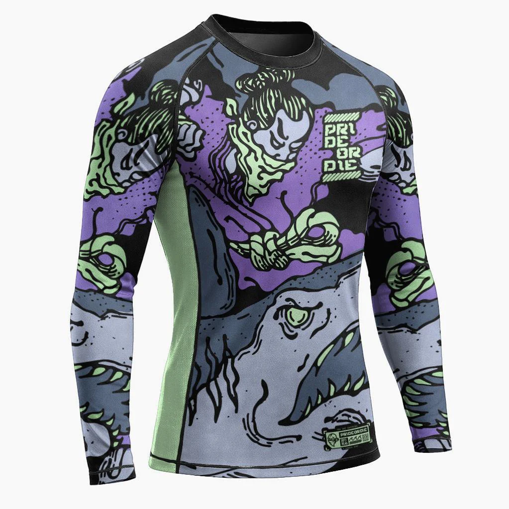 Affronta ogni round con la rashguard Pride or Die Dangerous Water V2 a maniche lunghe, perfetta per MMA, no-gi e grappling. La grafica con il samurai contro lo squalo è un richiamo a controllo mentale e superamento dei limiti, proprio come sul tatami o nell’ottagono.