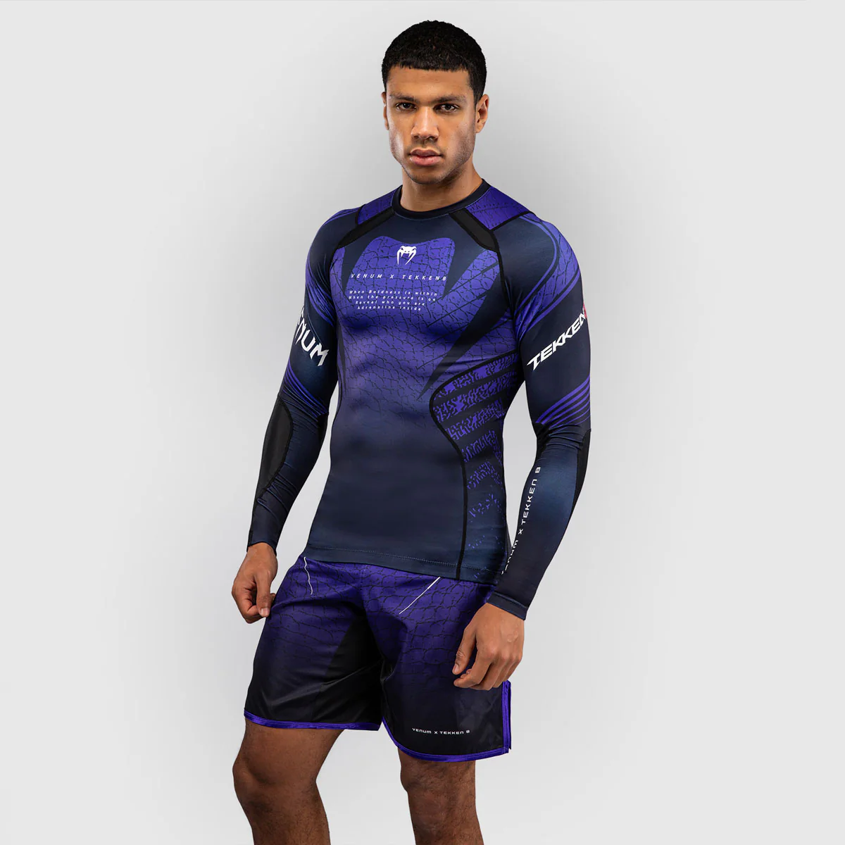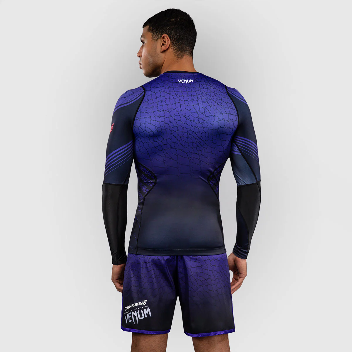 La rashguard Venum Tekken 8 Kazuya a maniche lunghe nero-viola è ideale per praticare Jiu Jitsu, grappling e MMA, altri sport da combattimento e per allenamenti fitness.