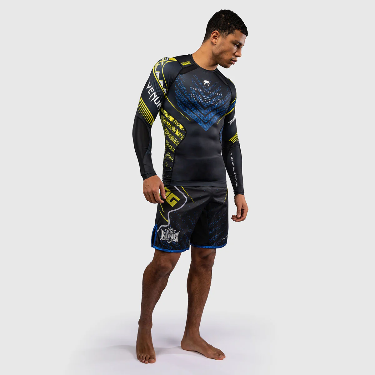 La rashguard Venum Tekken 8 King a maniche lunghe nero-giallo è ideale per la pratica di Jiu Jitsu, grappling e MMA, altri sport da combattimento e allenamenti fitness.