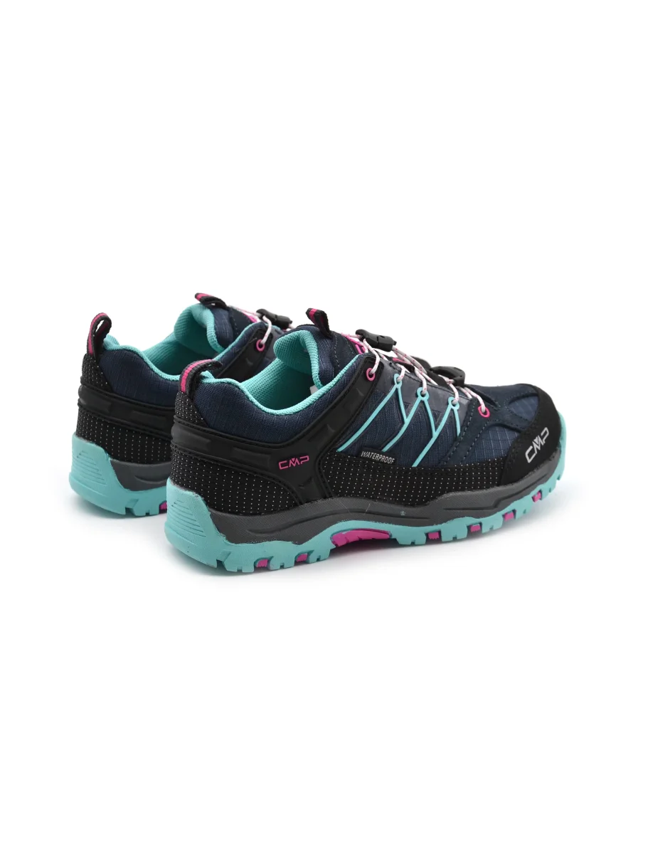 Scarpa da trekking waterproof da bimba Cmp Rigel Low in tessuto e vera pelle con membrana Clima Protect che impedisce all’acqua di entrare, sottopiede removibile in tessuto e suola Full on grip in Eva. Ideale per le passaggiate in montagna.