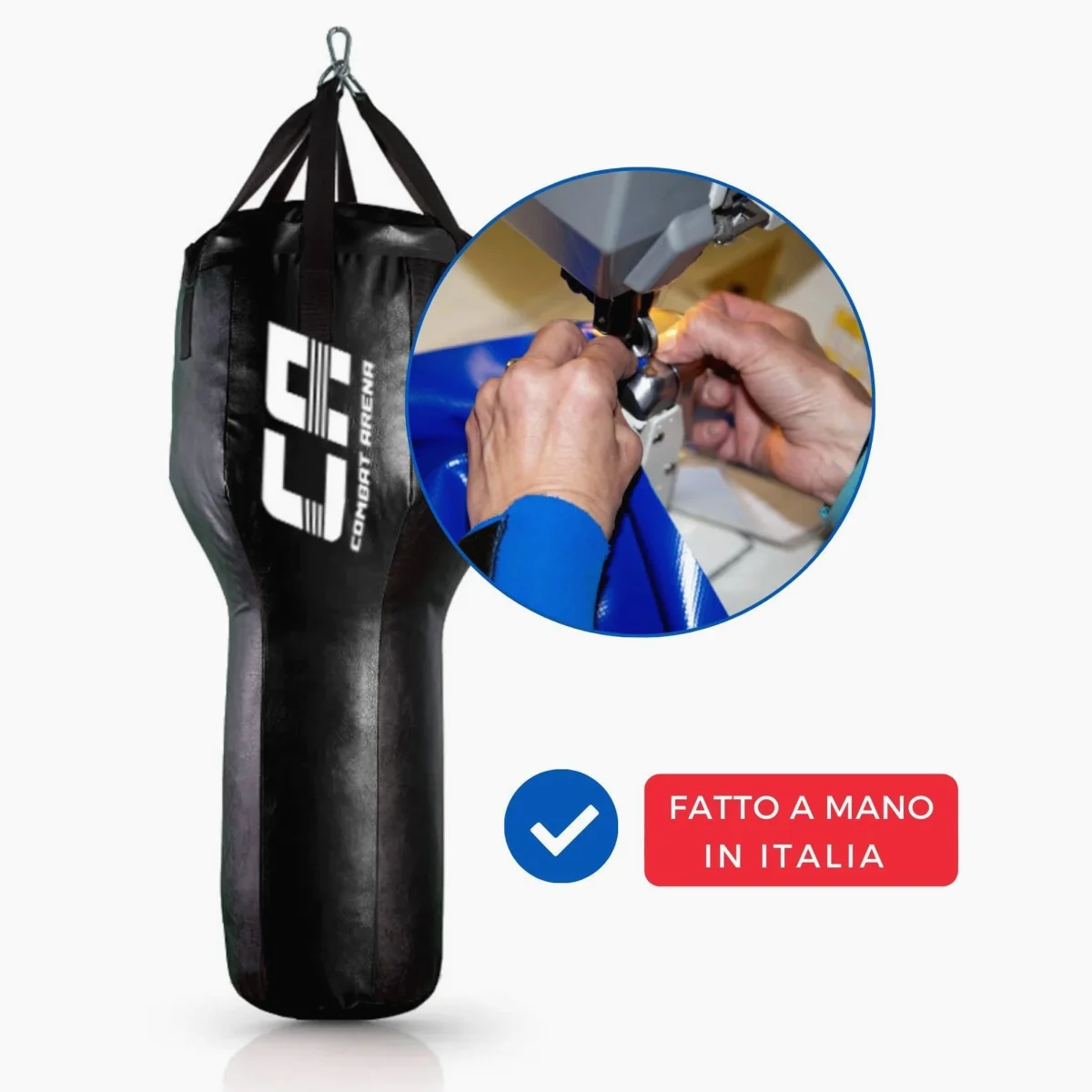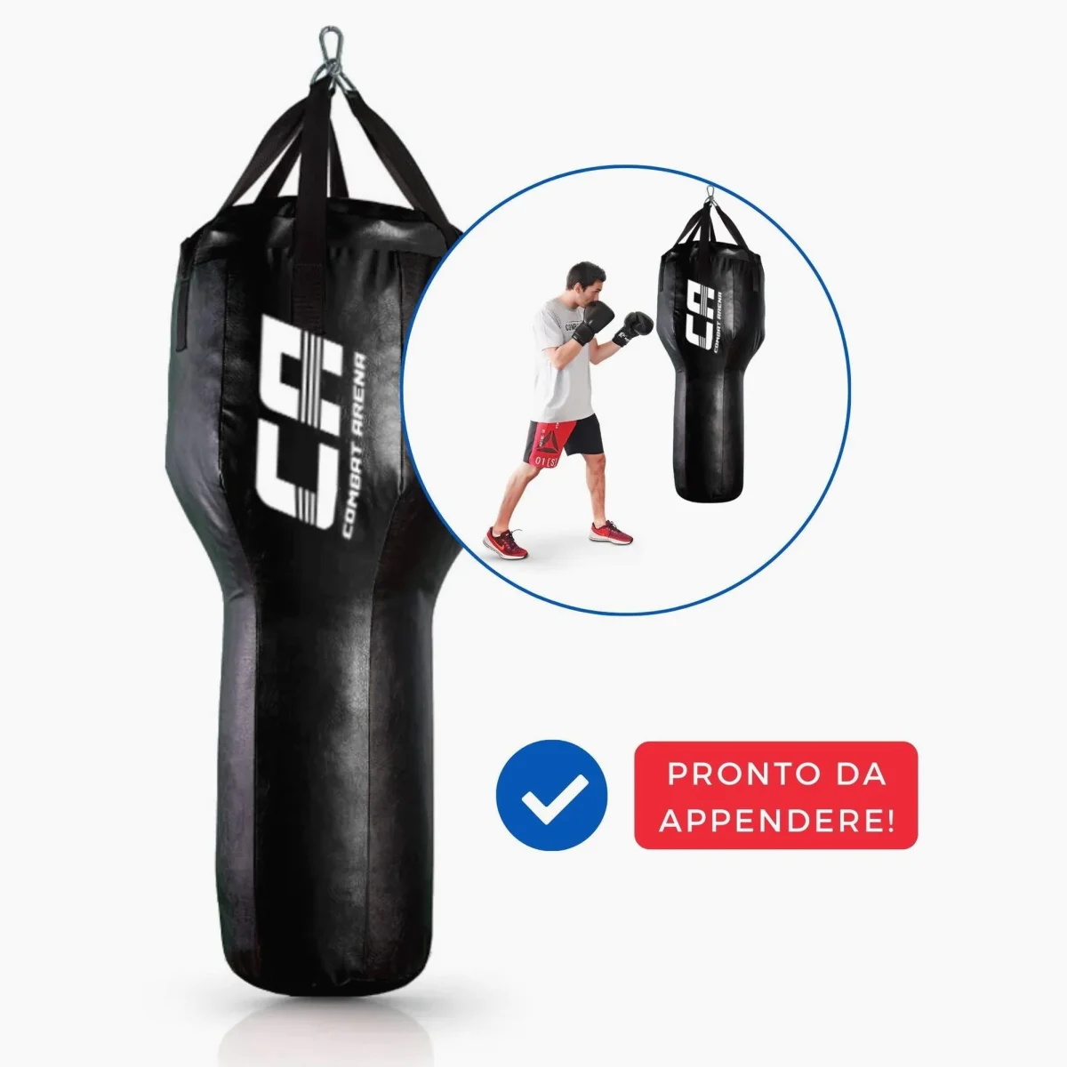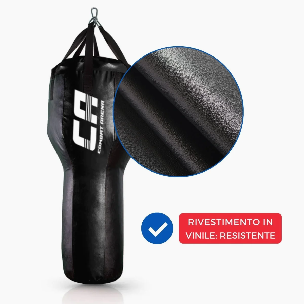 Il Sacco da allenamento a T Combat Arena Training è ideale per un allenamento più realistico e completo. La sua particolare forma a T infatti permette di allenare sia i pugni (in particolare i montanti), sia i calci. E’ realizzato in similpelle di qualità , con cuciture rinforzate e cinghie resistenti. Gli anelli a D e il moschettone in ferro zincato sono molto resistenti: perfetti per lunghe sessioni di allenamento. Prodotto italiano di Qualità artigianale, con particolare cura dei dettagli e disponibile ad un prezzo davvero competitivo.