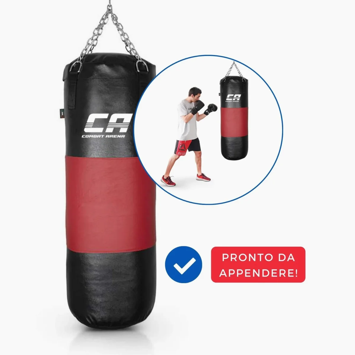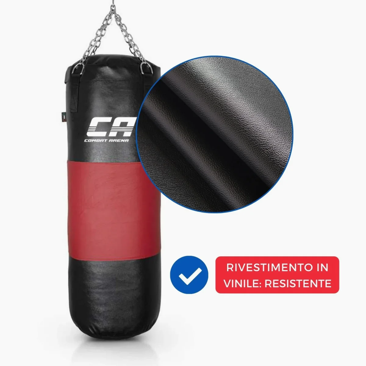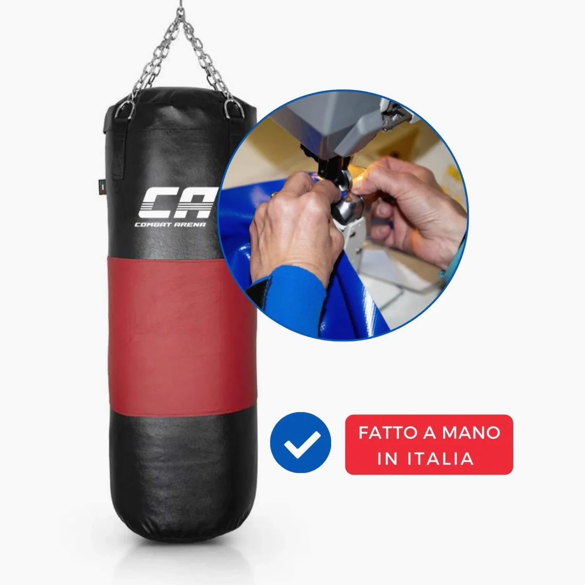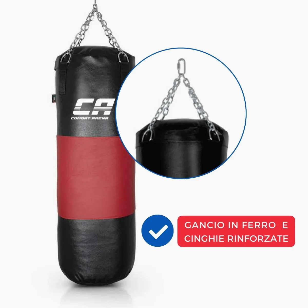 Il Sacco Combat Arena con Fascia in cuoio ha un peso di 40 kg e un’altezza di 100 cm. Prodotto artigianalmente in Italia, è un sacco da allenamento avanzato. Si distingue per la fascia centrale in cuoio e il riempimento in tessuto con aggiunta di un sacchetto di sabbia. Il sacco assorbe efficacemente i colpi e mantiene la forma nel tempo.