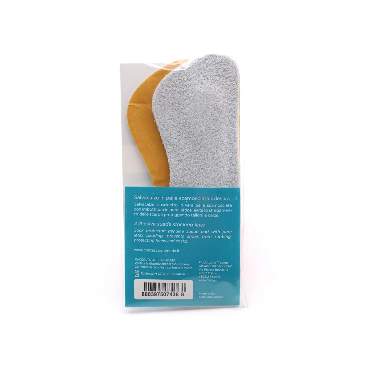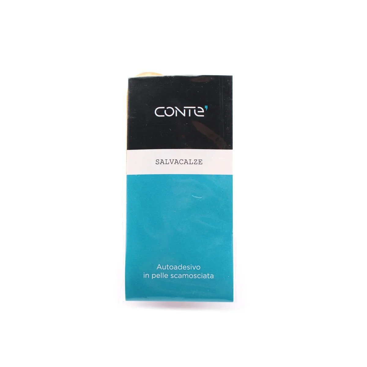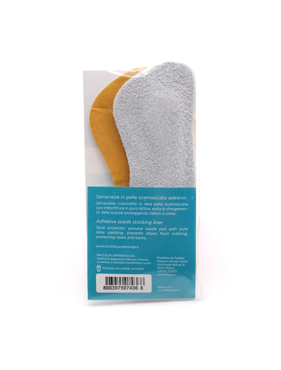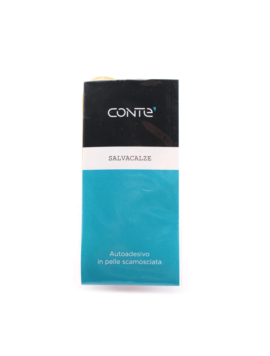 Salvacalze autoadesivo in pelle scamosciata Conte’. Cuscinetto in vera pelle scamosciata con imbottitura in puro lattice. Evita lo sfregamento delle scarpe proteggendo talloni e calze.