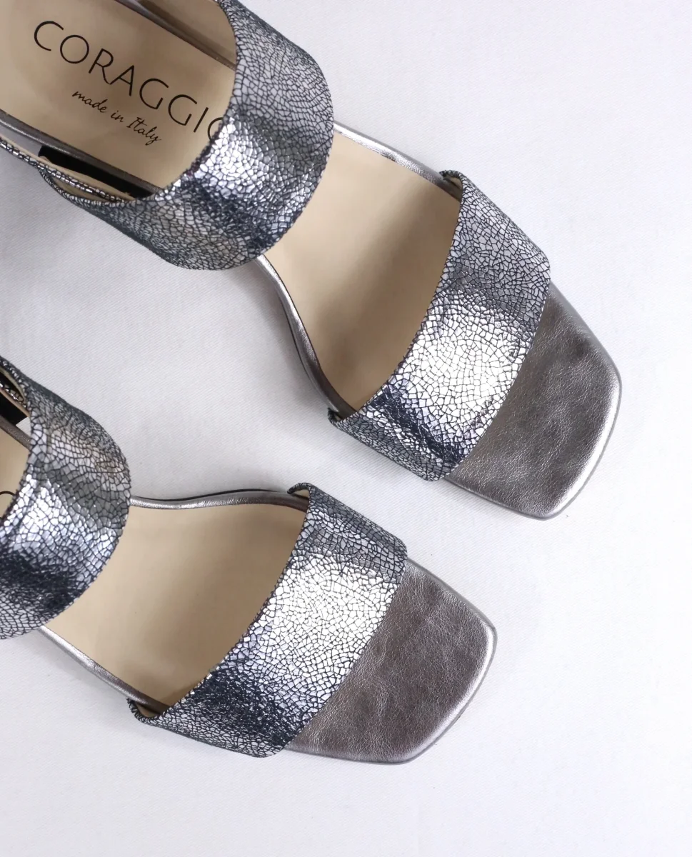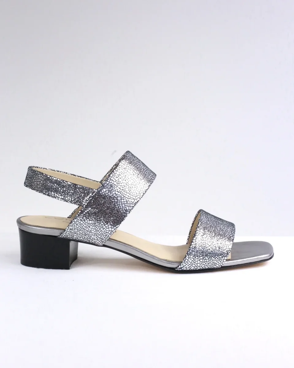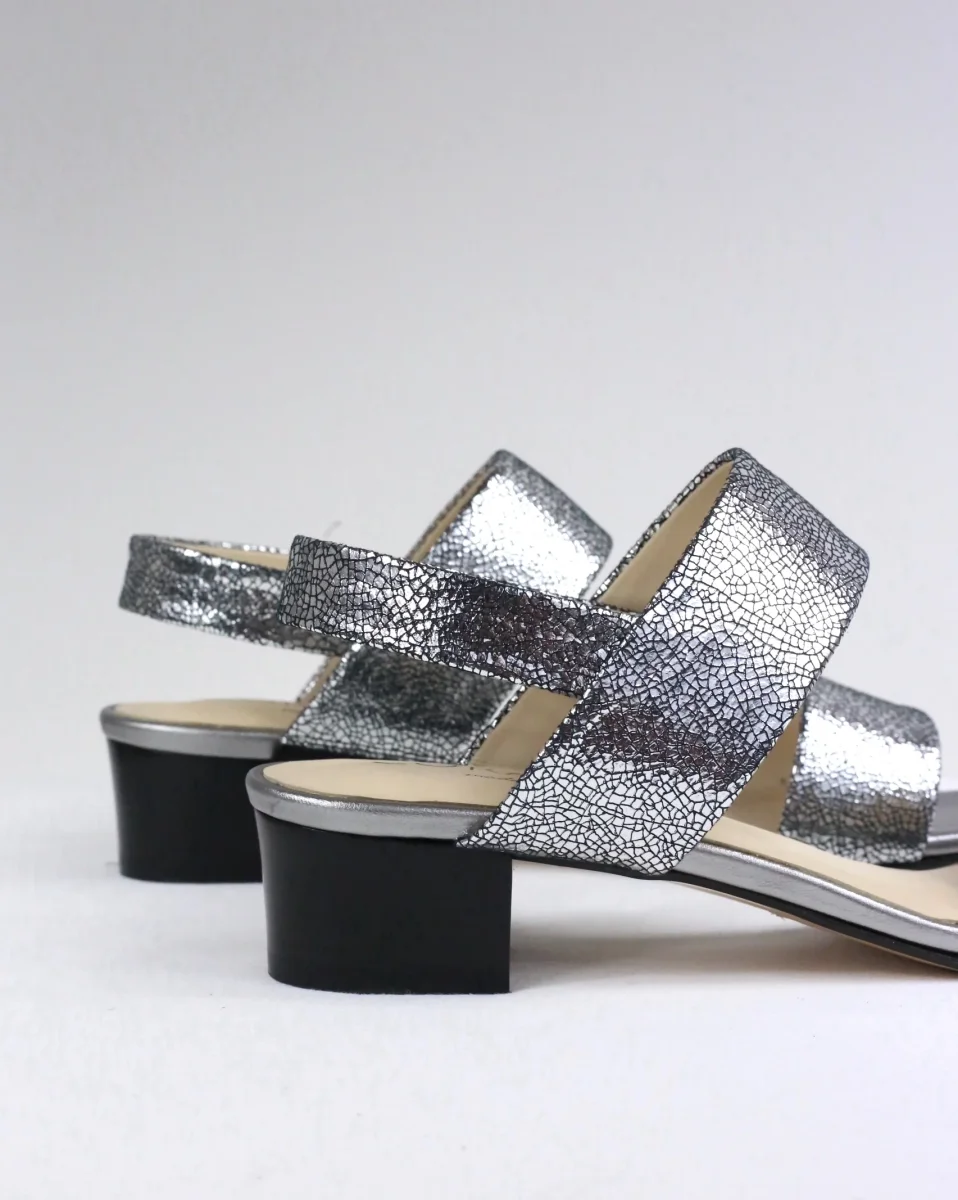 Il sandalo Madame è prodotto artigianalmente in Italia con elastico sulla fascetta superiore ed il cinturino in modo da adattarsi alla perfezione al collo del piede. Il tacco è di quattro centimetri ed è molto particolare. Disponibile anche nella variante laminata platino