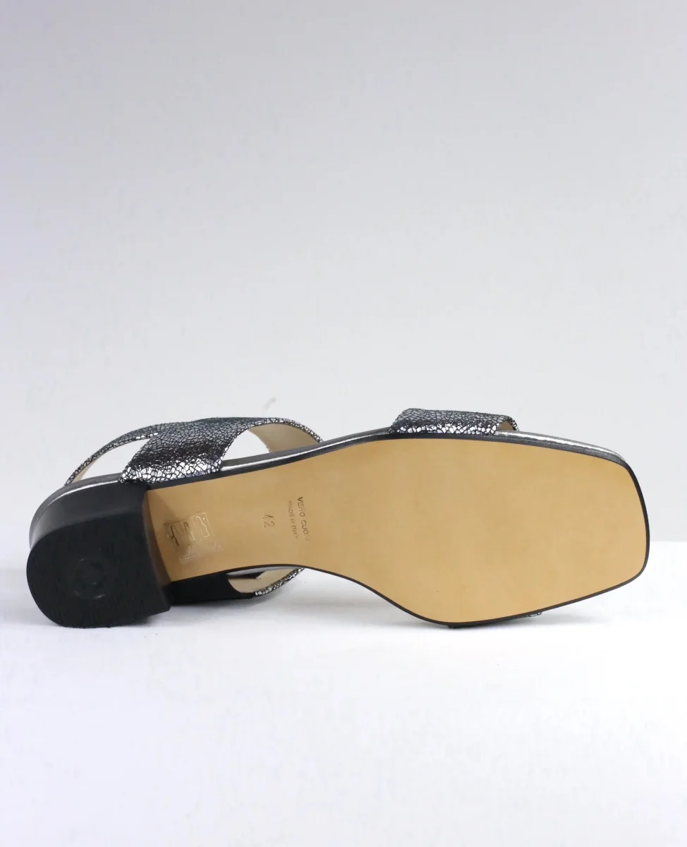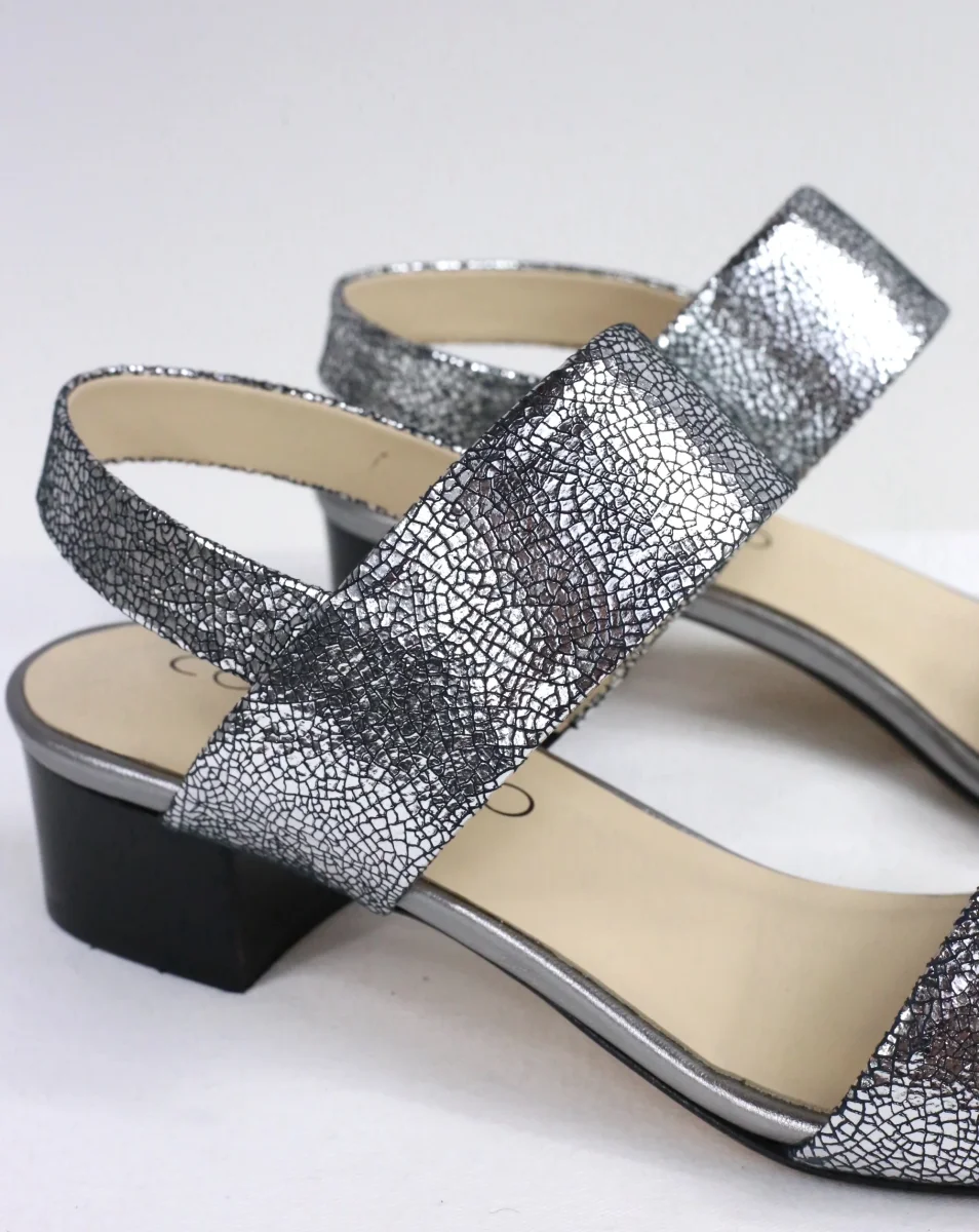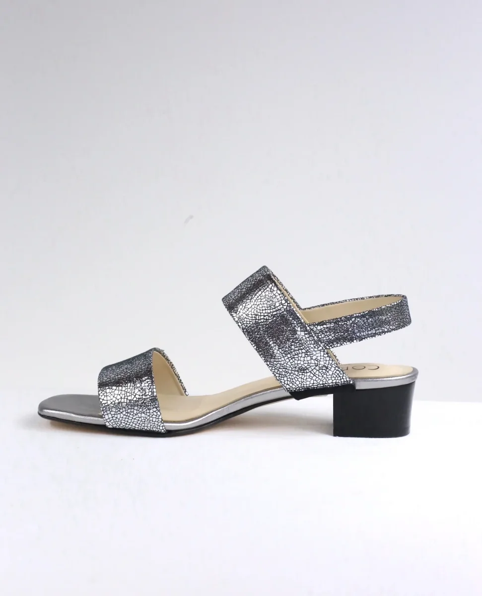 Il sandalo Madame è prodotto artigianalmente in Italia con elastico sulla fascetta superiore ed il cinturino in modo da adattarsi alla perfezione al collo del piede. Il tacco è di quattro centimetri ed è molto particolare. Disponibile anche nella variante laminata platino
