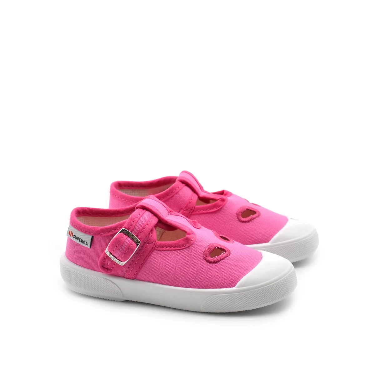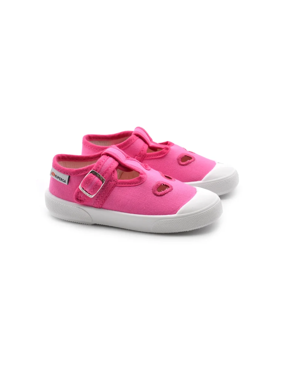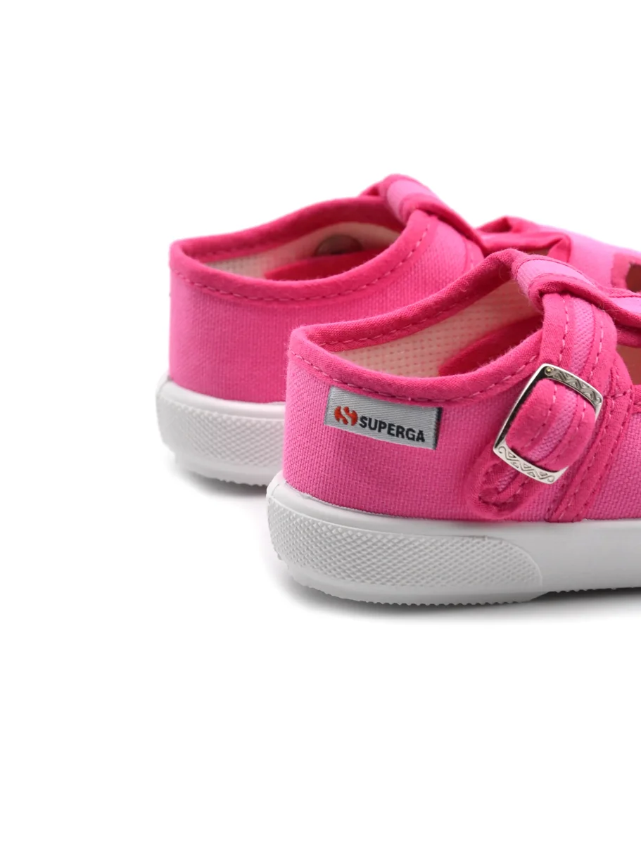 Sandalo primi passi da bimba Superga made in Italy in tessuto con puntale in gomma, sottopiede removibile in vera pelle, suola in gomma e chiusura con fibbia.