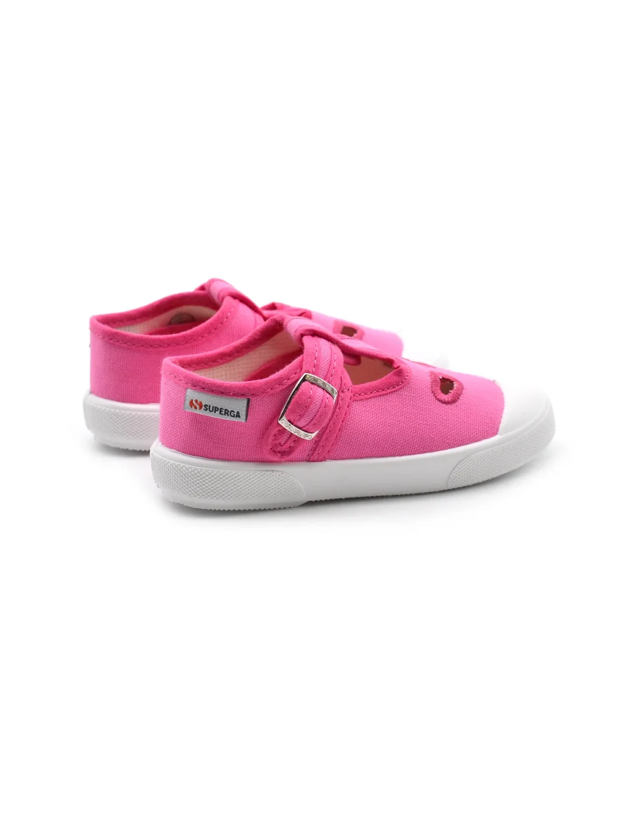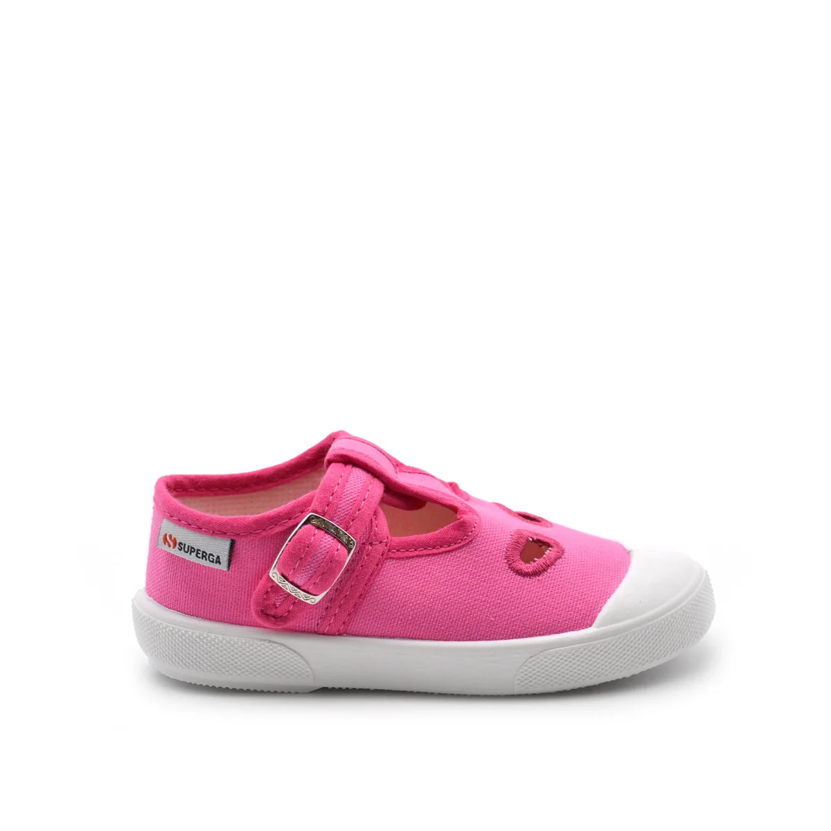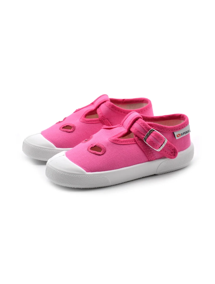 Sandalo primi passi da bimba Superga made in Italy in tessuto con puntale in gomma, sottopiede removibile in vera pelle, suola in gomma e chiusura con fibbia.