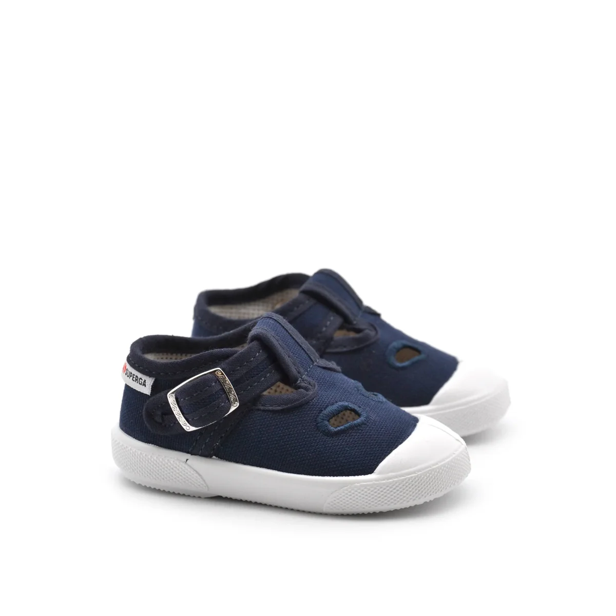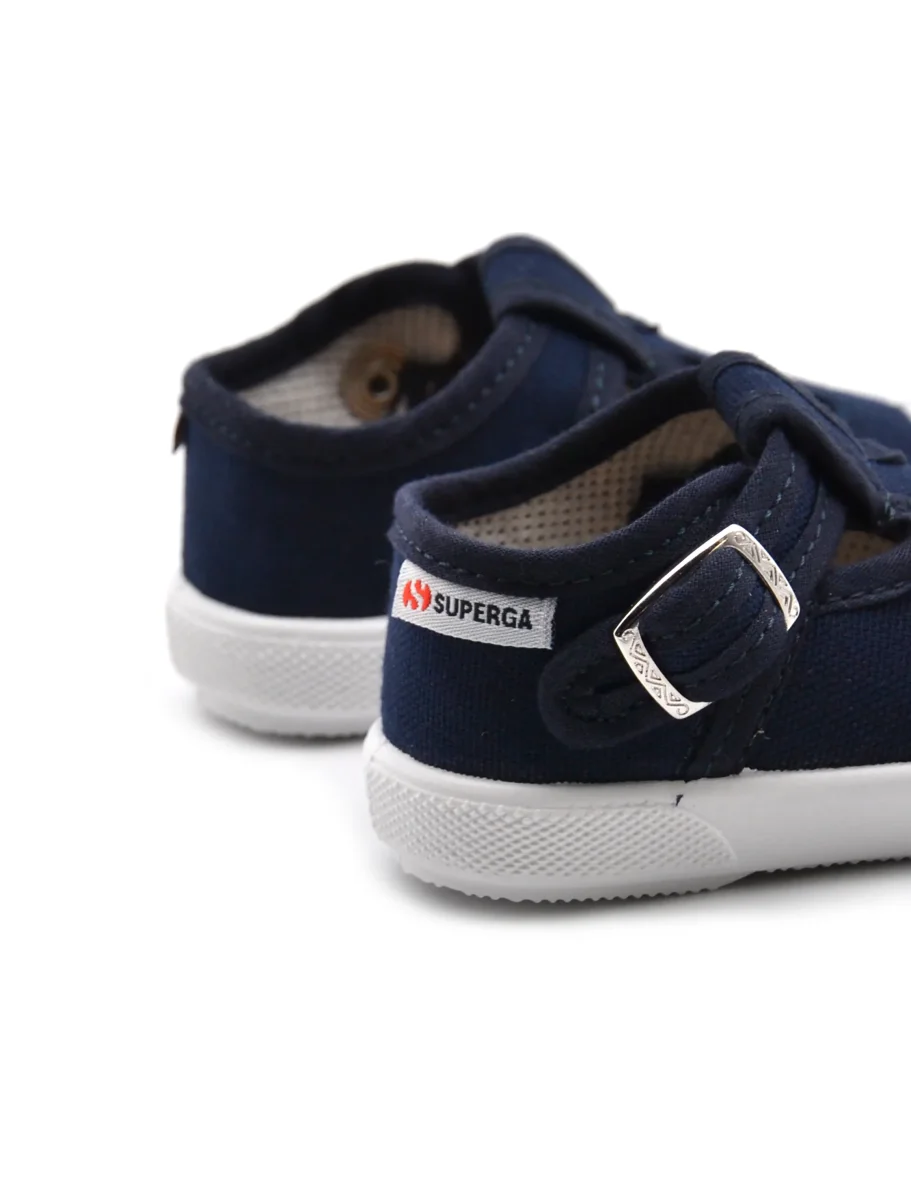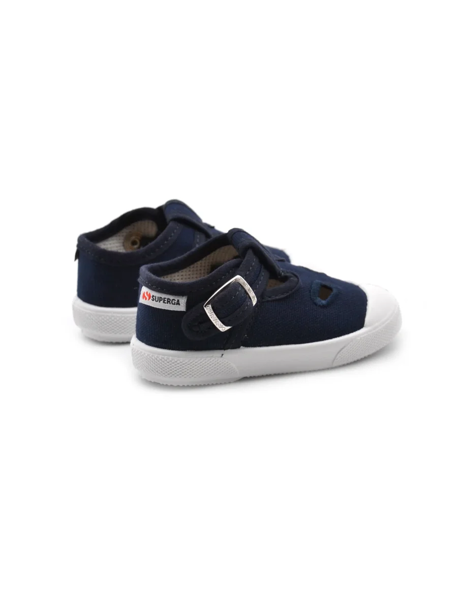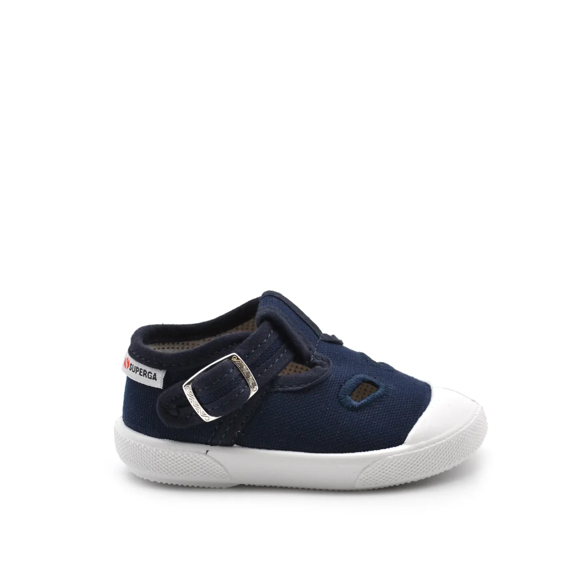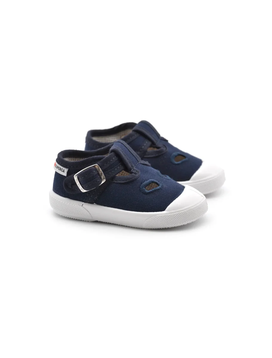 Sandalo primi passi da bimbo Superga made in Italy in tessuto con puntale in gomma, sottopiede removibile in vera pelle, suola in gomma e chiusura con fibbia.