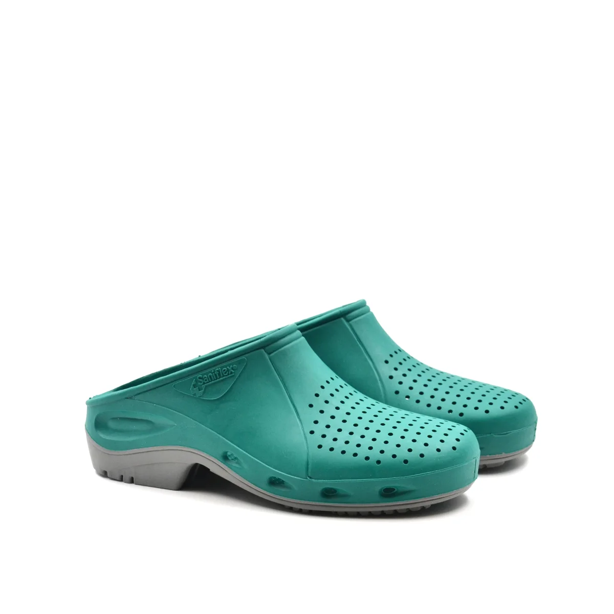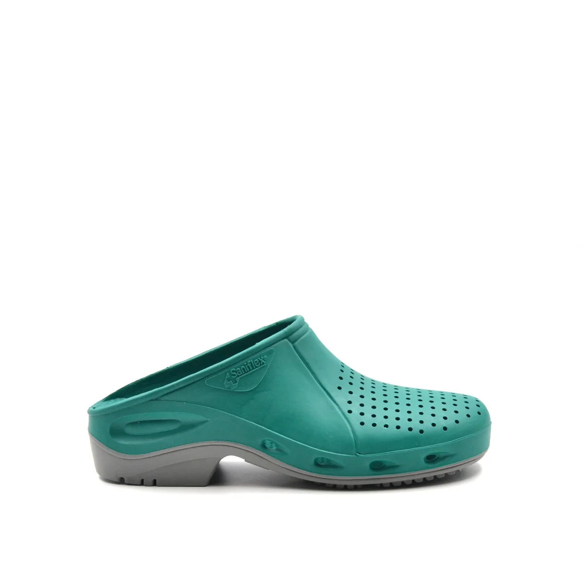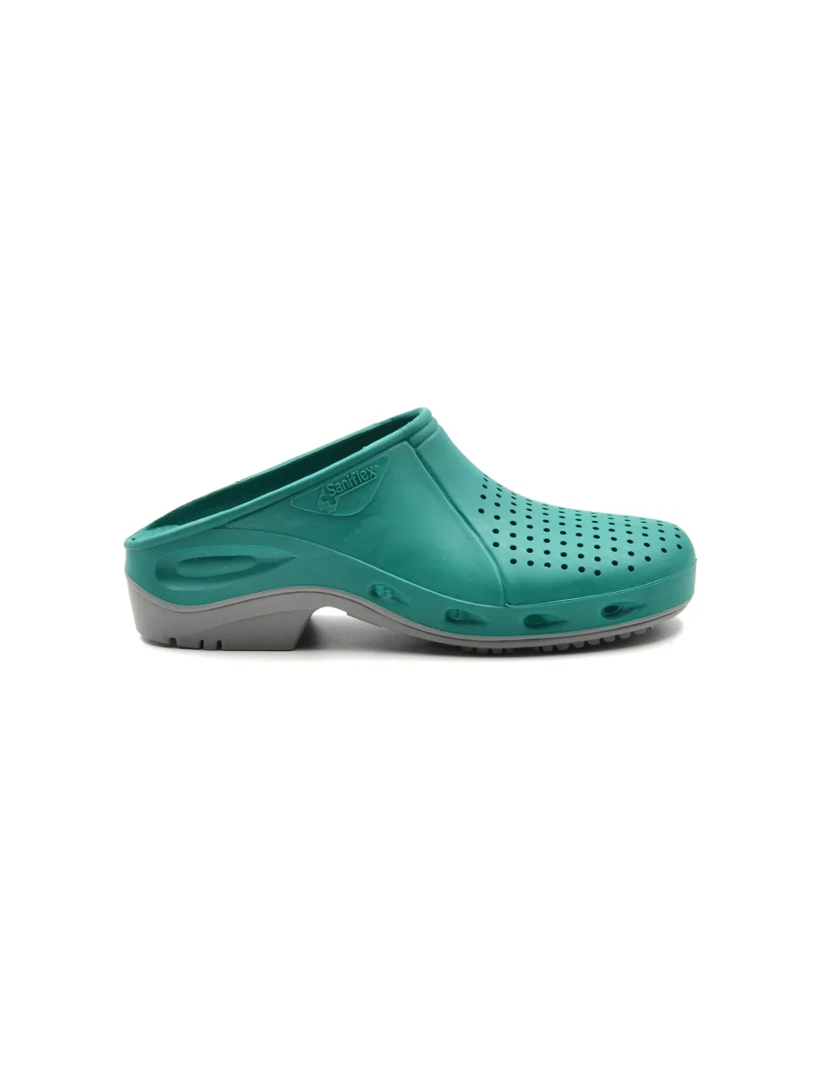 Ciabatta sanitaria da donna SaniFlex made in Italy in gomma traforata. La suola è antiscivolo e antistatica. E’ sterilizzabile in autoclave a 134°C o in lavatrice 60° e risponde ai requisiti della nuova normativa EN ISO 20347:2012 / OB A E-SRA