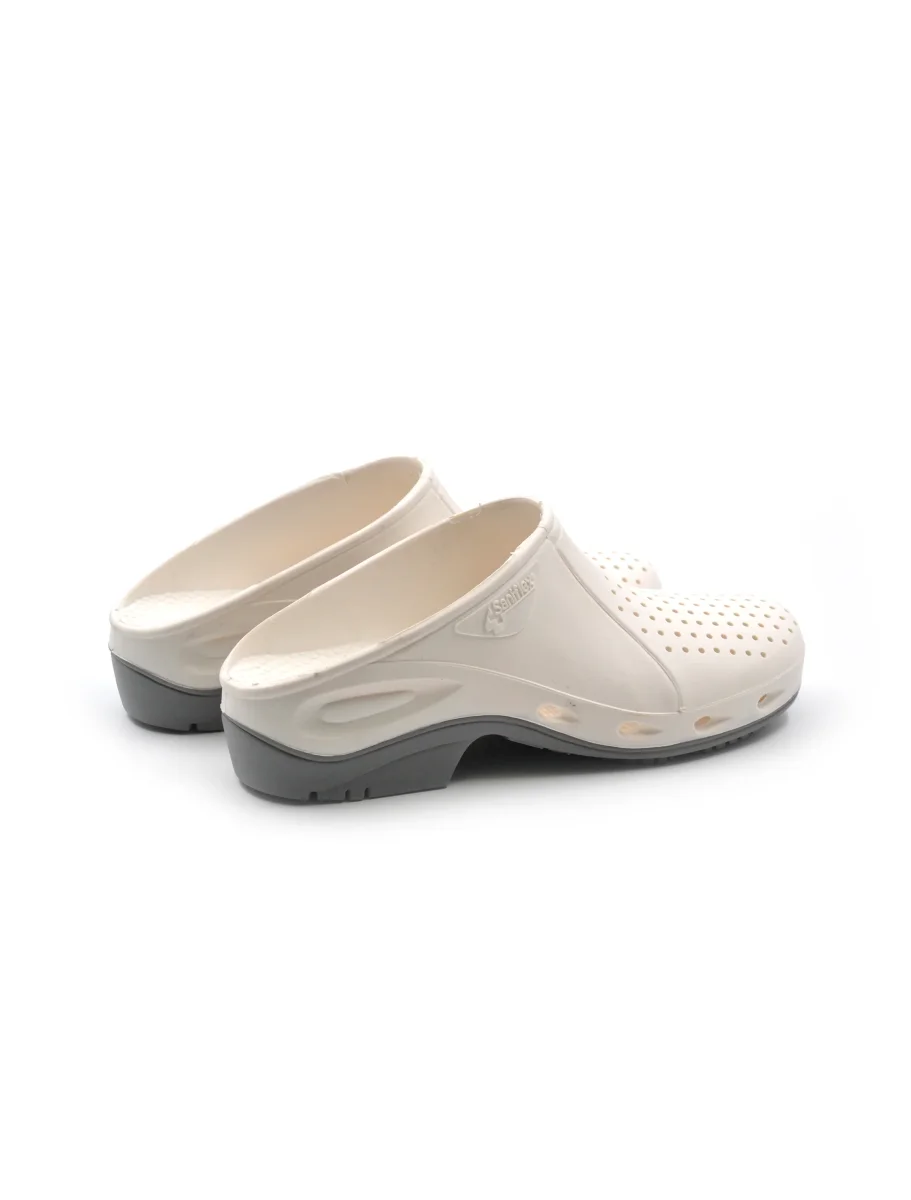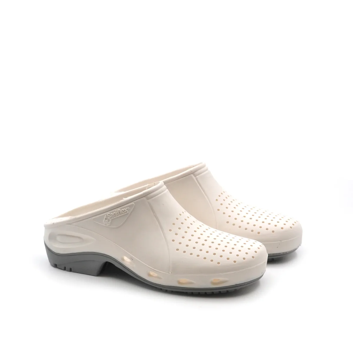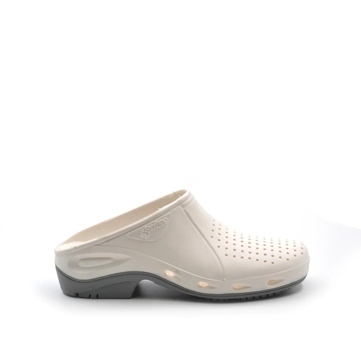 Ciabatta sanitaria da donna SaniFlex made in Italy in gomma traforata. La suola è antiscivolo e antistatica. E’ sterilizzabile in autoclave a 134°C o in lavatrice 60° e risponde ai requisiti della nuova normativa EN ISO 20347:2012 / OB A E-SRA