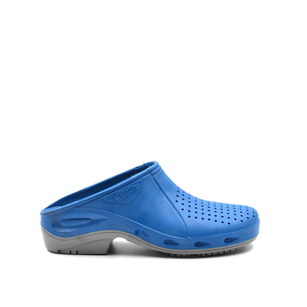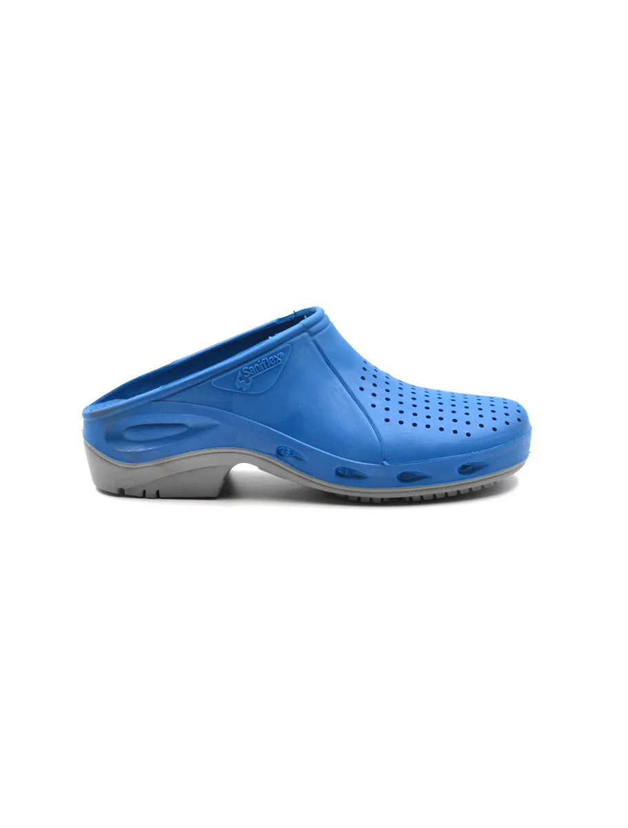 Ciabatta sanitaria da uomo SaniFlex made in Italy in gomma traforata. La suola è antiscivolo e antistatica. E’ sterilizzabile in autoclave a 134°C o in lavatrice 60° e risponde ai requisiti della nuova normativa EN ISO 20347:2012 / OB A E-SRA