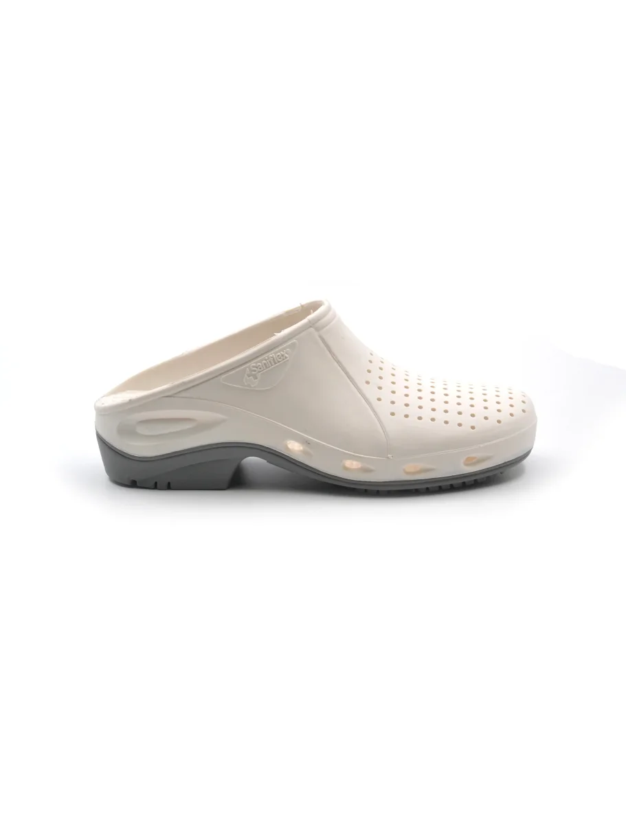 Ciabatta sanitaria da uomo SaniFlex made in Italy in gomma traforata. La suola è antiscivolo e antistatica. E’ sterilizzabile in autoclave a 134°C o in lavatrice 60° e risponde ai requisiti della nuova normativa EN ISO 20347:2012 / OB A E-SRA
