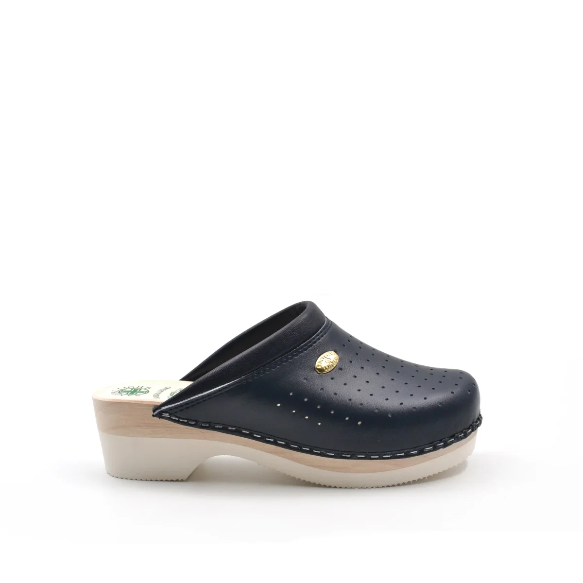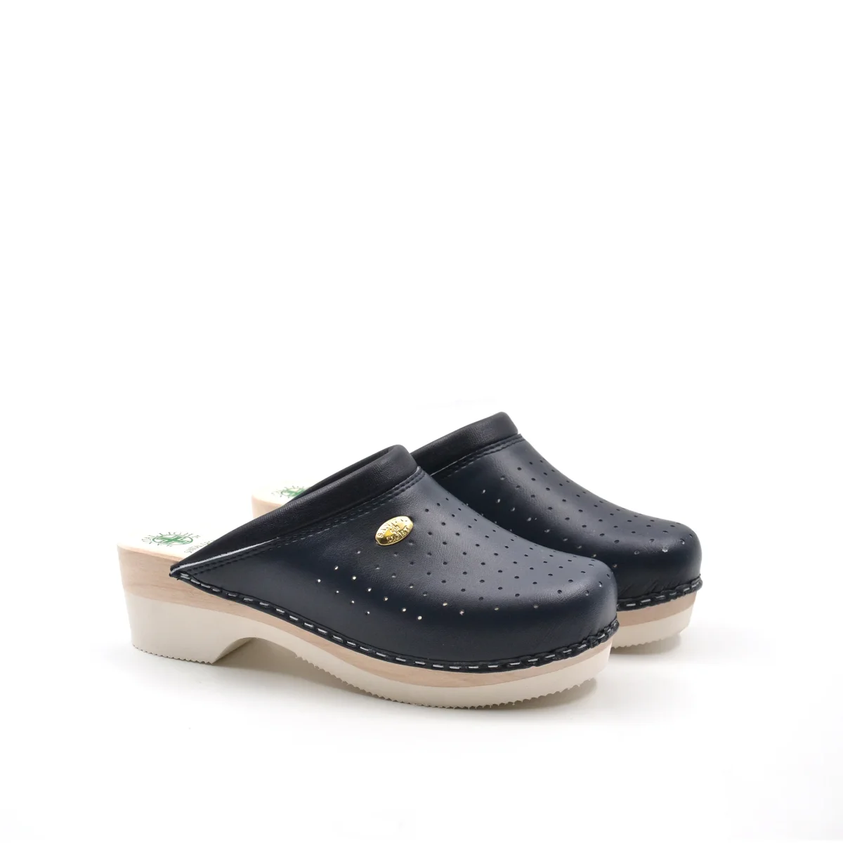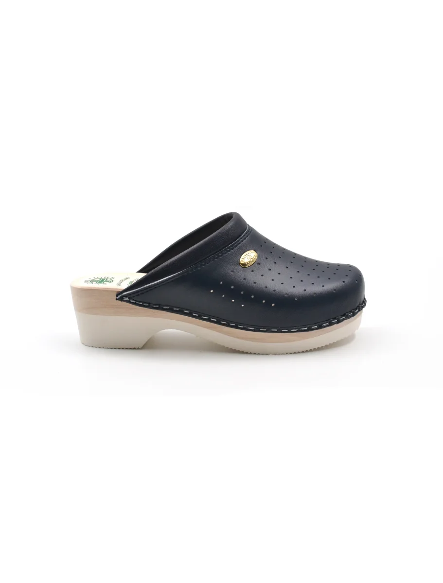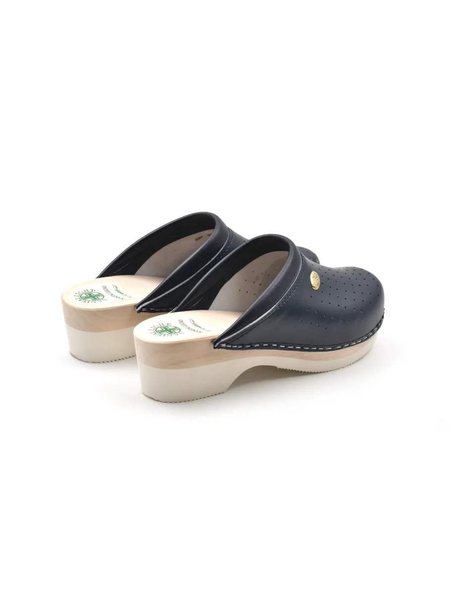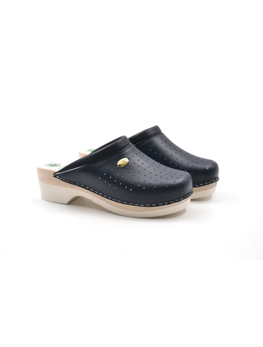 Ciabatta sanitaria da donna Sanital Light in vera pelle traforata con sottopiede il legno naturale e fondo in gomma antiscivolo.