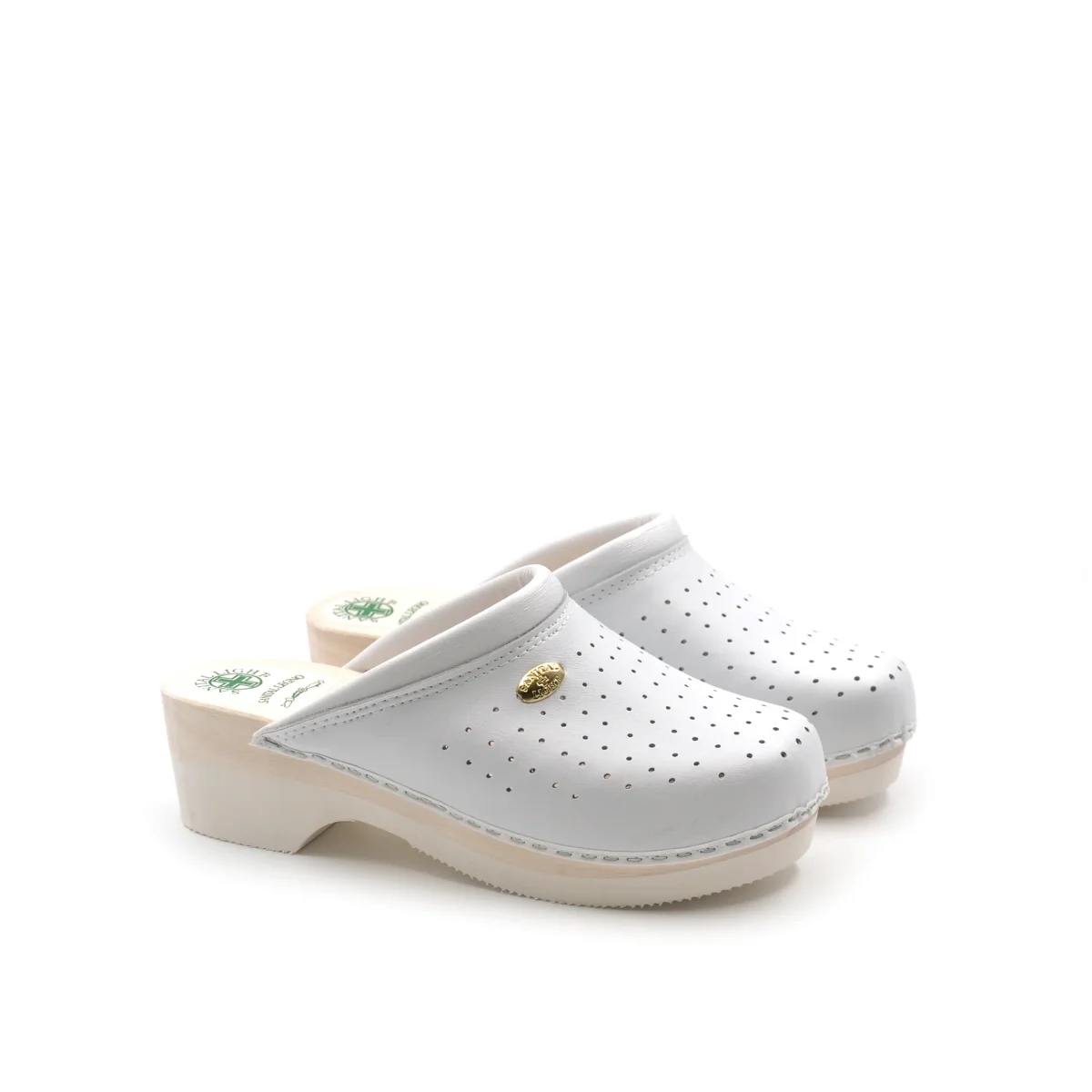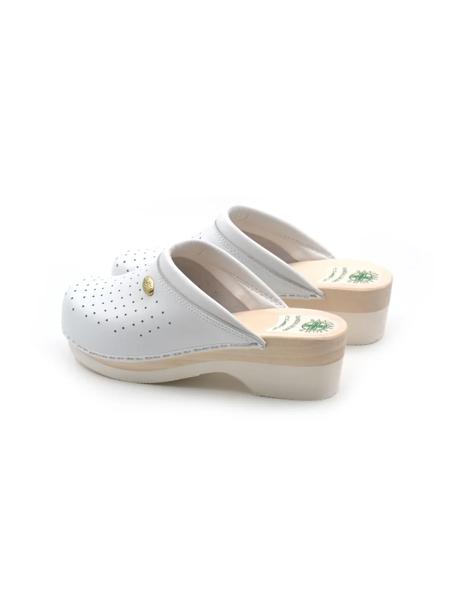 Ciabatta sanitaria da donna Sanital Light in vera pelle traforata con sottopiede il legno naturale e fondo in gomma antiscivolo.