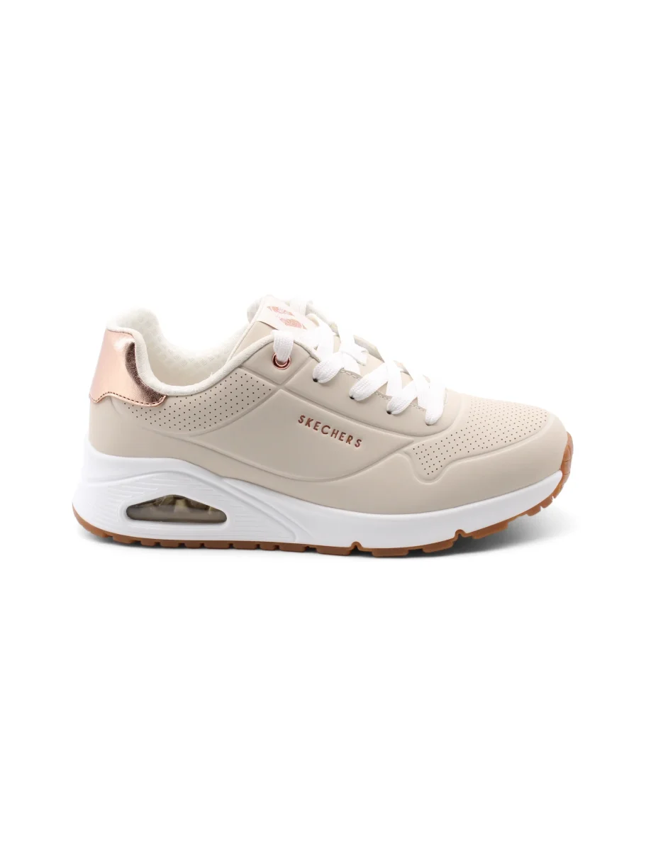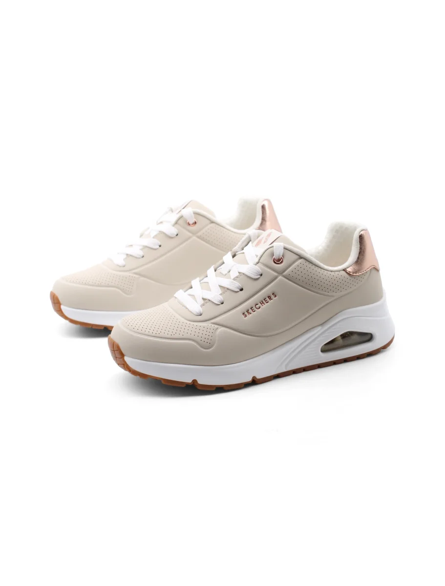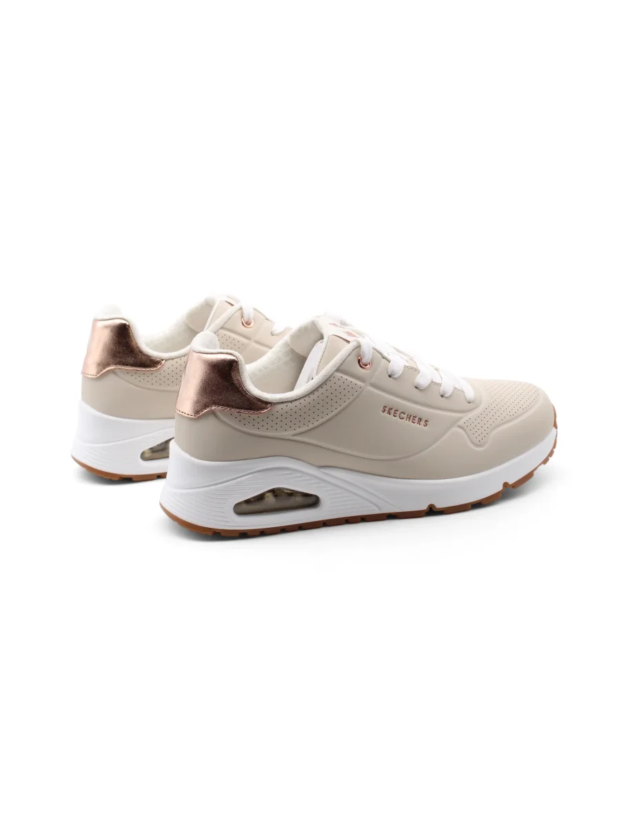 La Shimmer Away di Skechers è una sneaker da donna che combina stile e comfort con semplicità . La chiusura a lacci permette una calzata personalizzata e sicura, ideale per chi cerca praticità senza rinunciare a un tocco di femminilità . All’interno, la fodera in tessuto assicura una sensazione morbida e traspirante durante tutta la giornata. Il plantare fisso offre un sostegno stabile, pensato per mantenere il piede ben posizionato senza compromessi. La suola in gomma garantisce un’ottima aderenza su diverse superfici, rendendo ogni passo più sicuro. Il tacco da 5 cm regala una leggera altezza, perfetta per chi desidera un po’ di slancio in più senza rinunciare alla comodità . È una scelta affidabile per chi vuole una sneaker versatile, che accompagna con naturalezza sia momenti più rilassati che occasioni casual.