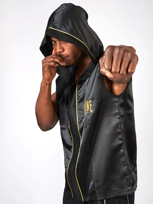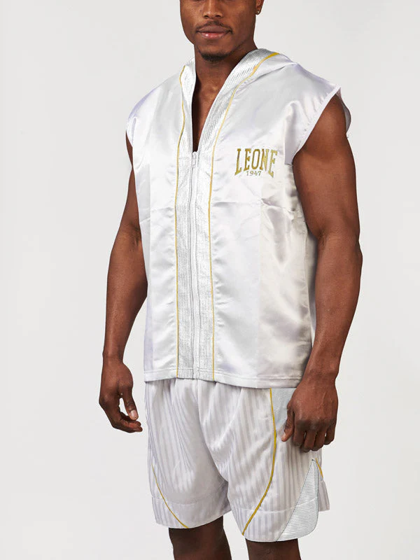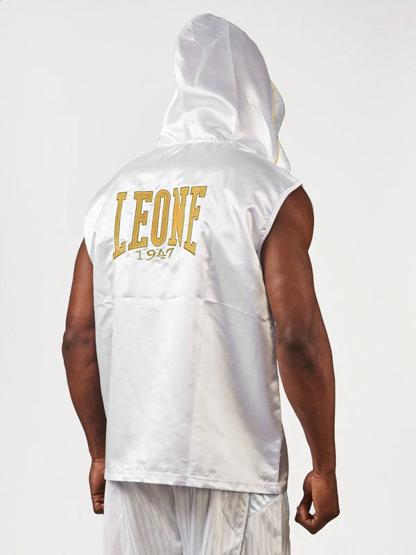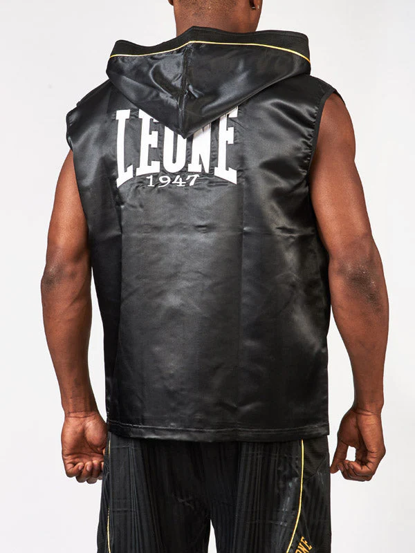 Indossa lo Smanicato da ring Leone Premium e fai la tua entrata sul ring con grande stile. Ideale in abbinata ai pantaloncini della linea Premium, lo smanicato AB261 è realizzato in un tessuto misto poliestere e satin, lucido e morbido sulla pelle. Il logo e dettagli dorati impreziosiscono il capo sulla parte frontale e sul cappuccio, rendendolo perfetto per i pugili che amano eleganza e ricercatezza.