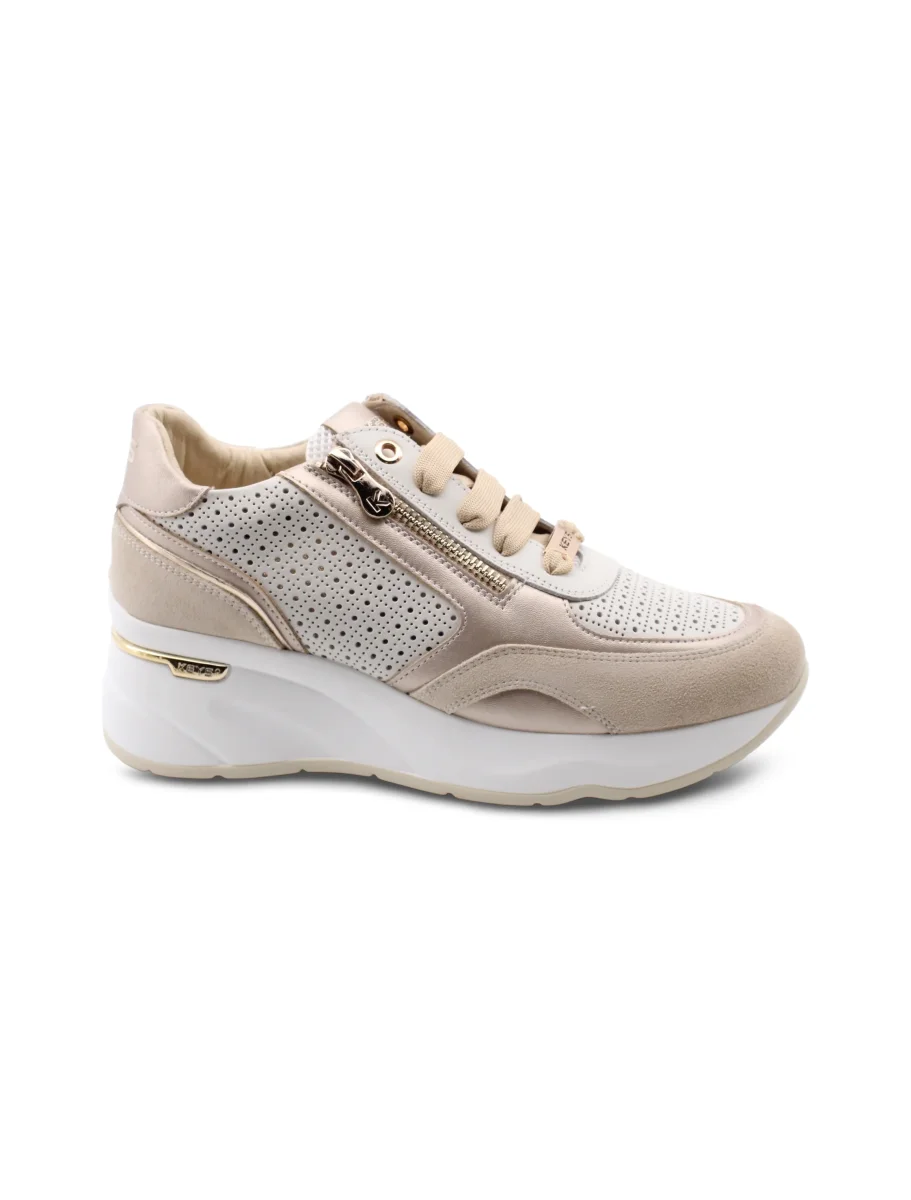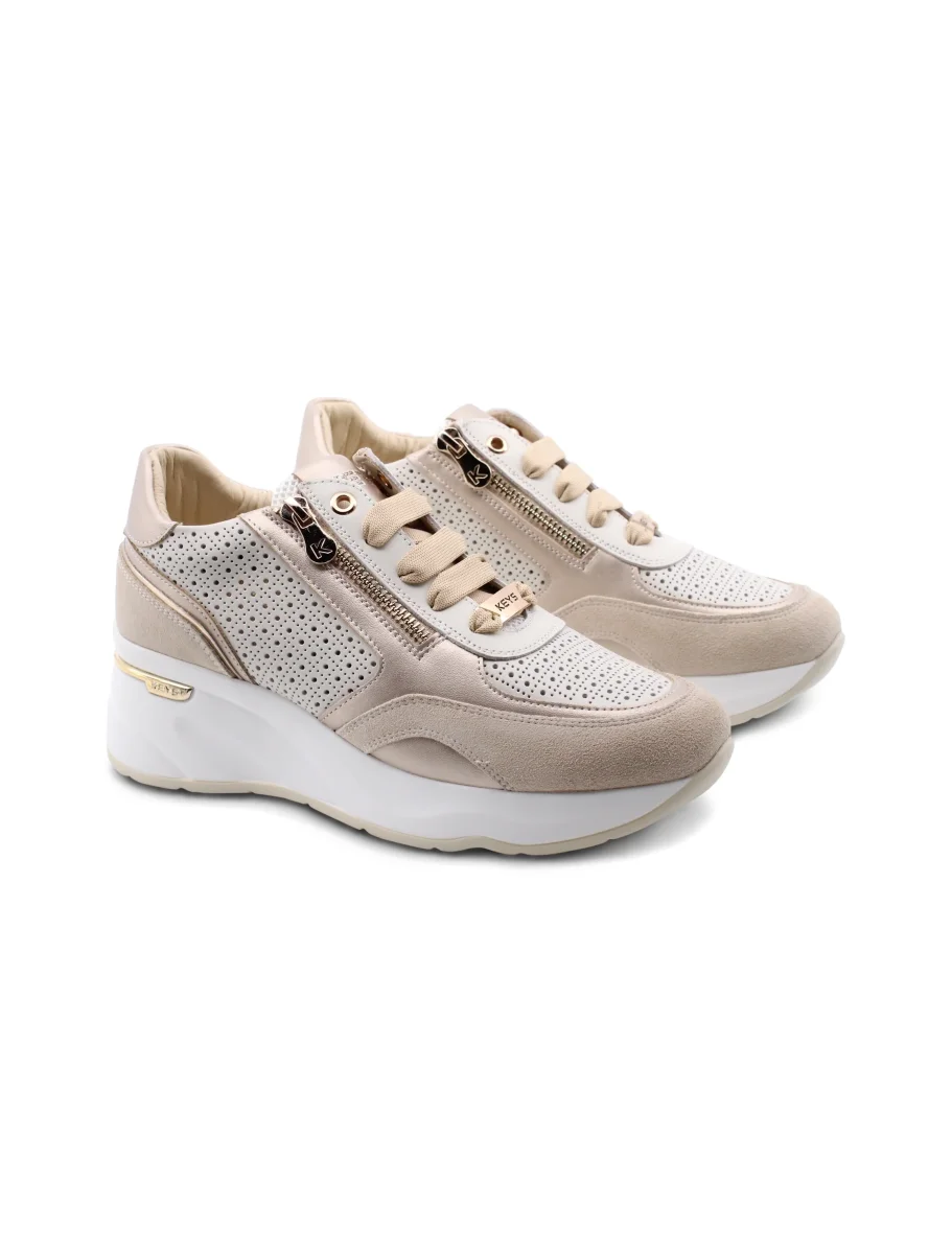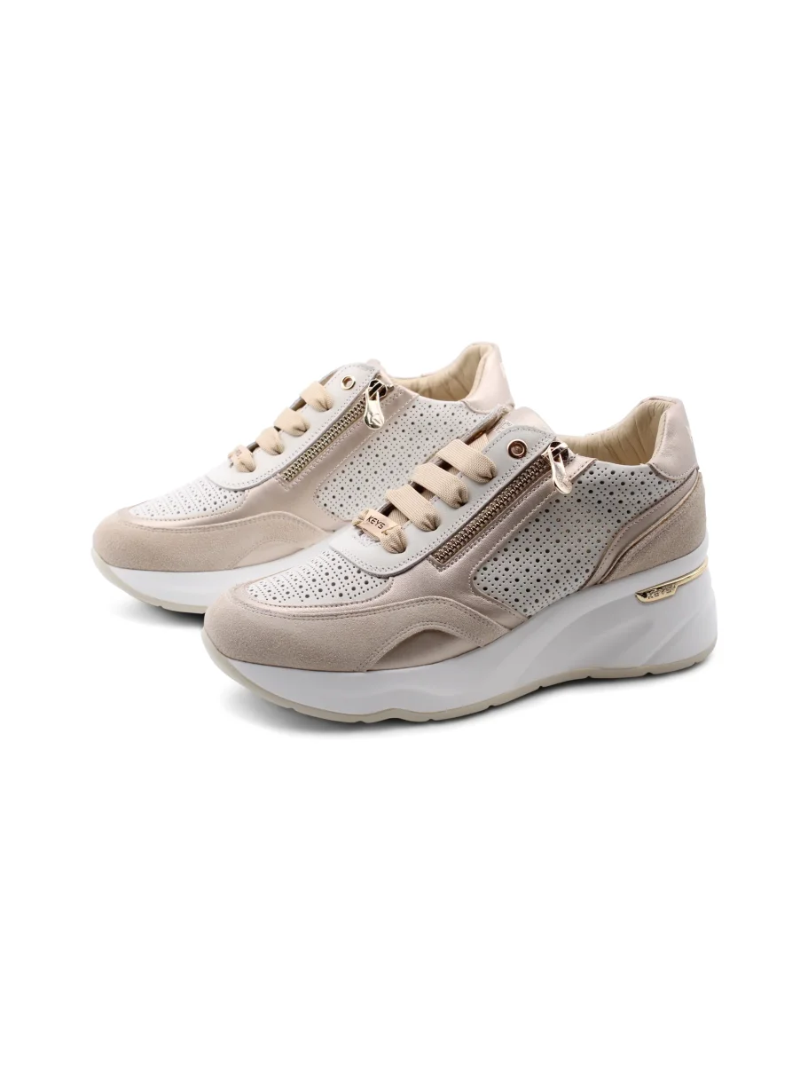 Questa sneaker con zeppa da 6,5 cm ti offre il giusto mix di stile e comodità , senza rinunciare a un tocco di personalità . Il plateau di 2,5 cm bilancia perfettamente l’altezza, rendendo la camminata più stabile e confortevole. La chiusura combinata con lacci e doppia zip ti permette di indossarle e toglierle facilmente, adattandole al meglio al tuo piede. All’interno, la fodera mix di pelle e tessuto garantisce freschezza e morbidezza, mentre il sottopiede in pelle assicura una sensazione naturale e respirante durante tutto il giorno. Il plantare è removibile, così puoi sostituirlo con un modello personalizzato se preferisci o semplicemente arieggiare la scarpa. Perfette per chi cerca una sneaker con un tocco femminile e praticità senza complicazioni.