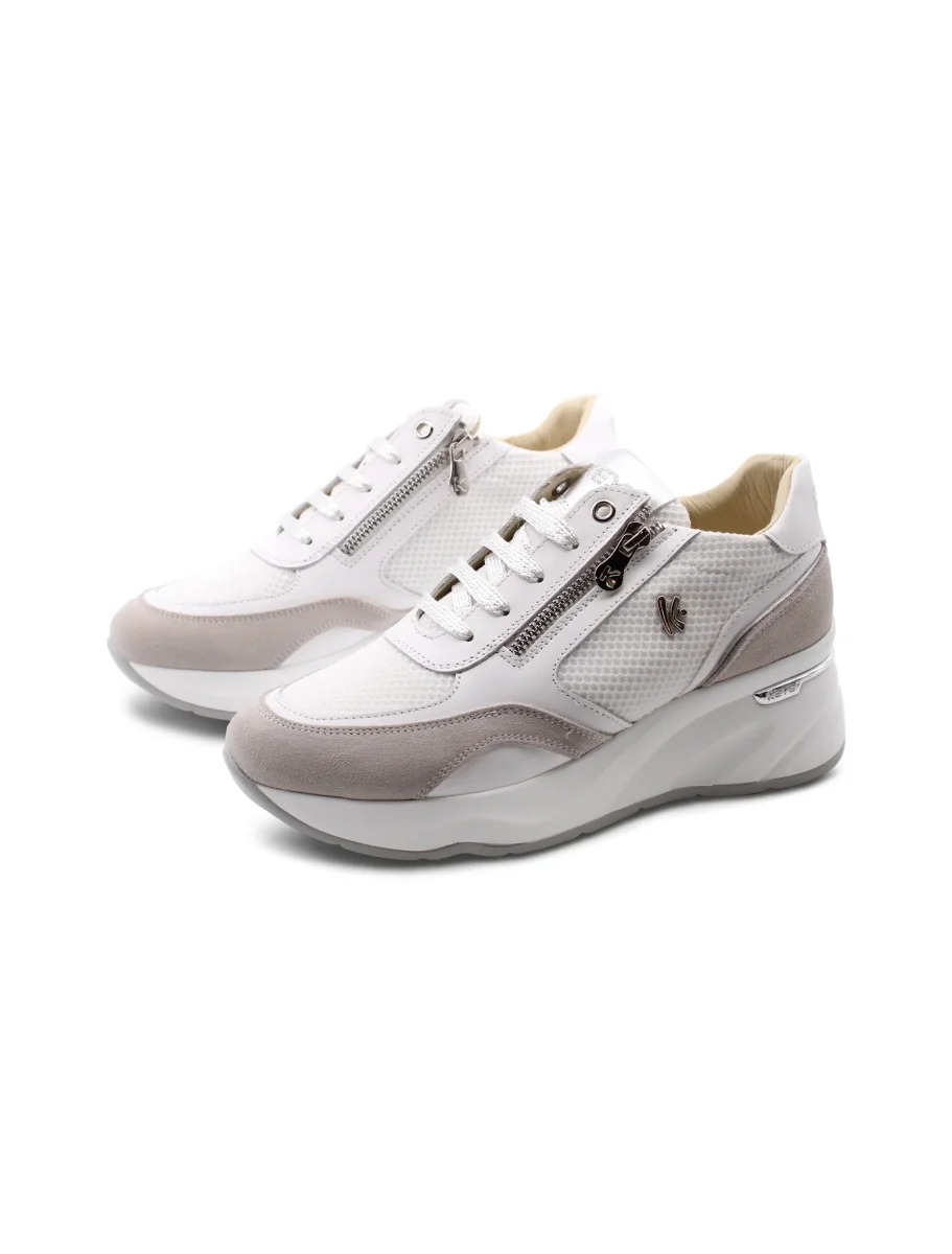 Questa sneaker con zeppa da 6,5 cm e un plateau di 2,5 cm offre il giusto compromesso tra stile e comfort. La chiusura abbinata di lacci e zip rende facile indossarle e regolarle a seconda delle esigenze. All’interno, la fodera in pelle e tessuto garantisce una sensazione fresca e morbida sul piede, mentre il sottopiede in pelle assicura una buona traspirabilità per tutto il giorno. Il plantare è removibile, così puoi personalizzare la calzata o inserire un tuo supporto se serve. È la scelta perfetta per chi cerca una sneaker versatile con un tocco di altezza senza rinunciare alla comodità .