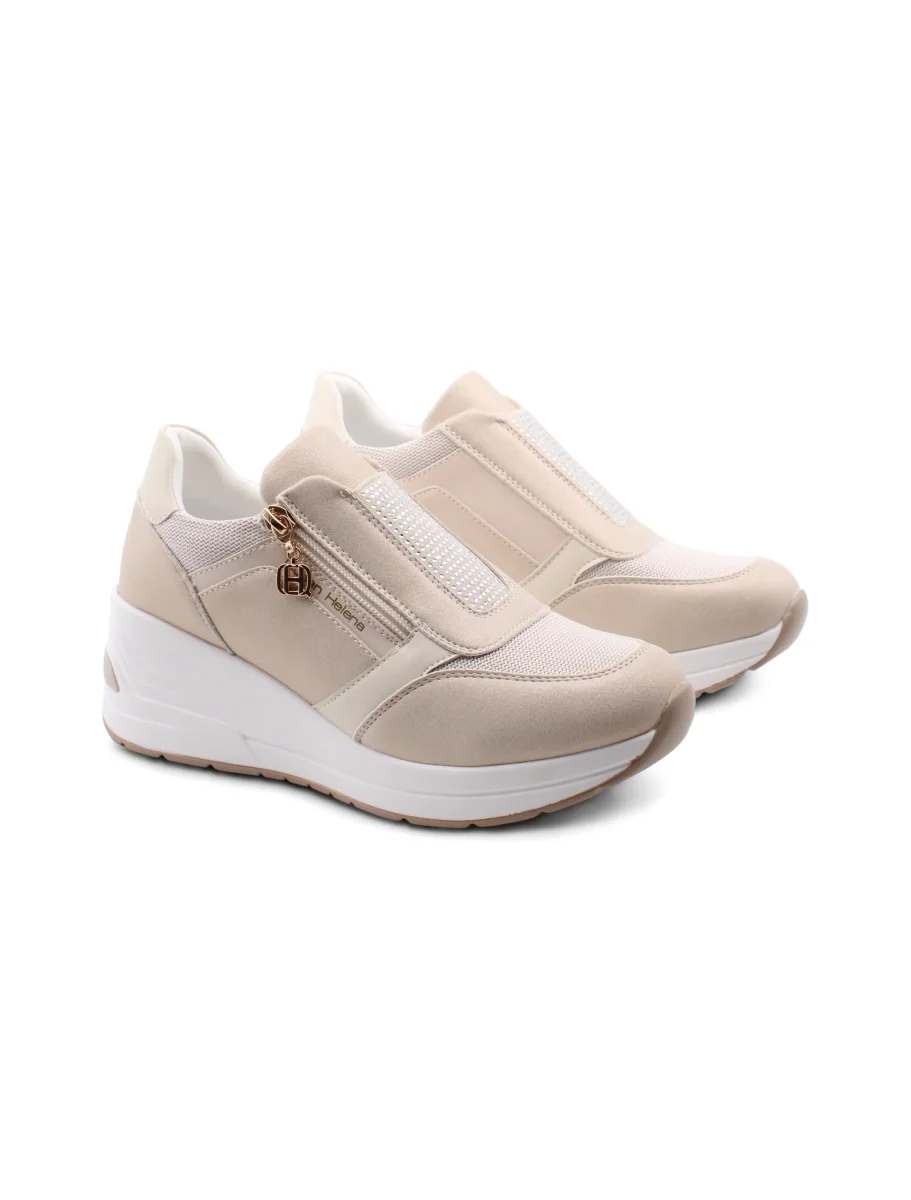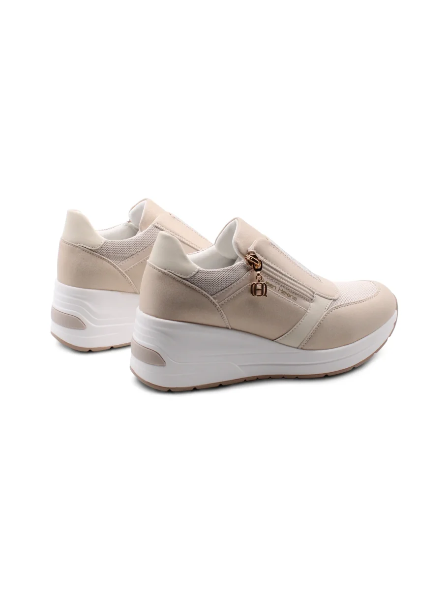 Questa sneaker con zeppa da 6,5 cm è pensata per chi non vuole rinunciare al comfort senza perdere un tocco di stile. La fodera in tessuto assicura una sensazione morbida e traspirante che accompagna il piede durante tutto il giorno. Il plantare removibile offre la libertà di personalizzare la calzata o di inserirne uno proprio, per adattarsi alle tue esigenze. Il sottopiede, anch’esso in tessuto, completa l’esperienza di comfort garantendo freschezza e morbidezza ad ogni passo. Il plateau di 2,5 cm contribuisce ad ammortizzare la camminata, diminuendo l’impatto senza rinunciare ad un look moderno e femminile. Perfetta per chi cerca una scarpa pratica ma con quel piccolo extra che fa la differenza.