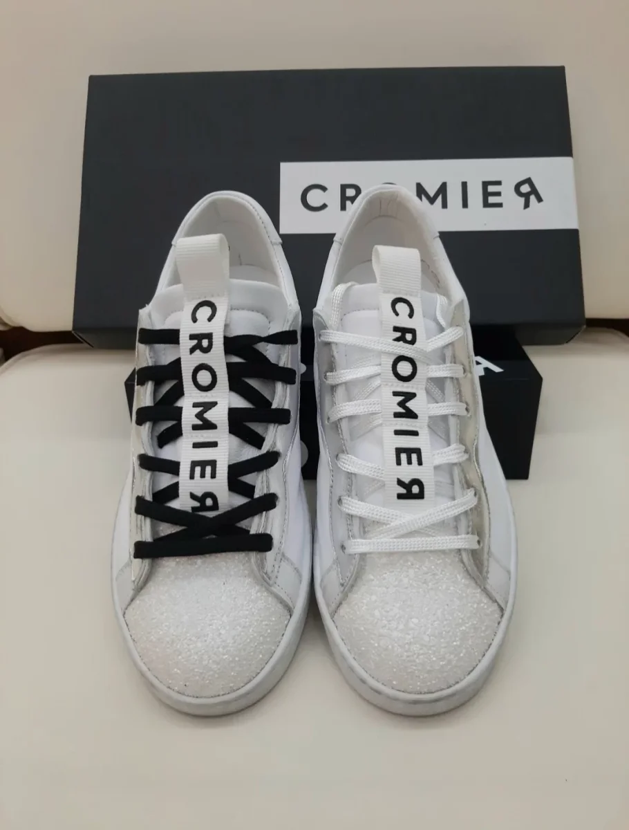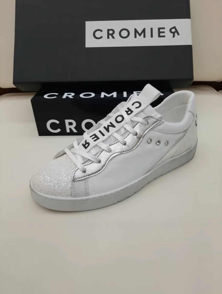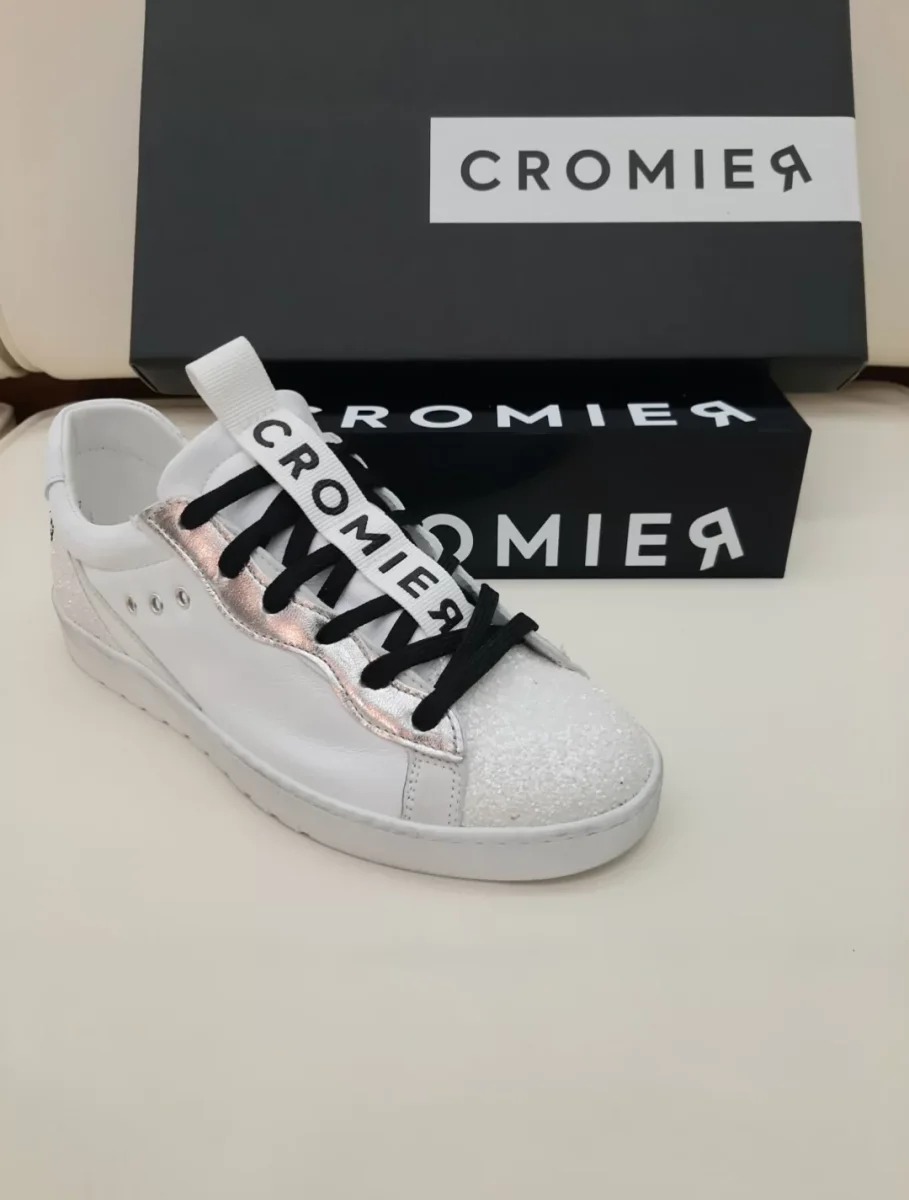 Sneaker in pelle e glitter con inserti in pelle laminata.