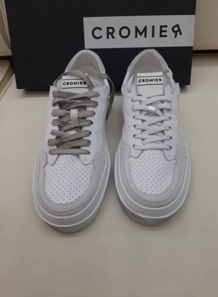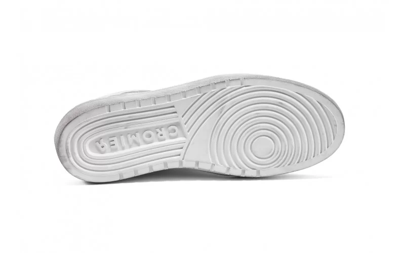 Lacci piatti in cotone e suola in gomma. Laccio bianco con effetto vintage presente in scatola.
